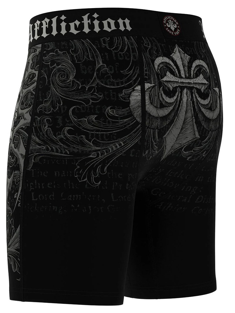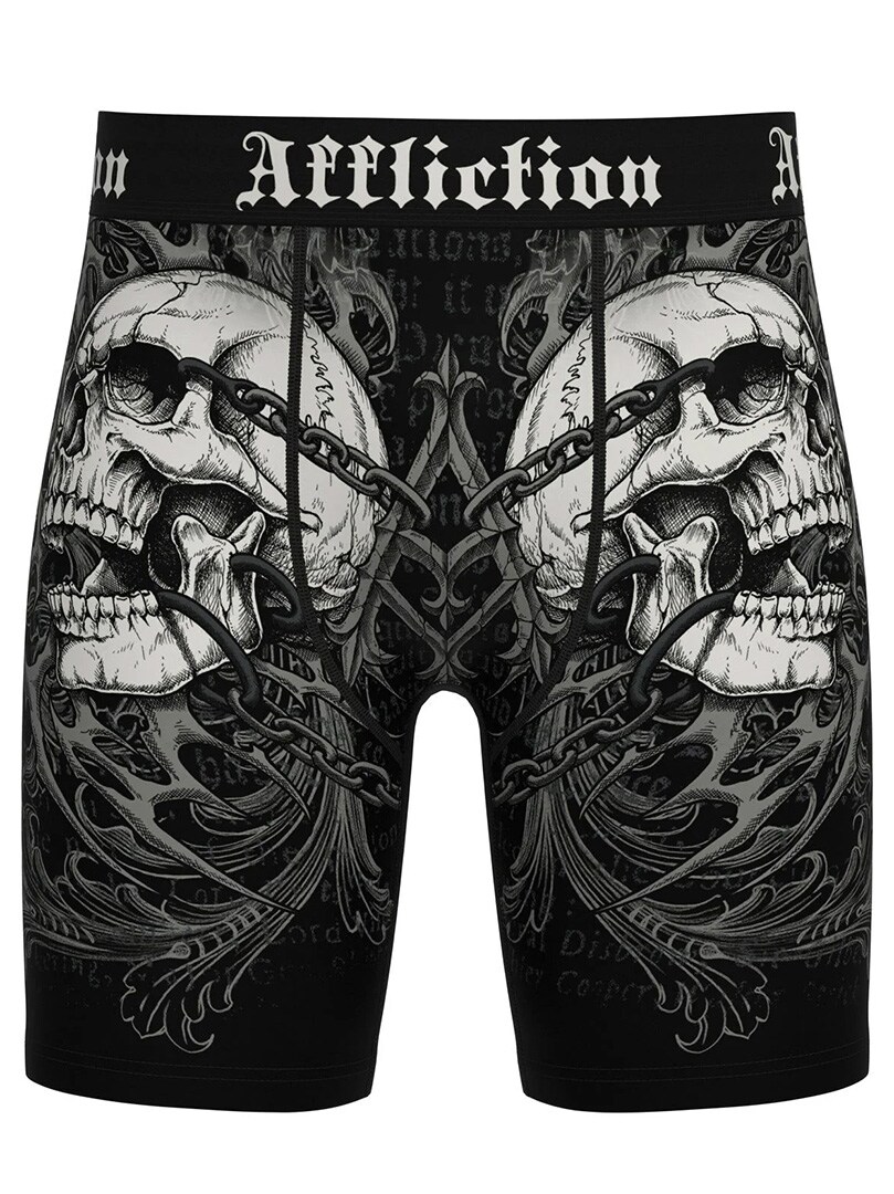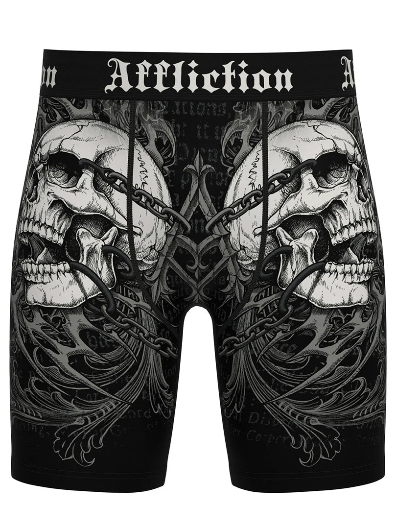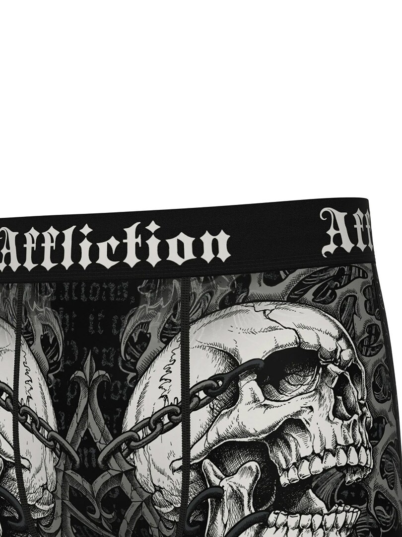 Bokserit pääkallokuviolla, klassista Affliction-tyyliä. Valmistettu pehmeästä ja joustavasta materiaalista, joka takaa erinomaisen mukavuuden koko päiväksi. Leveä vyötärönauha Affliction-logolla pitää ne napakasti paikoillaan ja viimeistelee ilmeen. Täydelliset sinulle, joka haluat alusvaatteet, jotka erottuvat yhtä paljon kuin muukin asusi.