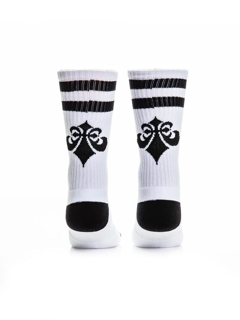 Anna asullesi itsevarma ilme näillä valkoisilla, keskivartisilla ribatuilla sukilla. Ribbineulotut varret takaavat mukavan ja tukevan istuvuuden, joka pysyy paikallaan koko päivän. Sukissa on logot edessä ja takana. Täydelliset arkeen, treeniin ja streetwear-tyyliin.