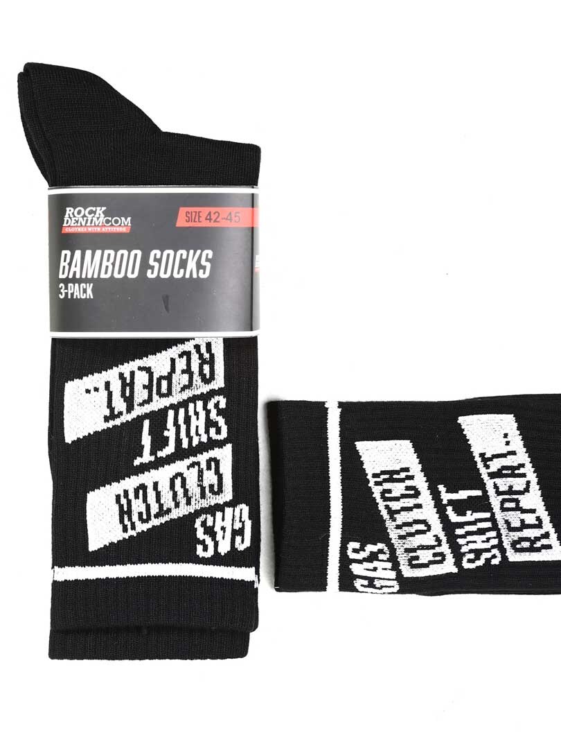 3 kpl pakkaus huippulaatuisia bambusukkia tekstillä "Gas, clutch, shift, repeat"