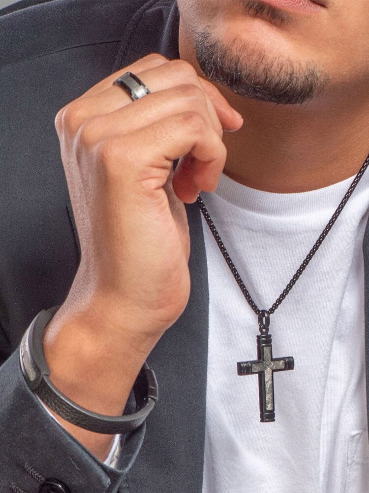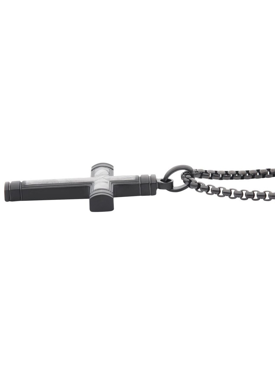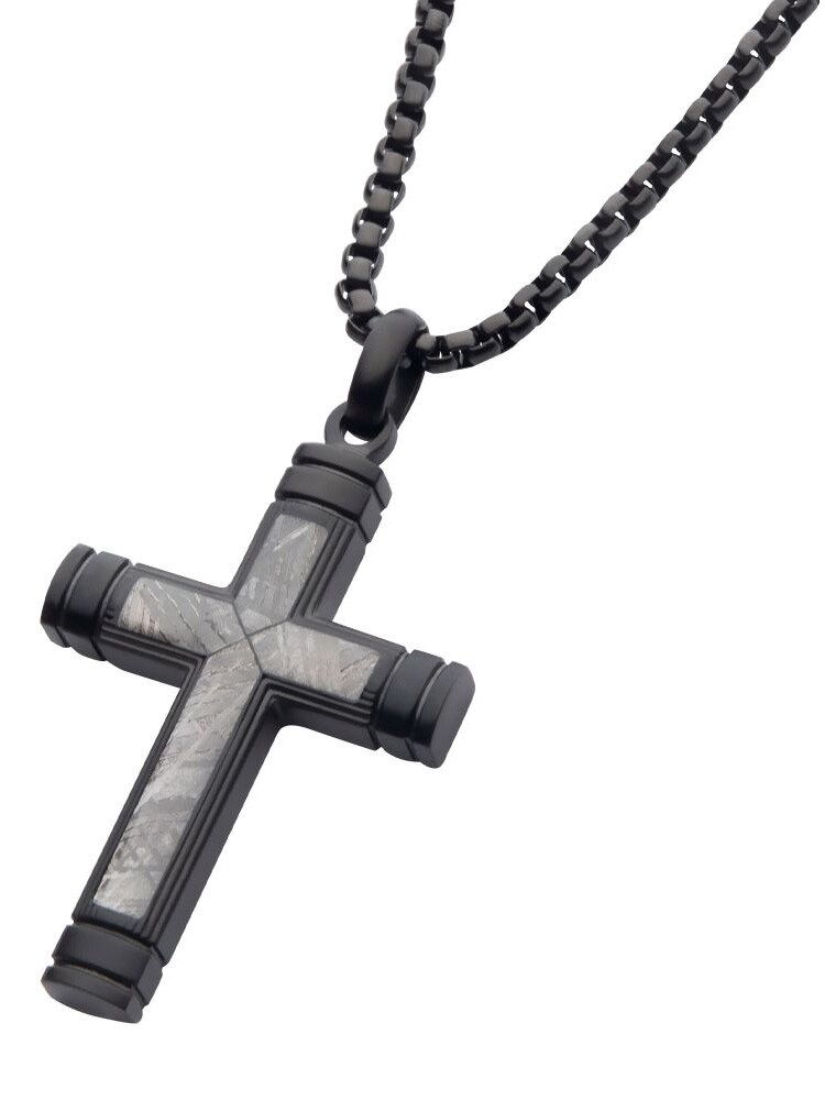 Kaulakoru, jossa musta IP-pinnoite ja meteoriittikoristeinen riipus. Valmistettu ruostumattomasta teräksestä.