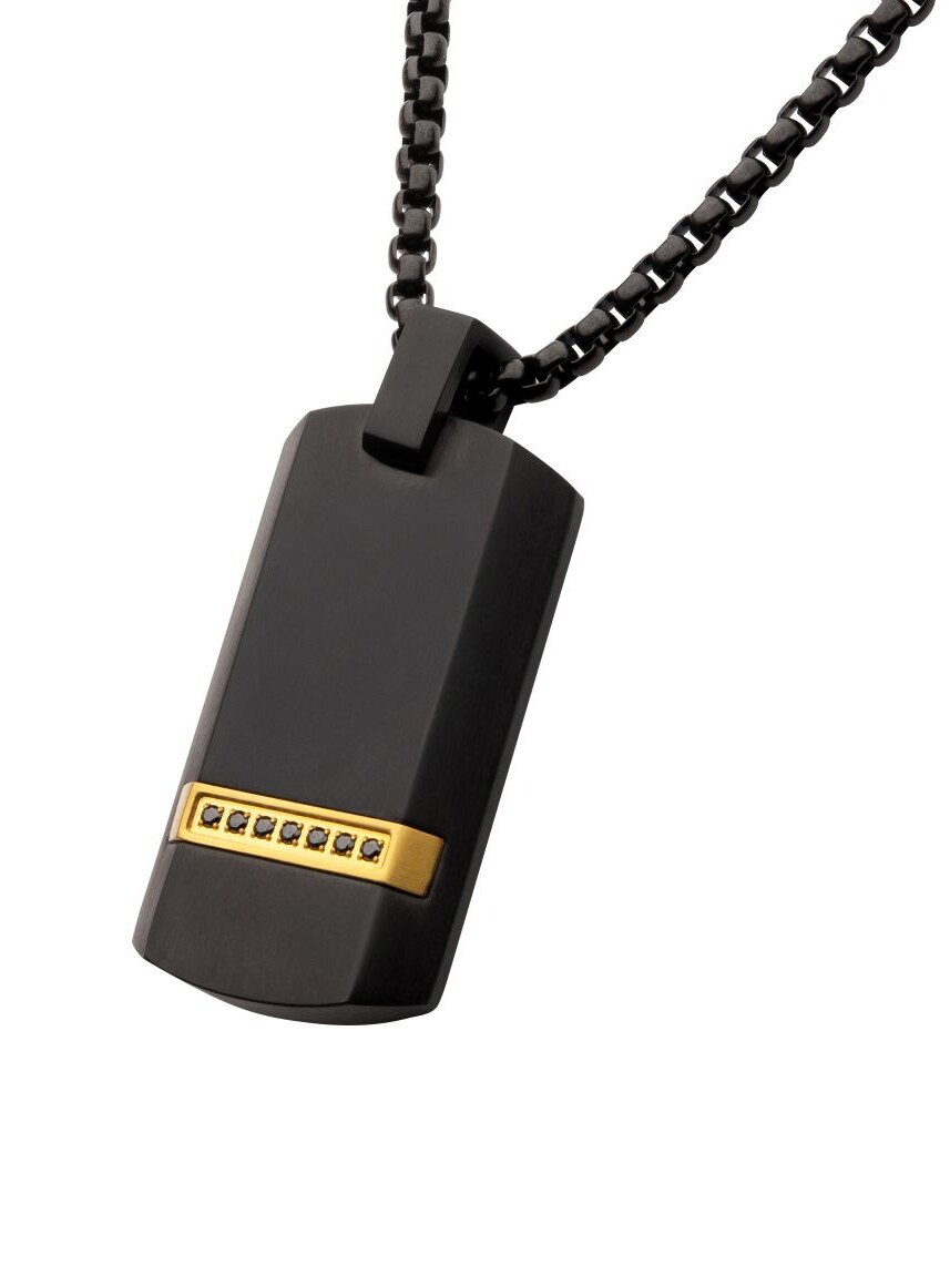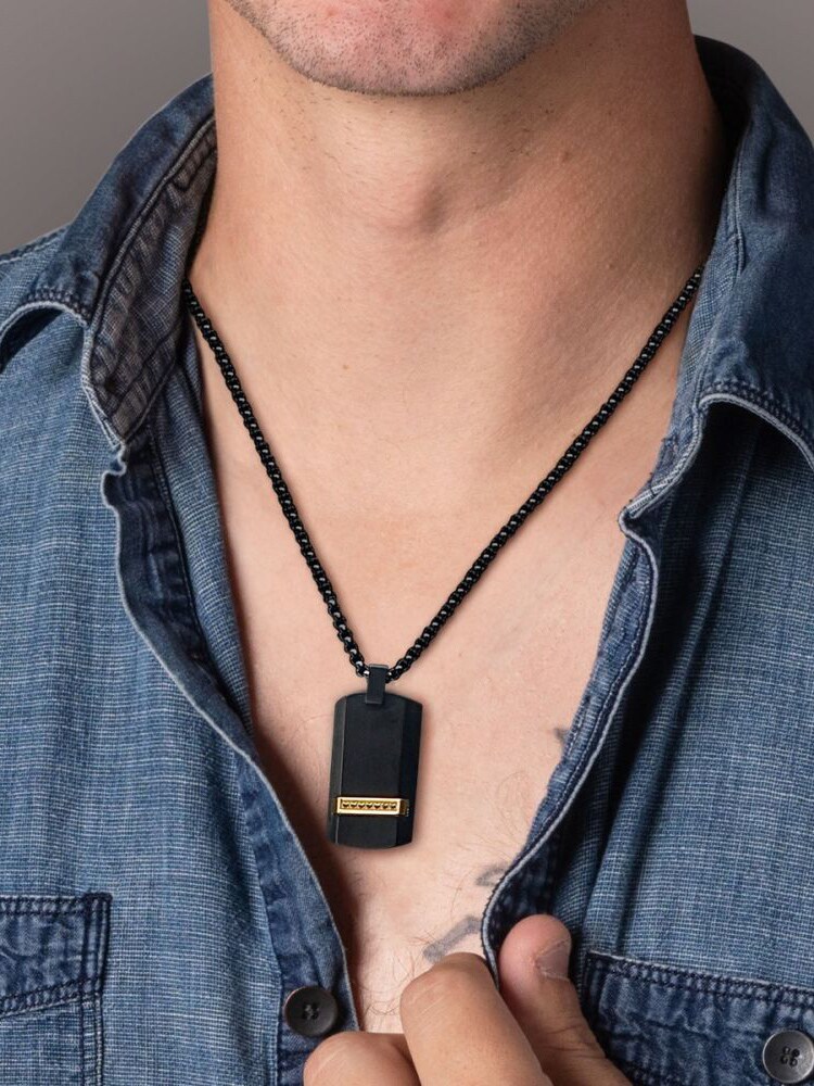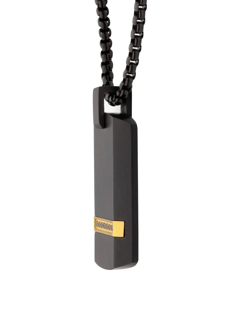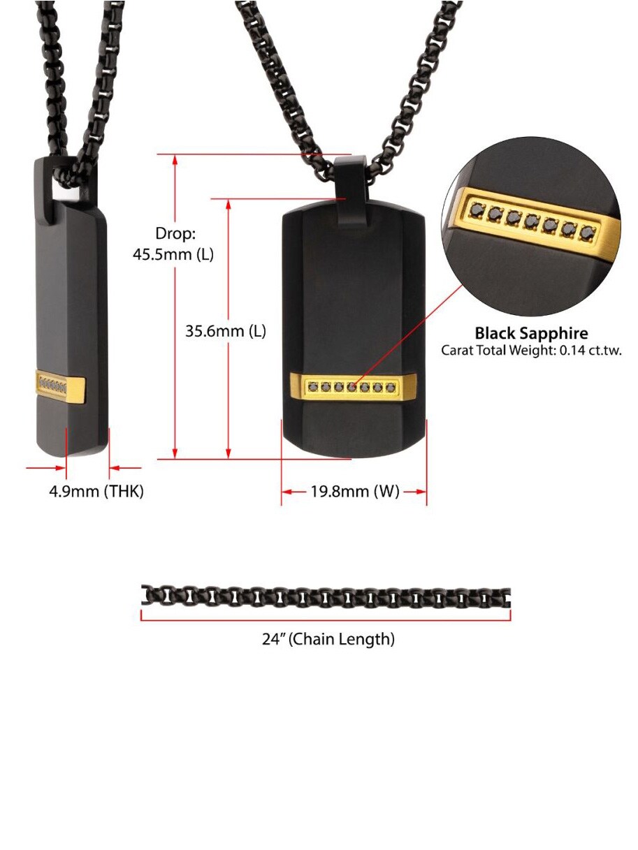 Ruostumattomasta teräksestä valmistettu kaulaketju mustalla IP-pinnoitteella. Korun riipuksessa on safiiri ja sen pinta on mattapintainen.