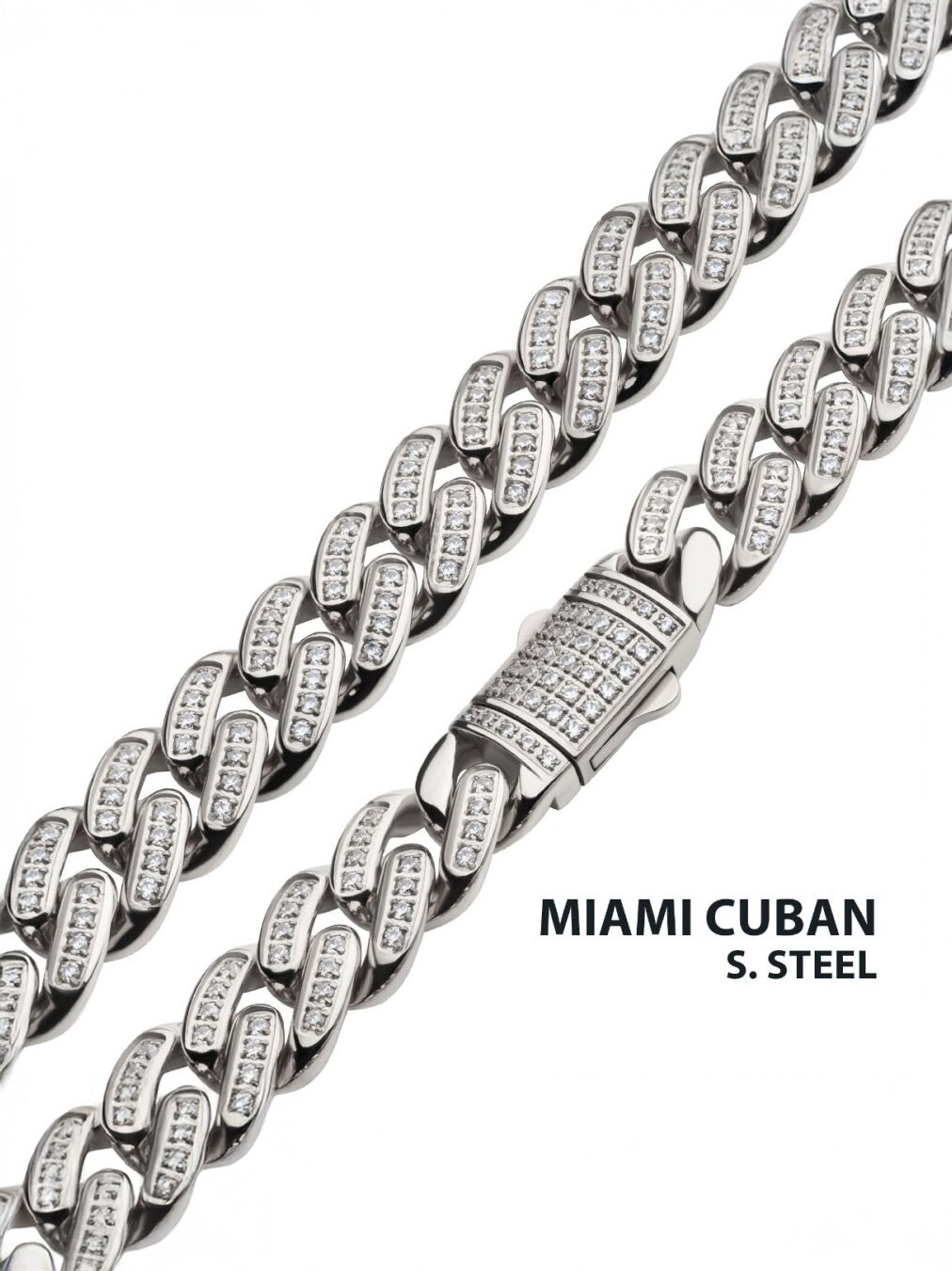 Inoxin Cuban-ketju ruostumattomasta teräksestä. Ketjua koristavat kirkkaat kuutiomaiset zirkoniitit, jotka kimaltelevat tyylikkäästi jokaisella liikkeellä. Valmistettu ruostumattomasta teräksestä ja sulkeutuu laatikkolukolla.