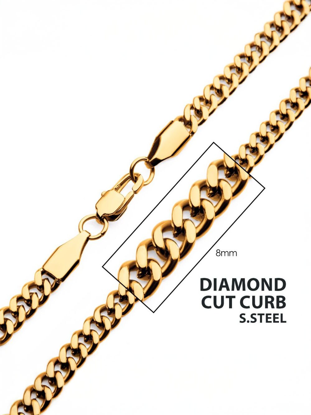 Inoxin Curb-ketju 18K pinnoitteella. Korussa on timanttihiottu pinta ja se on valmistettu ruostumattomasta teräksestä. Kestävä ja lujatekoinen, sopii erinomaisesti arkikäyttöön tai erityistilaisuuksiin.