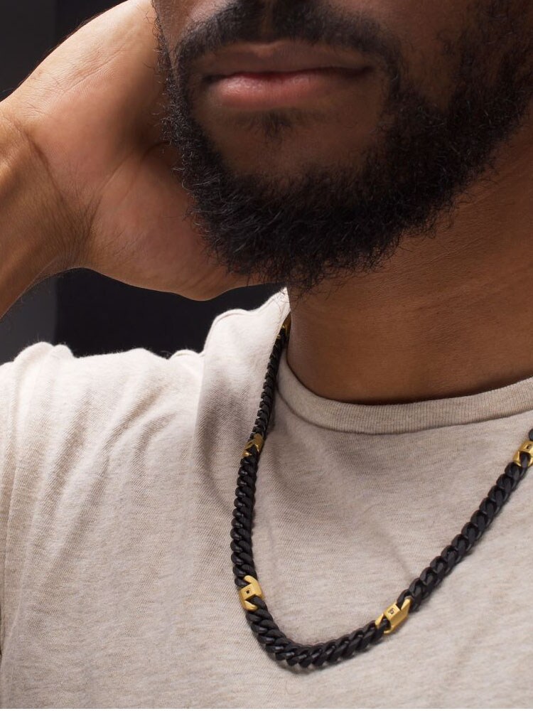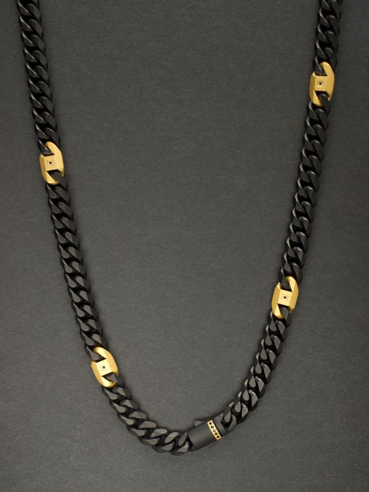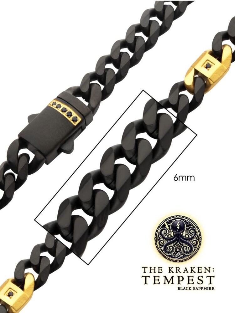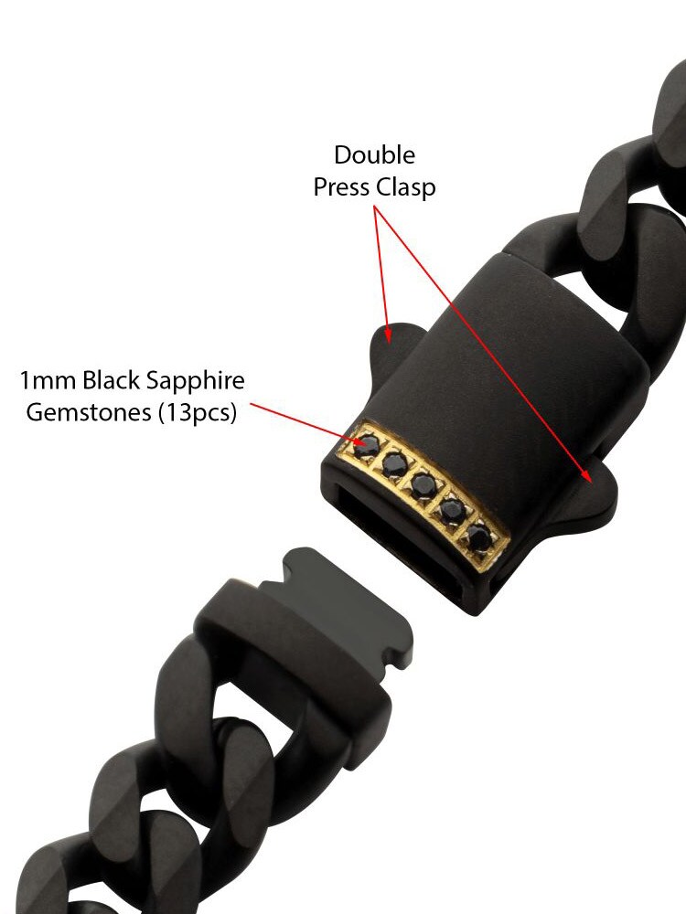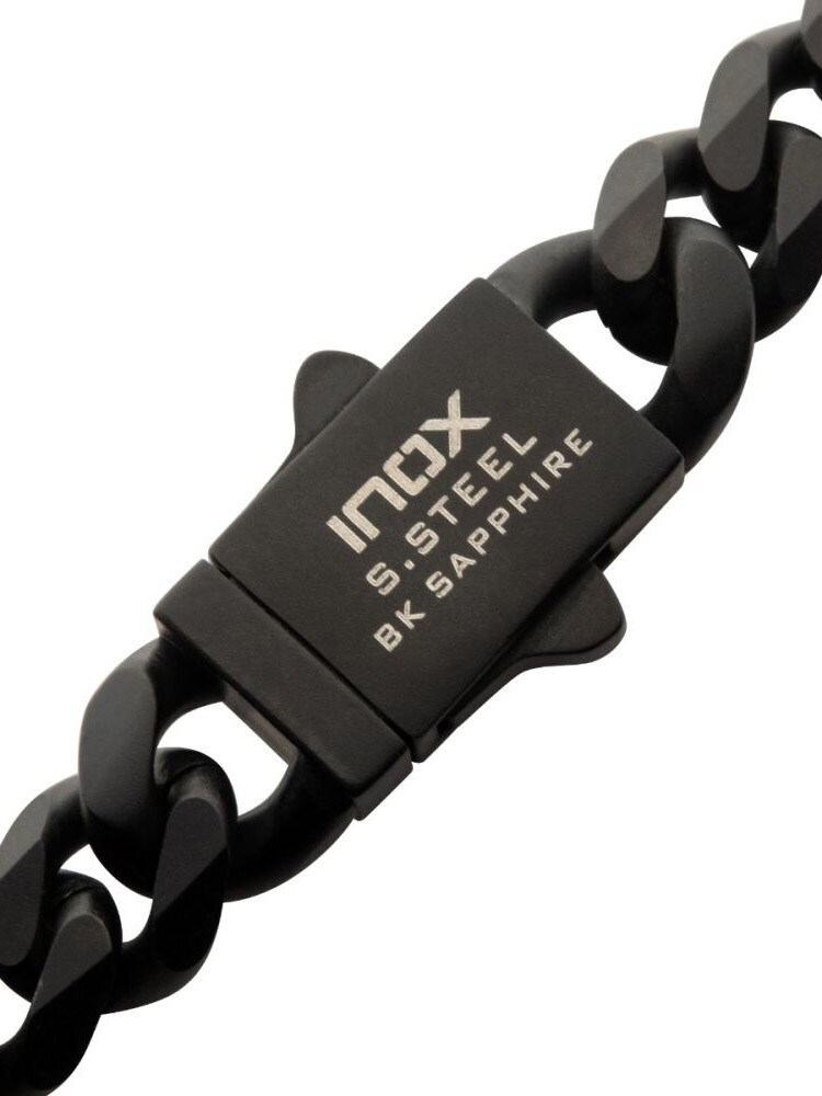 Inoxin Cuban-ketju mustalla IP-pinnoitteella ja mattaviimeistelyllä. Lukko on koristeltu mustilla safiirikivillä, jotka on upotettu eksklusiiviseen 18 karaatin kullattuun kaksoisliukulukkoon, joka tarjoaa sekä turvallisuutta että ylellisen yksityiskohdan.