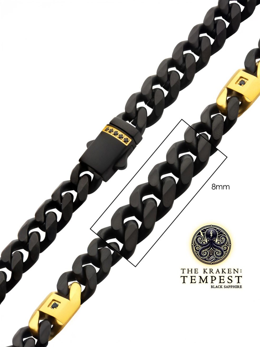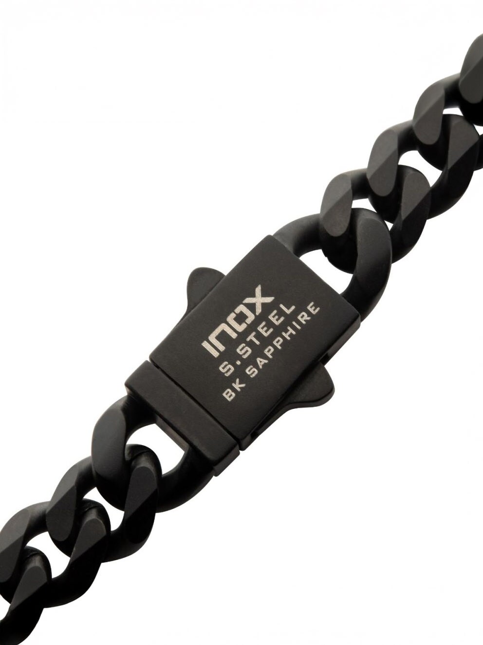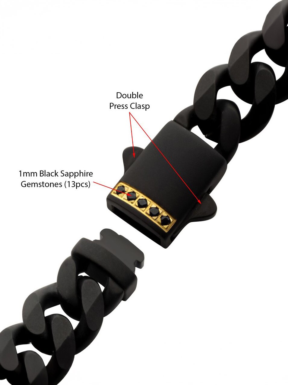 Inoxin Cuban-ketju mustalla IP-pinnoitteella ja mattaviimeistelyllä. Lukko on koristeltu mustilla safiirikivillä, jotka on upotettu eksklusiiviseen 18 karaatin kullattuun kaksoisliukulukkoon, joka tarjoaa sekä turvallisuutta että ylellisen yksityiskohdan.