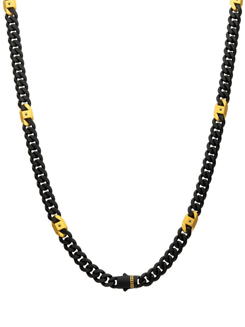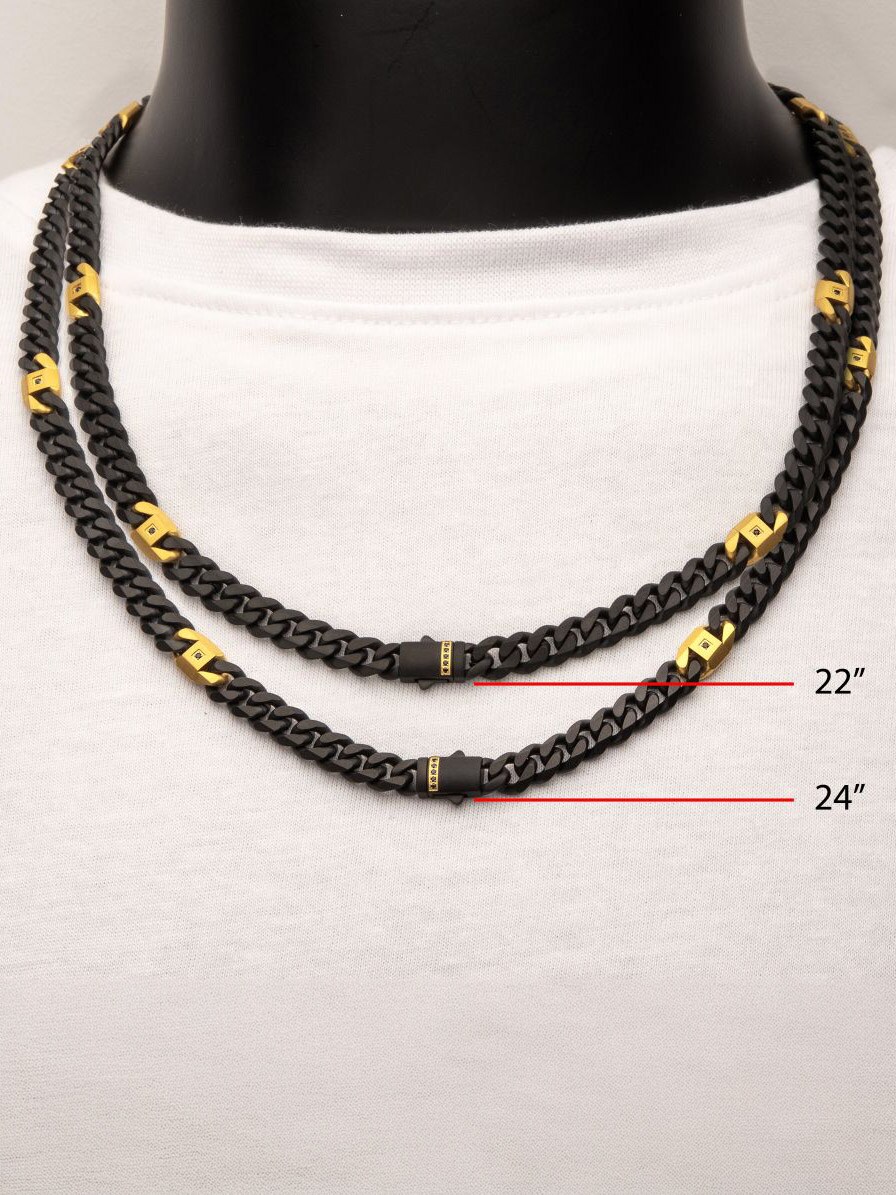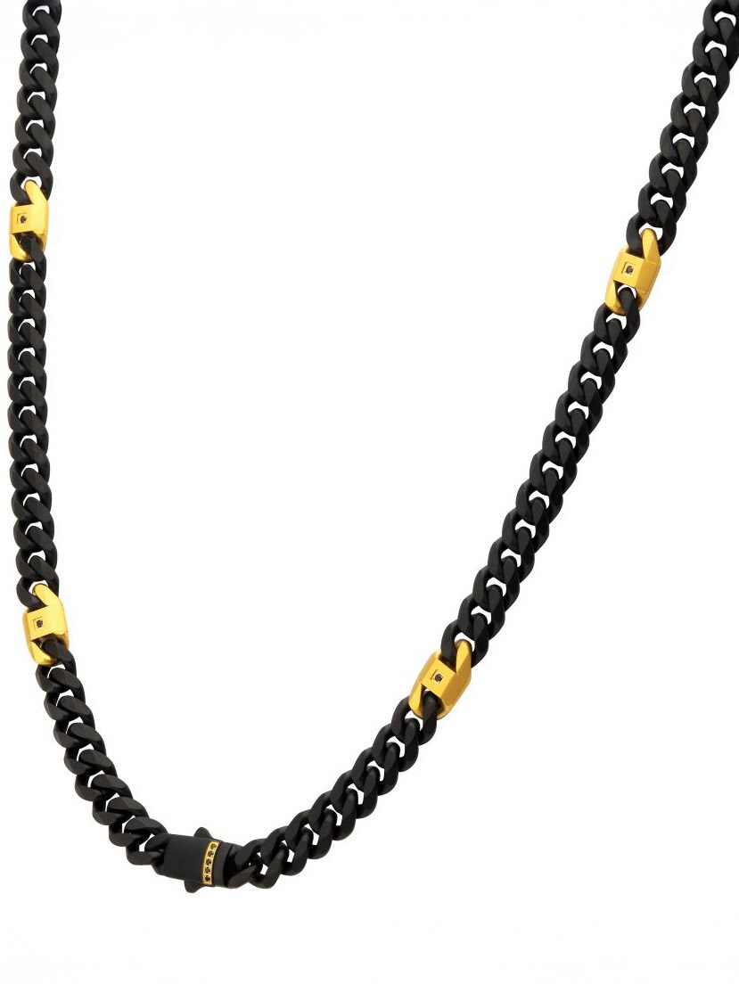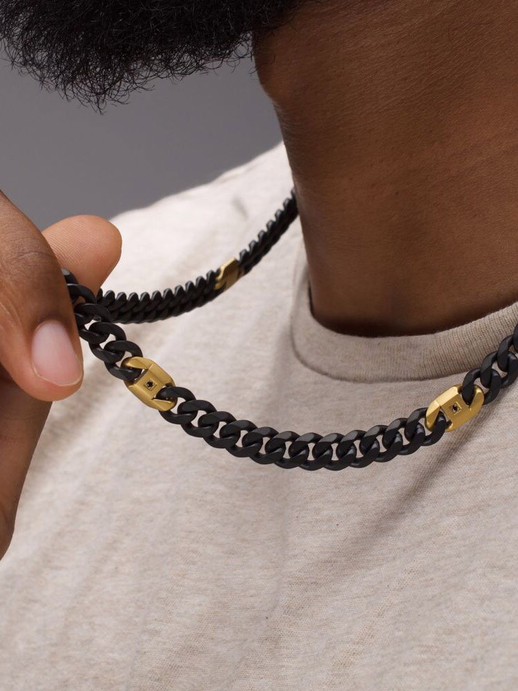 Inoxin Cuban-ketju mustalla IP-pinnoitteella ja mattaviimeistelyllä. Lukko on koristeltu mustilla safiirikivillä, jotka on upotettu eksklusiiviseen 18 karaatin kullattuun kaksoisliukulukkoon, joka tarjoaa sekä turvallisuutta että ylellisen yksityiskohdan.