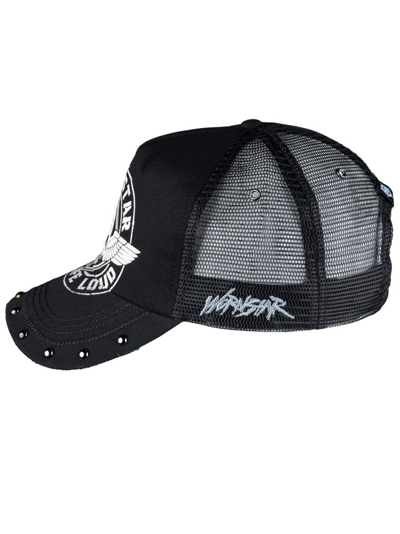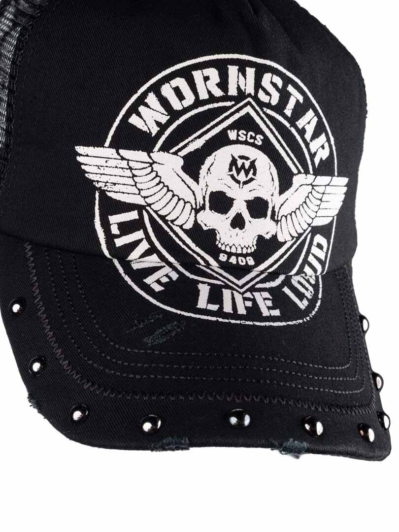 Wornstar Battalion Trucker Lippis mustana niiteillä ja "Live Life Loud" -motiivilla on statement-lippis modernille kapinalliselle.
