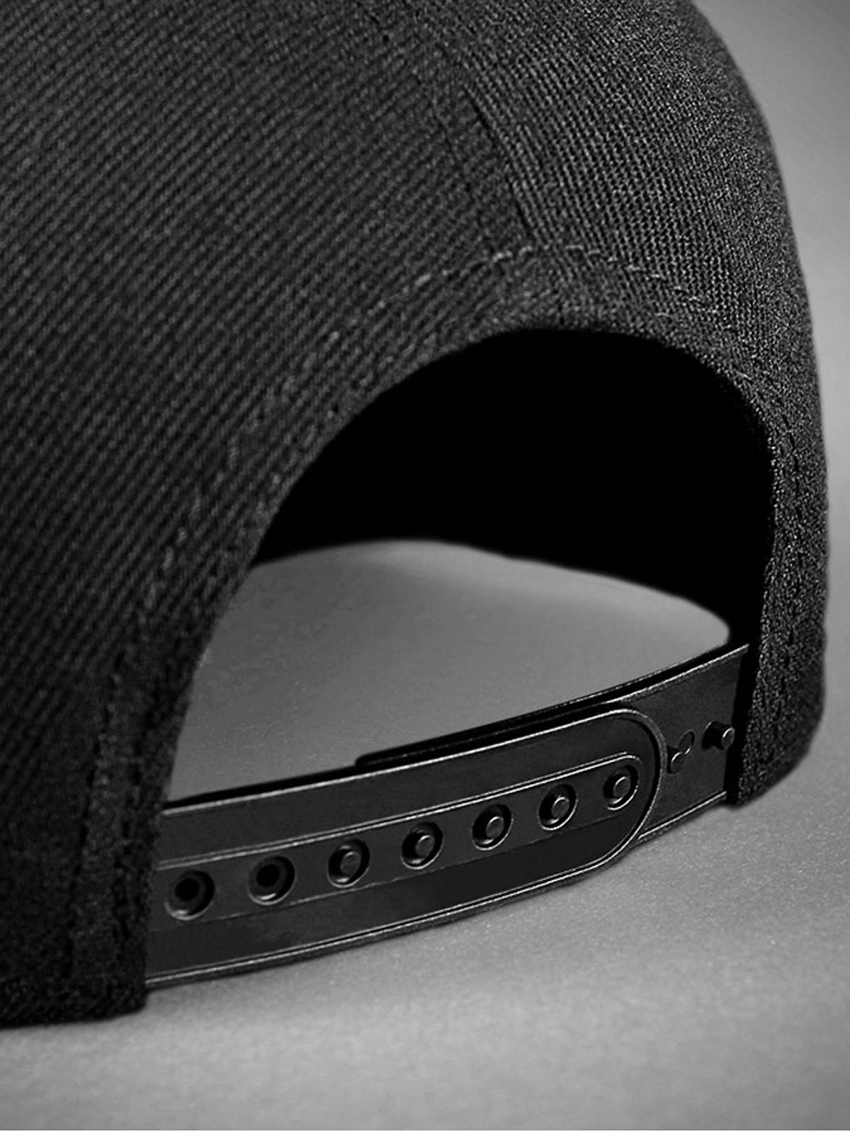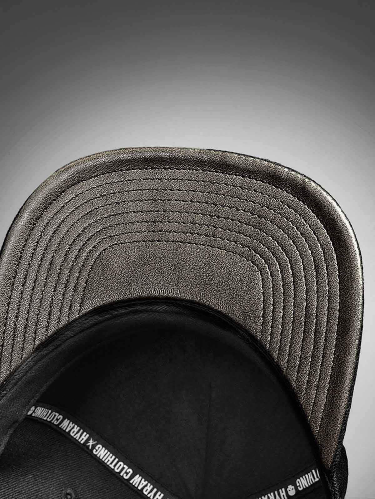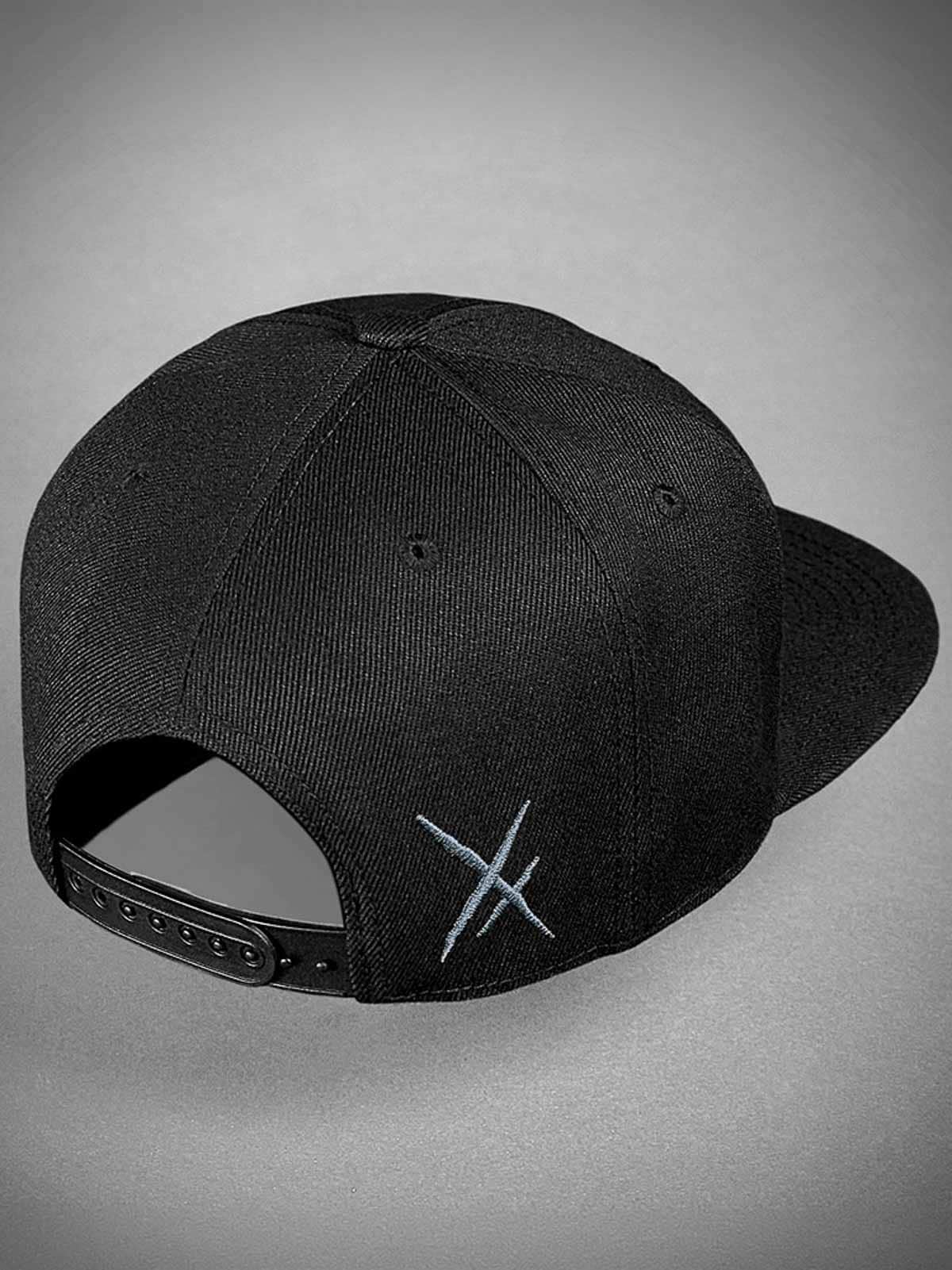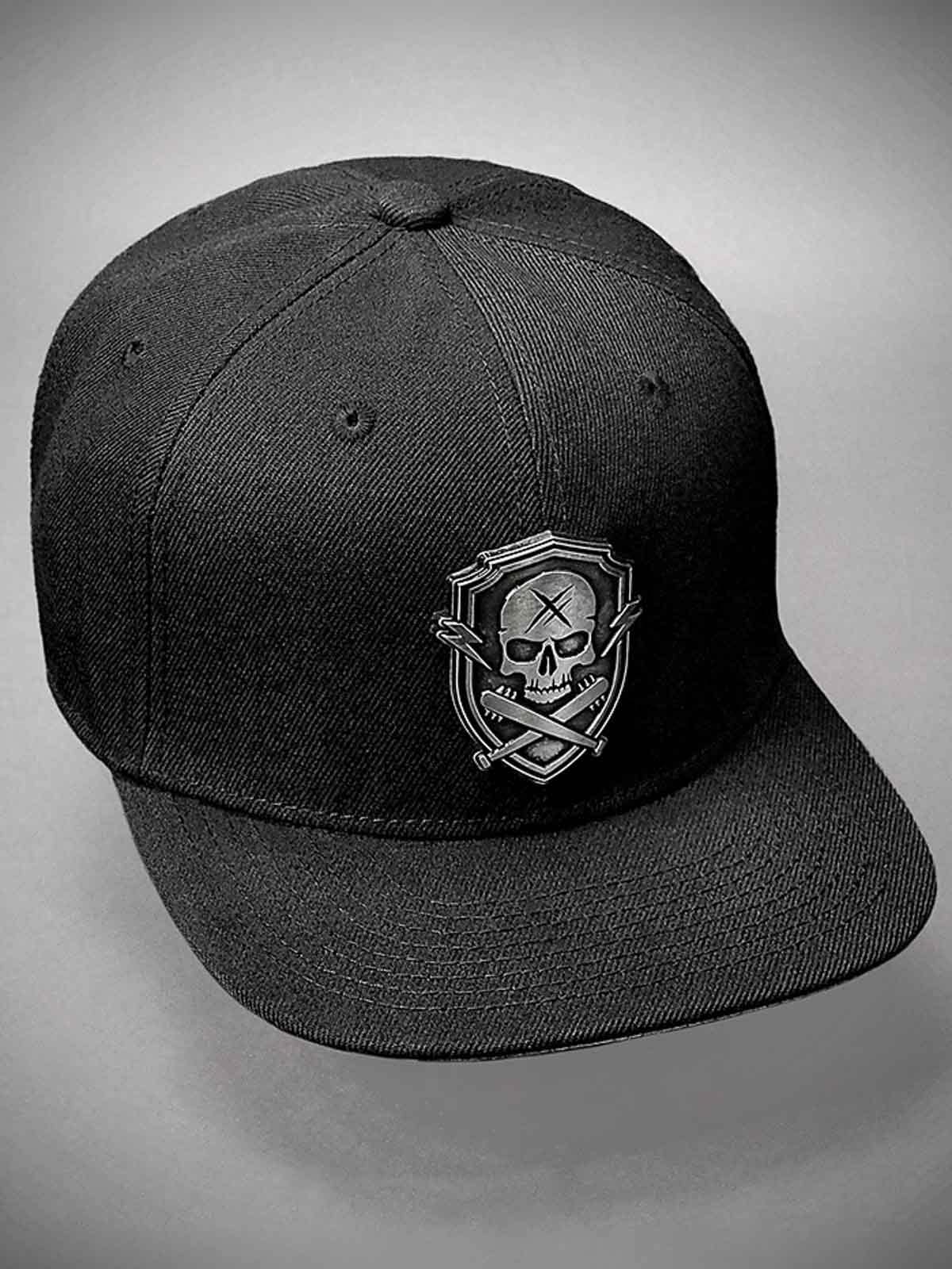 Musta lippalakki snapback-takaosalla ja suoralla lipalla. Koristeena pääkalloaiheinen metallimerkki edessä. Lipan alapuoli on vuorattu keinonahalla.