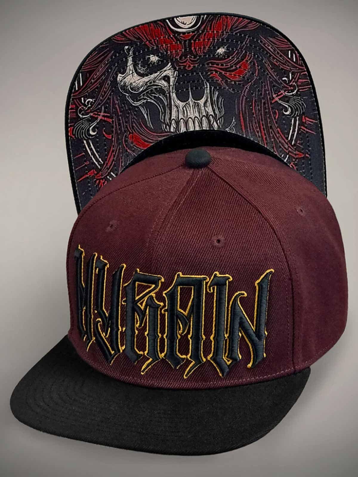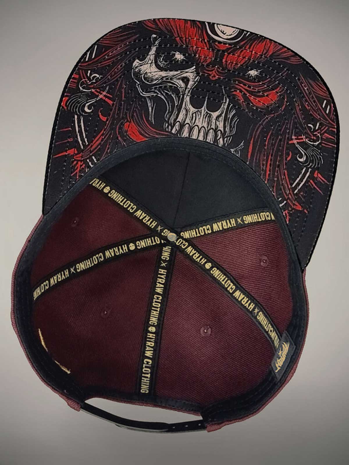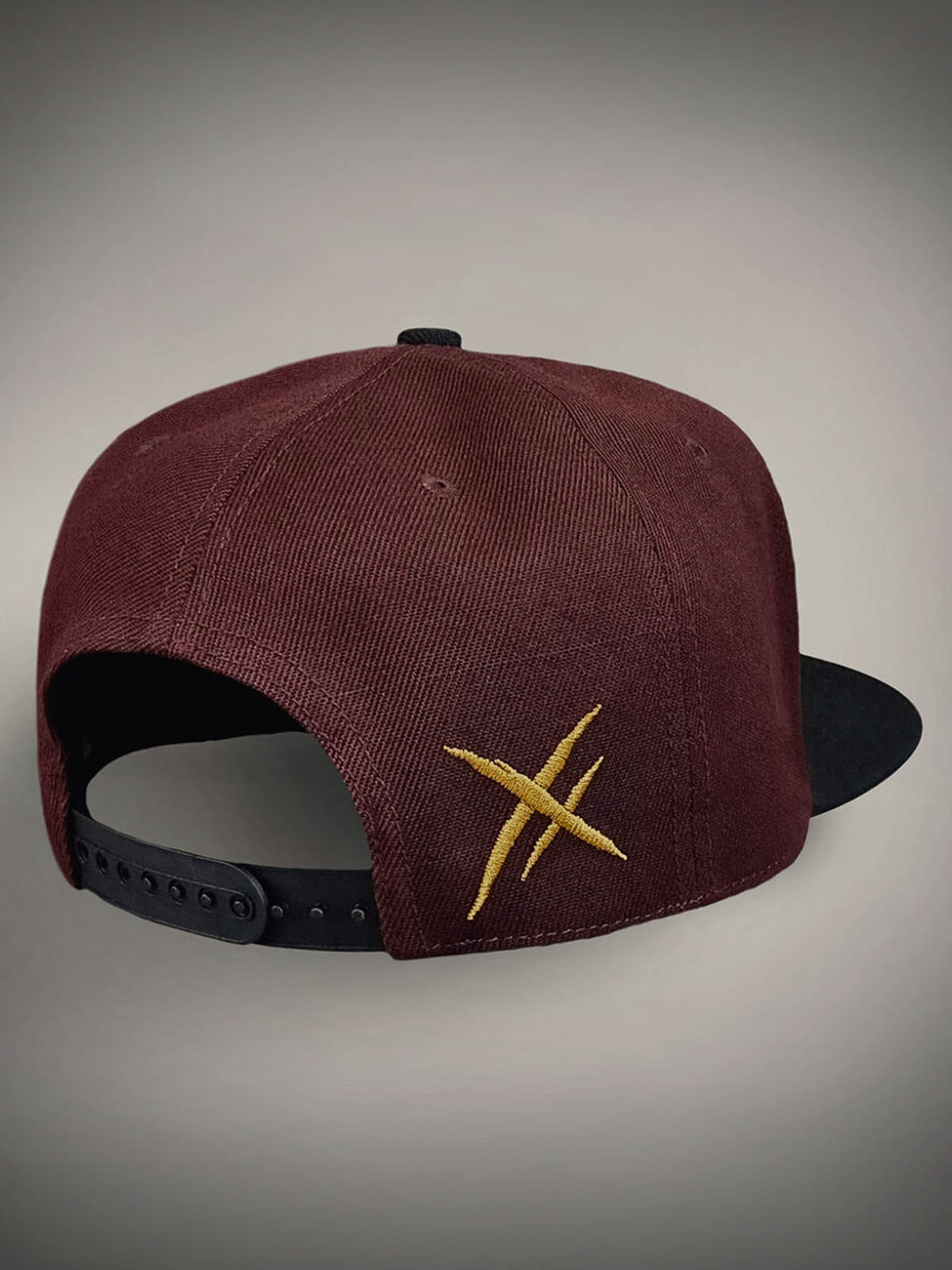 Viininpunainen lippis suoralla lipalla, koristeltu skräddattu logolla mustana ja keltaisena edessä sekä keltaisella brodeeratulla kuviolla takana. Lipan alapuoli on suunniteltu ainutlaatuisella kuviolla, joka antaa lippikselle näyttävän yksityiskohdan.