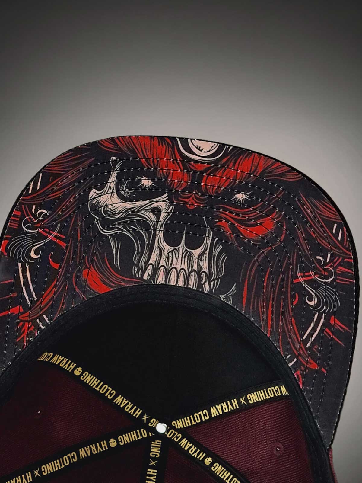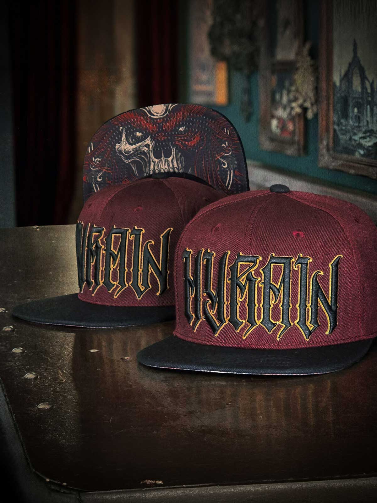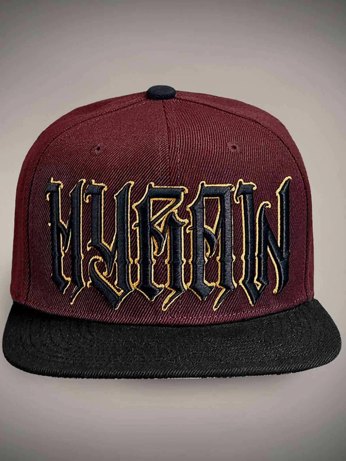 Viininpunainen lippis suoralla lipalla, koristeltu skräddattu logolla mustana ja keltaisena edessä sekä keltaisella brodeeratulla kuviolla takana. Lipan alapuoli on suunniteltu ainutlaatuisella kuviolla, joka antaa lippikselle näyttävän yksityiskohdan.