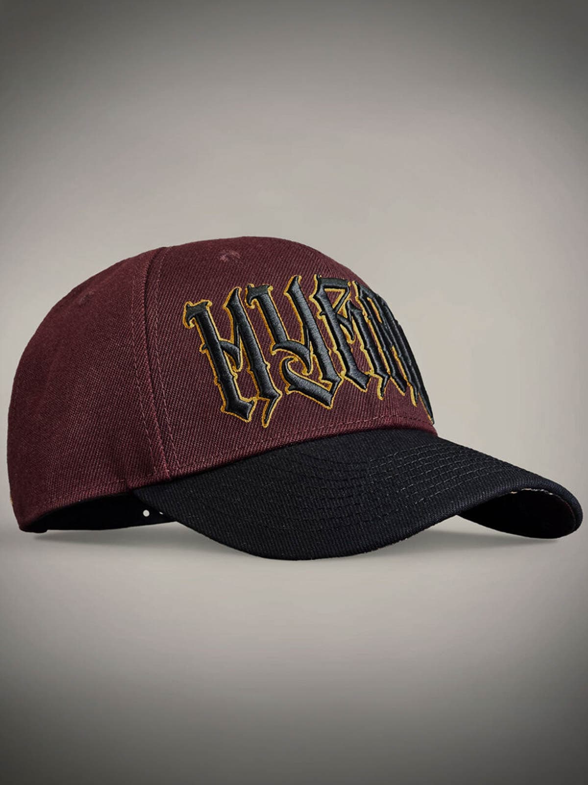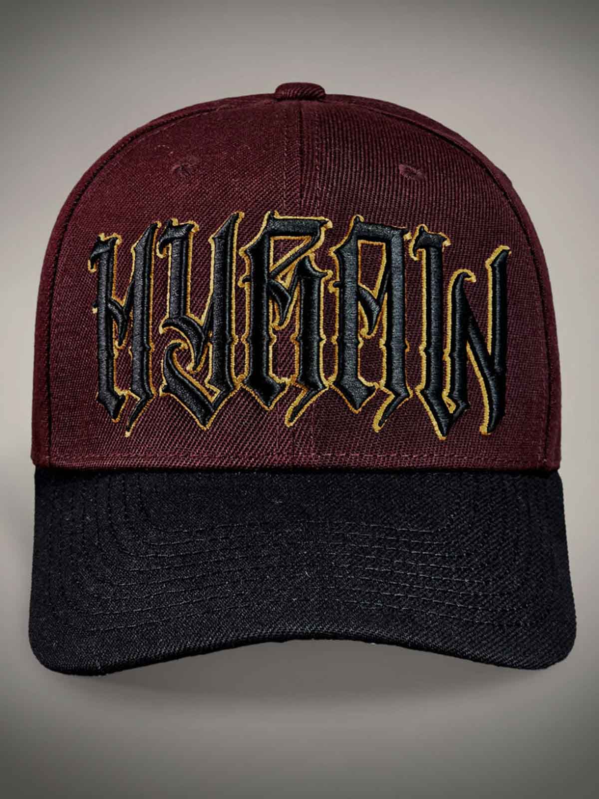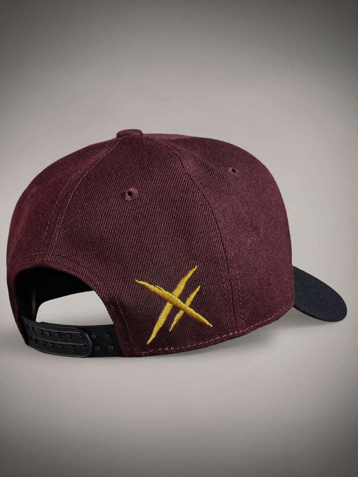 Viininpunainen lippis kaarevalla lipalla, koristeltu skräddattu logolla mustana ja keltaisena edessä sekä keltaisella brodeeratulla kuviolla takana. Lipan alapuoli on suunniteltu ainutlaatuisella kuviolla, joka antaa lippikselle näyttävän yksityiskohdan.