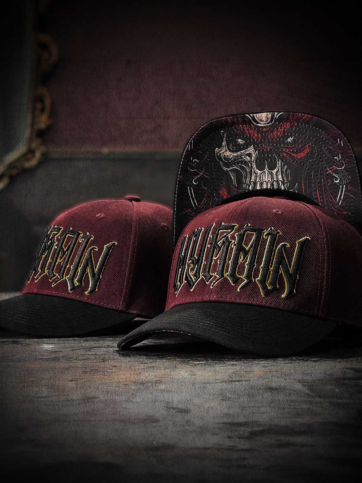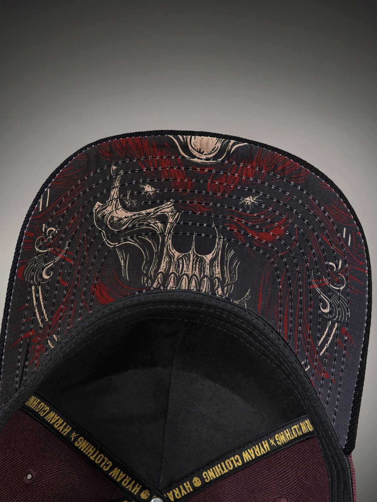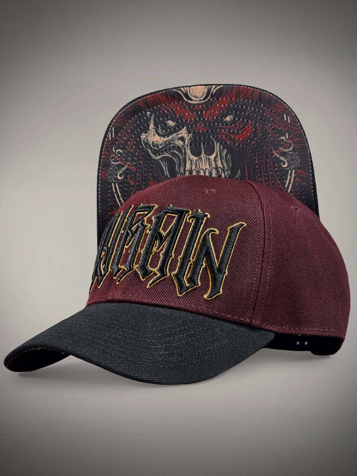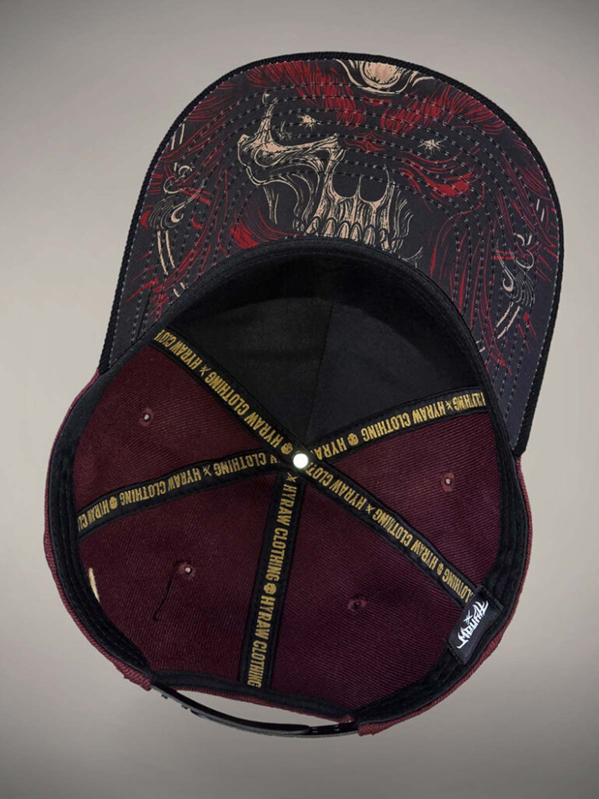 Viininpunainen lippis kaarevalla lipalla, koristeltu skräddattu logolla mustana ja keltaisena edessä sekä keltaisella brodeeratulla kuviolla takana. Lipan alapuoli on suunniteltu ainutlaatuisella kuviolla, joka antaa lippikselle näyttävän yksityiskohdan.