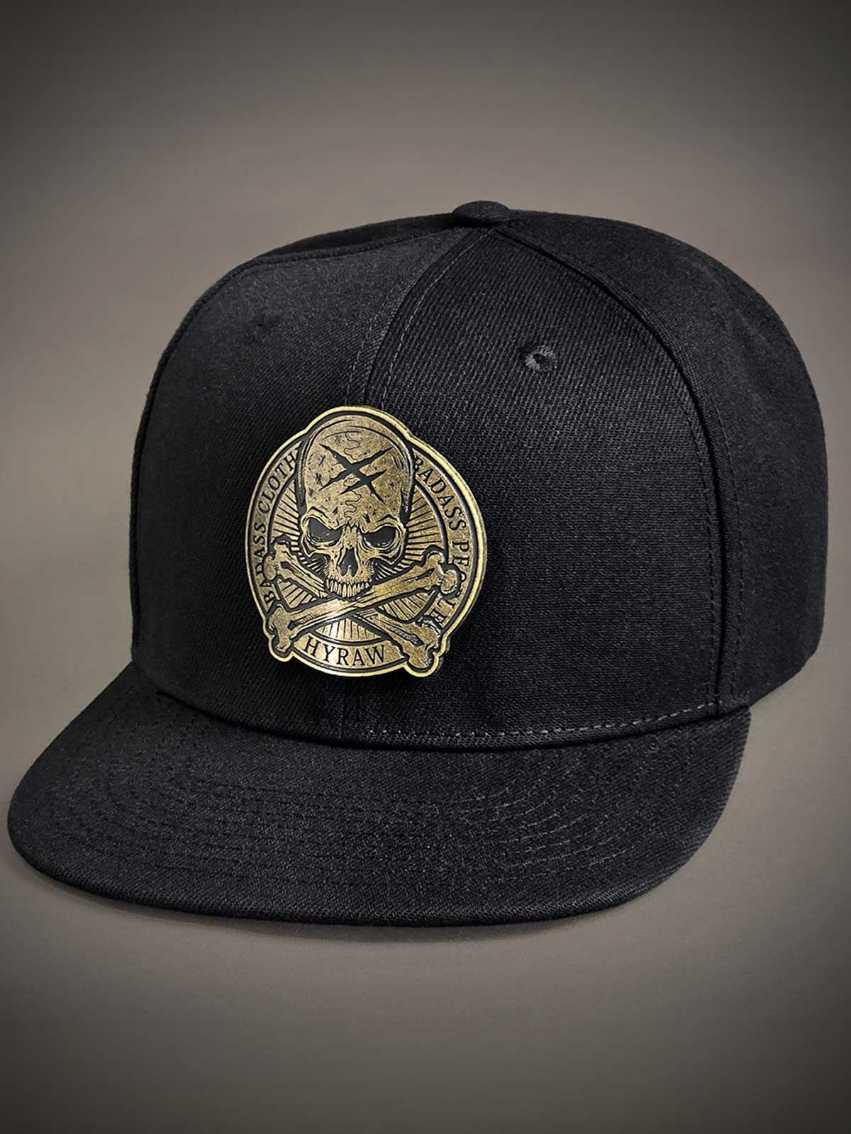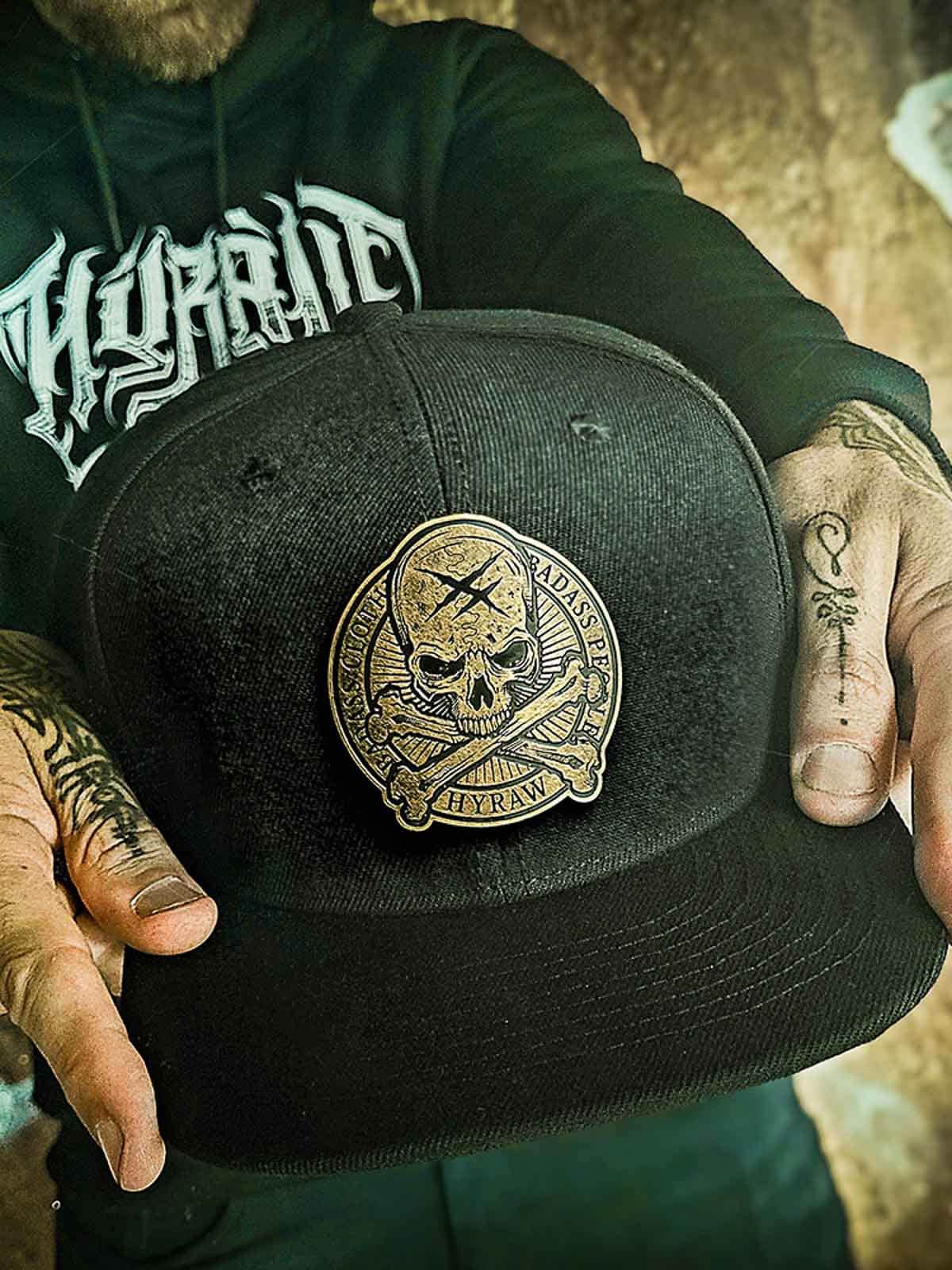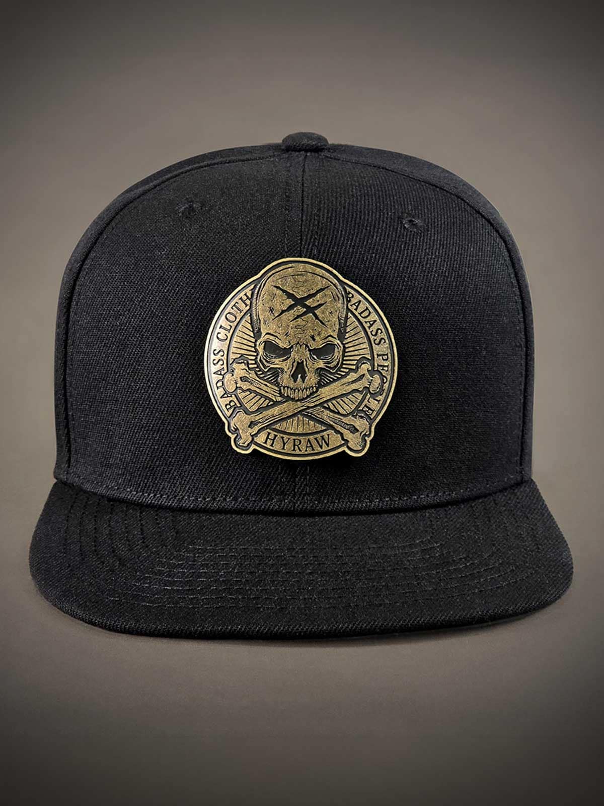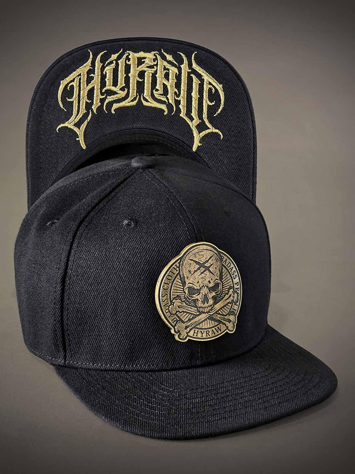 Musta lippalakki snapback-takaosalla ja suoralla lipalla. Koristeena pääkalloaiheinen metallimerkki edessä. Lipan alapuoli on suunniteltu brodeeratulla logolla.