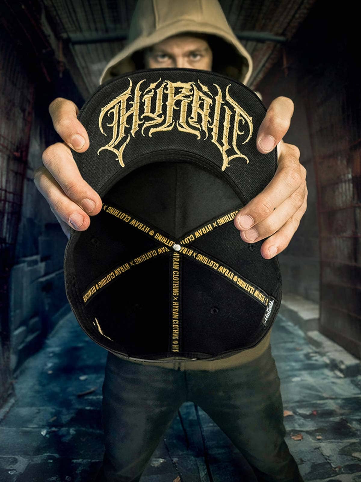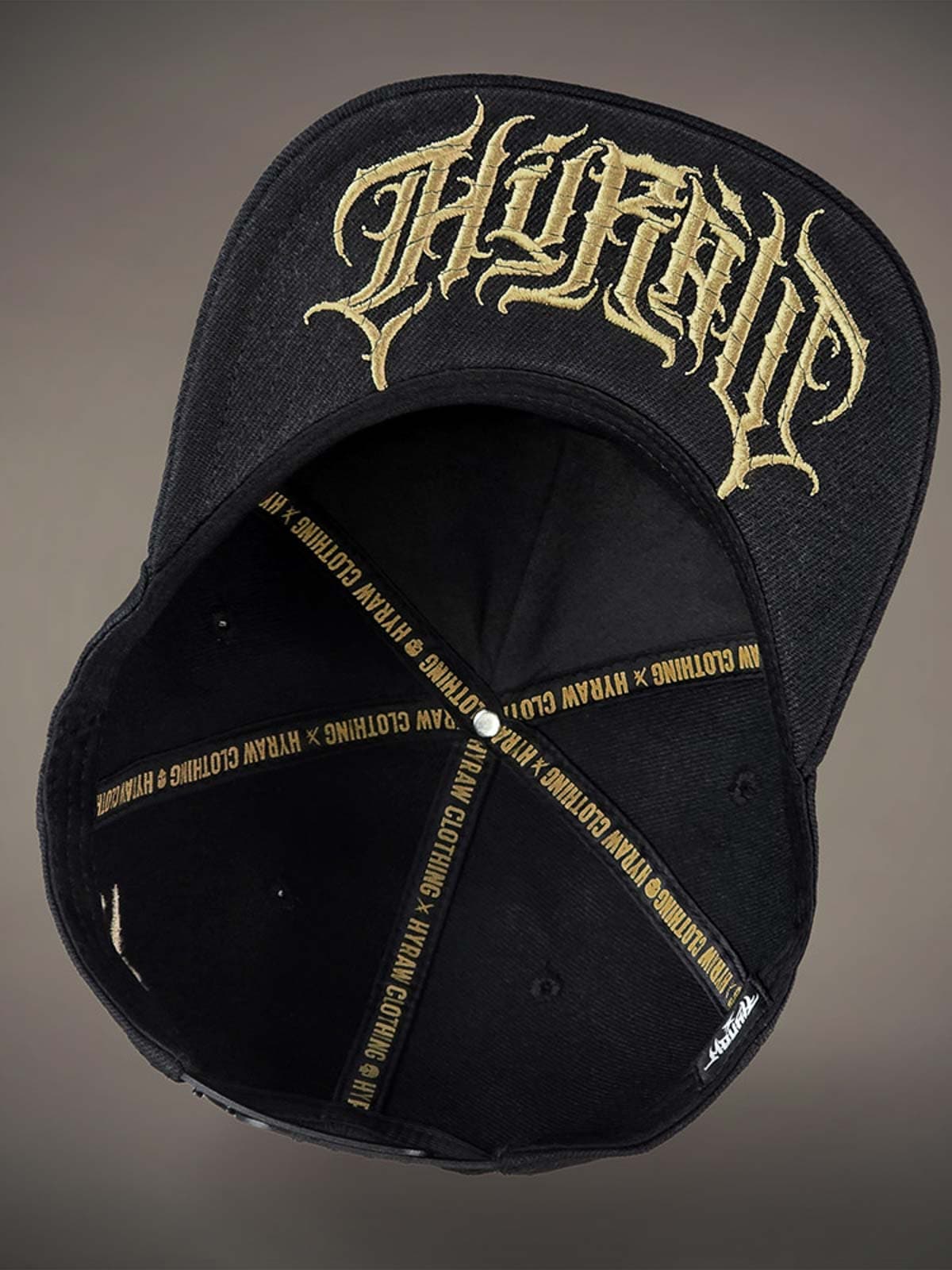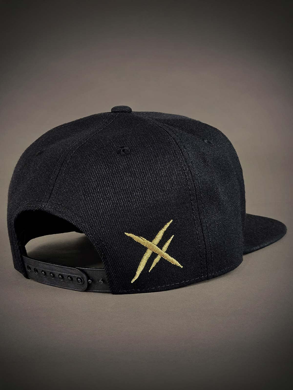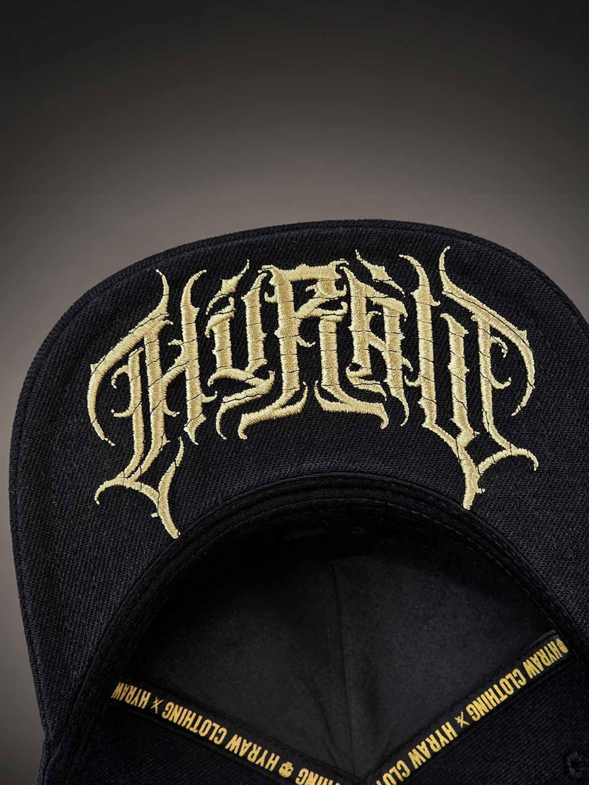 Musta lippalakki snapback-takaosalla ja suoralla lipalla. Koristeena pääkalloaiheinen metallimerkki edessä. Lipan alapuoli on suunniteltu brodeeratulla logolla.