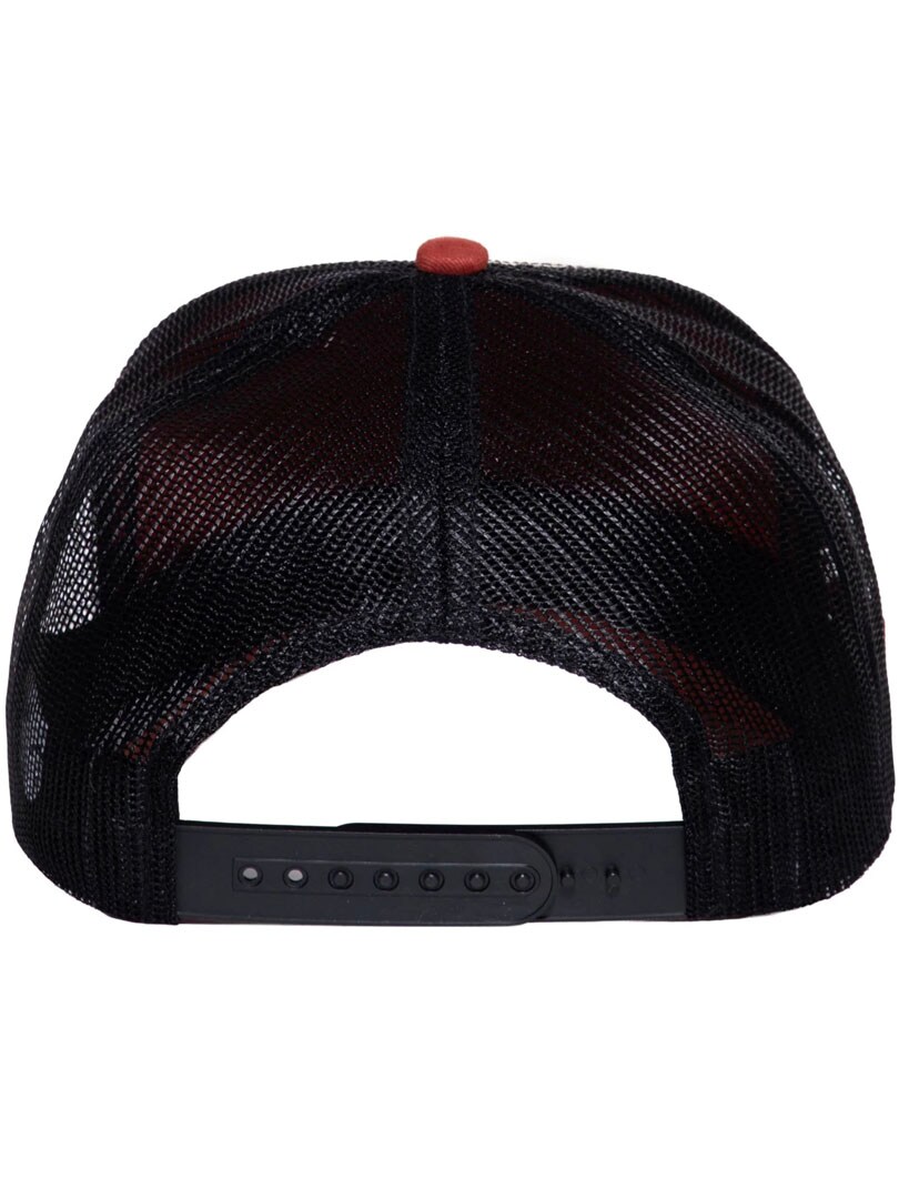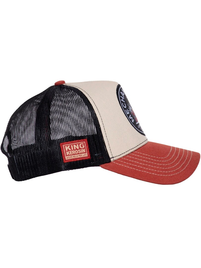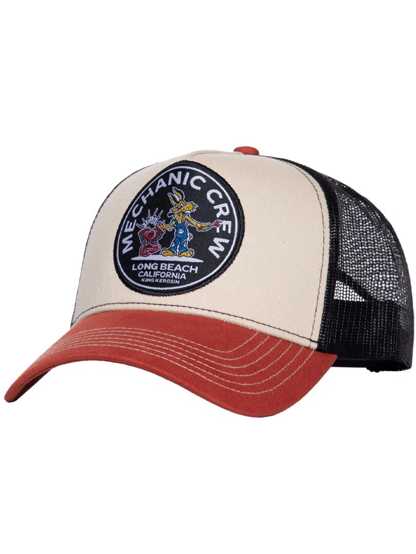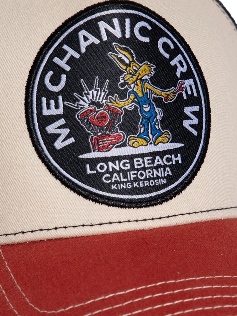 Tyylikäs lippalakki, jossa on punainen lippa ja musta mesh takaosassa. Edessä on suuri ja yksityiskohtainen merkki, joka esittää kahta villiä mekaanikko-hahmoa toiminnassa ja herättää taatusti huomiota. Lakissa on snapback-säätö ja kaareva lippa.