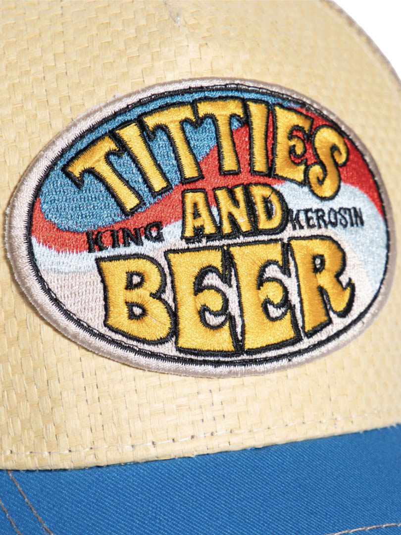 Rohkea lippalakki useissa väreissä, jossa on teksti ”Titties and Beer”. Siinä on kaareva lippa, verkkokangas takana ja snapback-säätö.