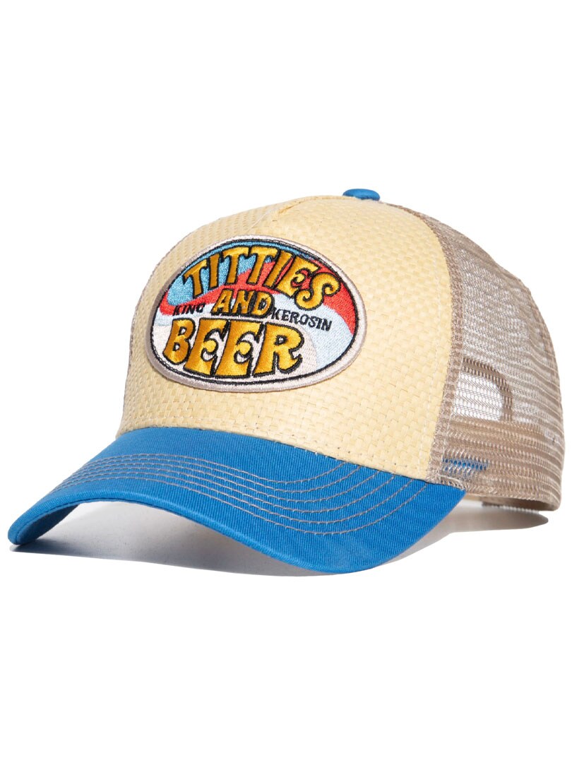 Rohkea lippalakki useissa väreissä, jossa on teksti ”Titties and Beer”. Siinä on kaareva lippa, verkkokangas takana ja snapback-säätö.