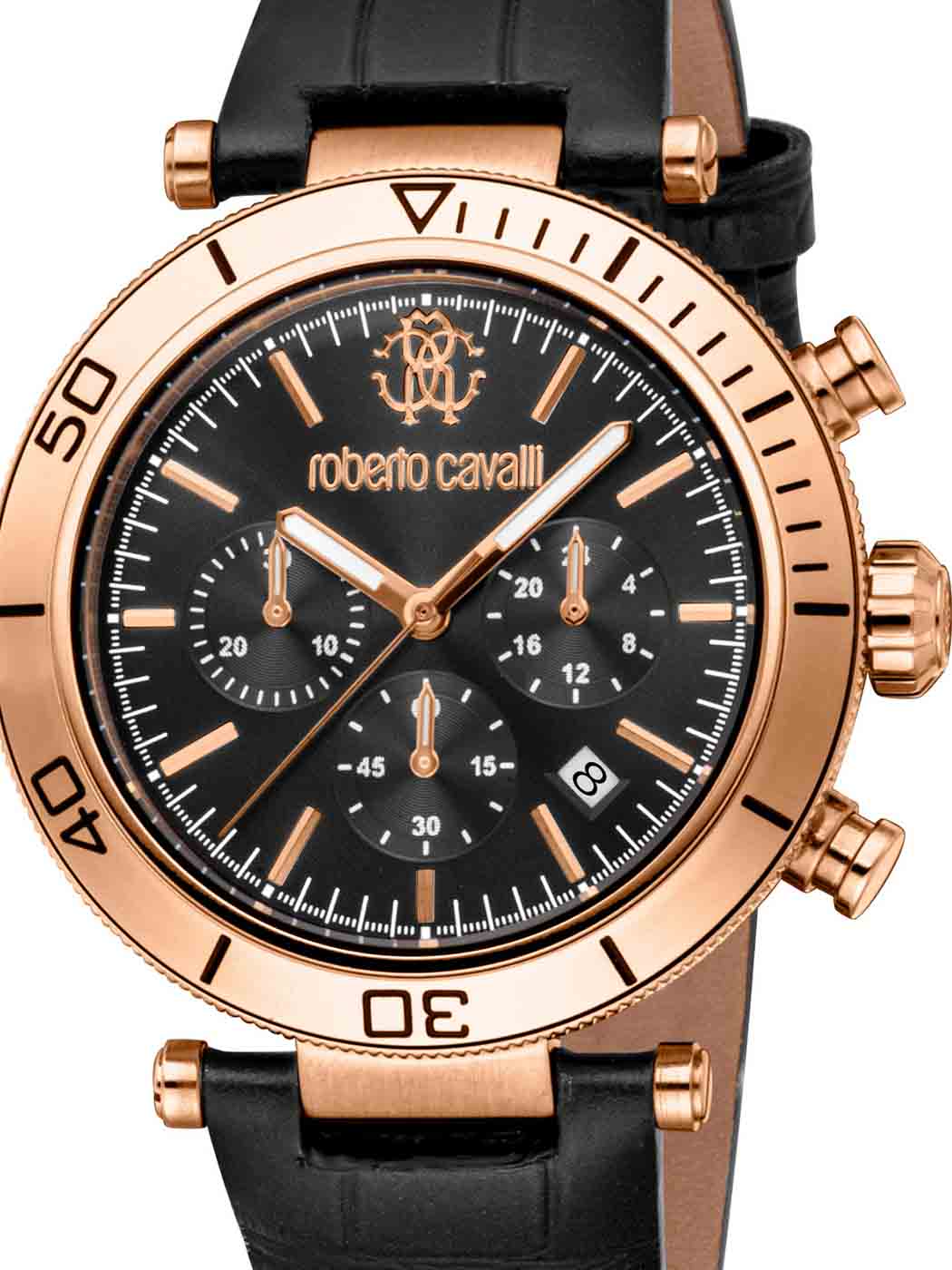 Musta kello ruusukultaisella teräksellä. Kronografitoiminto, päivämäärän näyttö ja kolme apukelloa takaavat teknisen tarkkuuden. Mustan nahkarannekkeen liskonnahkakuviointi huokuu tyyliä ja eleganssia. Vedenpitävä 100 metriin asti.