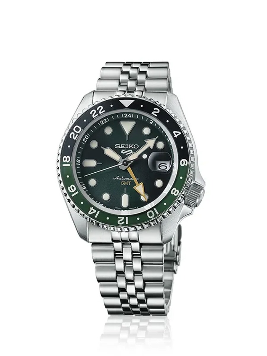 Seiko 5 Sports SSK035K1 on tyylikäs automaattinen GMT-kello, jonka avulla voit seurata kahta aikavyöhykettä samanaikaisesti – täydellinen modernille matkailijalle. Siinä on silmiinpistävä vihreä kellotaulu sunburst-efektillä ja kaksivärinen kääntyvä kehä mustana ja vihreänä. Kelloa pidetään mukavalla viisirivisellä ruostumattomasta teräksestä valmistetulla rannekkeella, ja sitä suojaa naarmuuntumaton Hardlex-lasi päivämääräsuurennuksella. Automaattinen koneisto latautuu liikkeestäsi ja sitä voi ihailla avoimen takakannen kautta. 100 metrin vedenkestävyydellä tämä malli yhdistää urheilullisen kestävyyden ajattomaan tyyliin ja toiminnallisuuteen.