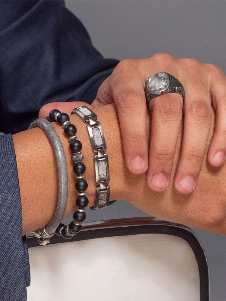 Rannekoru, jossa on 8 mm mattamustia akaattikiviä yhdistettynä mustiin hapettuneisiin metallihelmiin. Venyvä nauha helpottaa pukemista ja saa sen istumaan täydellisesti.