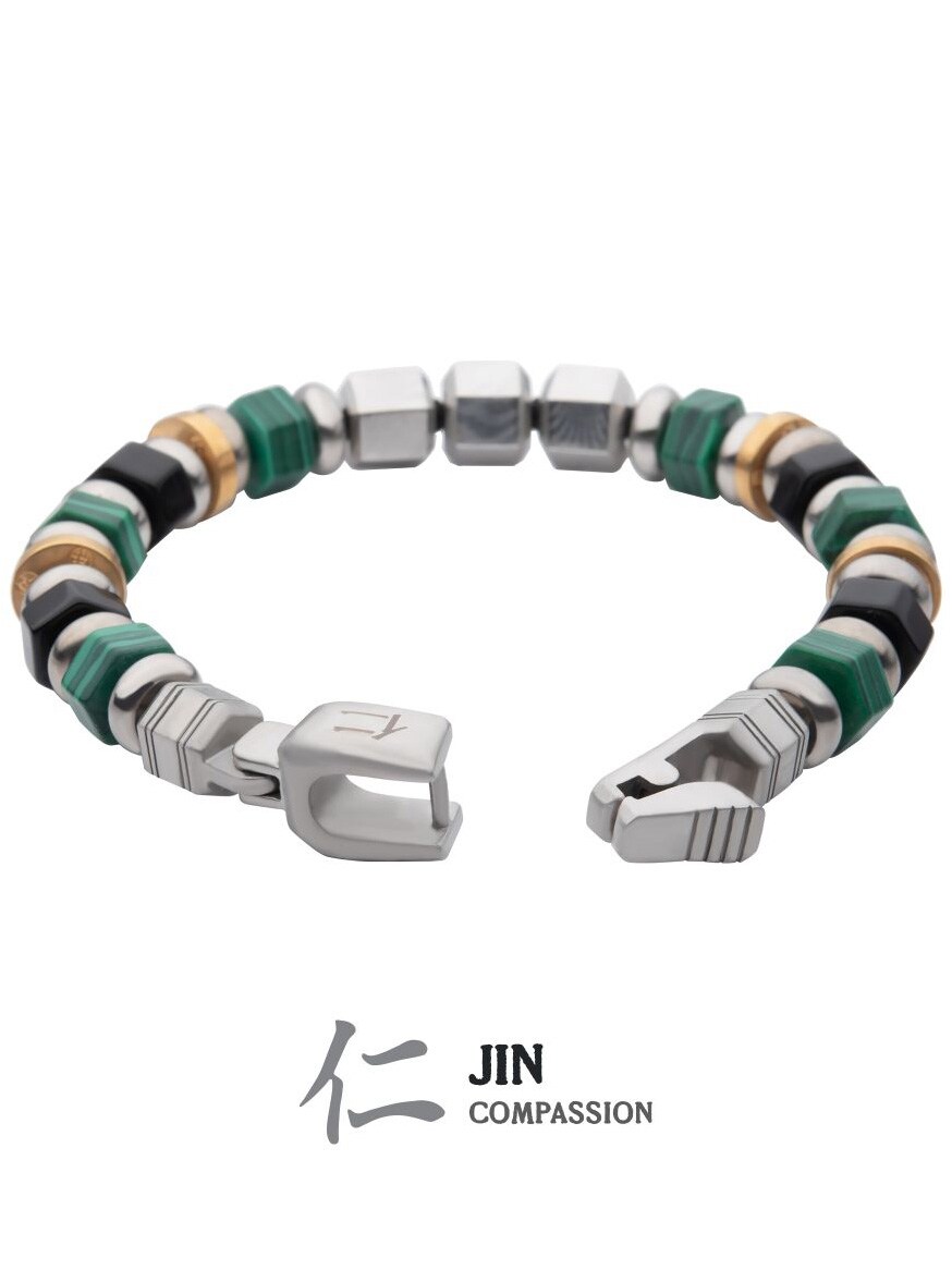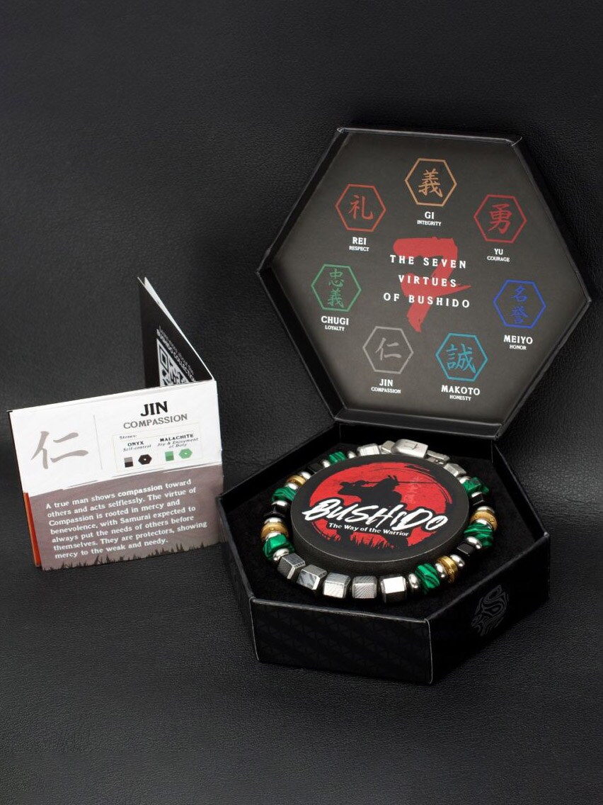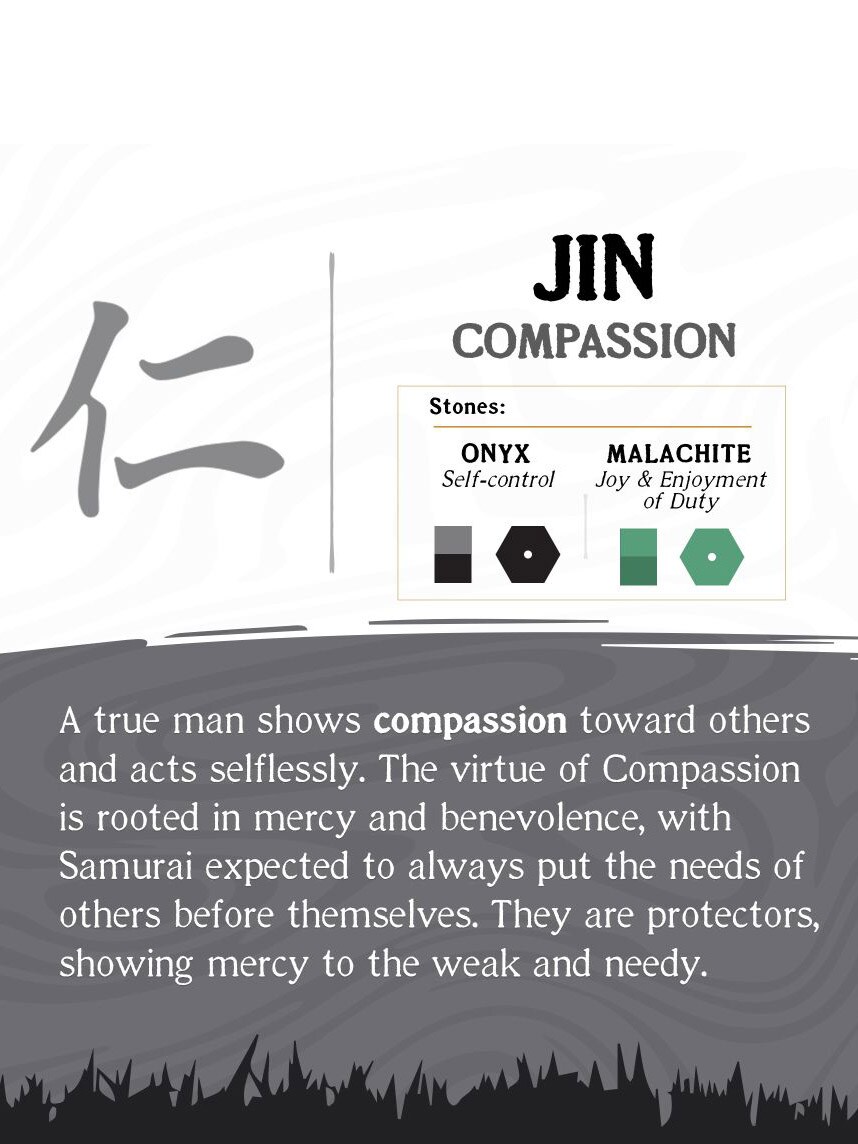 JIN: COMPASSION – Todellinen mies osoittaa myötätuntoa muita kohtaan ja toimii epäitsekäästi. Myötätunnon hyve pohjautuu armeliaisuuteen ja hyväntahtoisuuteen, ja samurailta odotetaan, että he asettavat toisten tarpeet omien edelle. He ovat suojelijoita, jotka osoittavat armoa heikommille ja tarvitseville.
