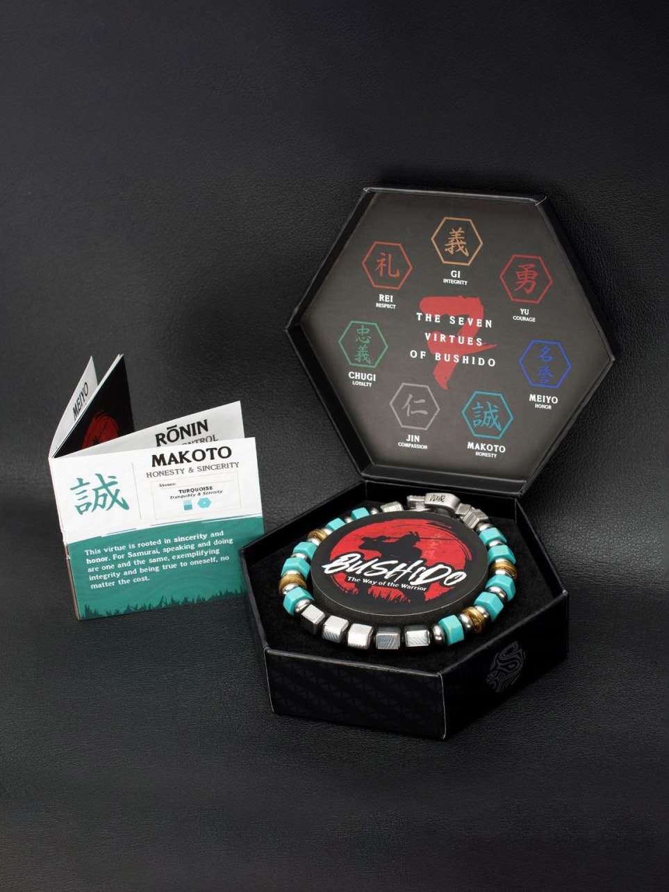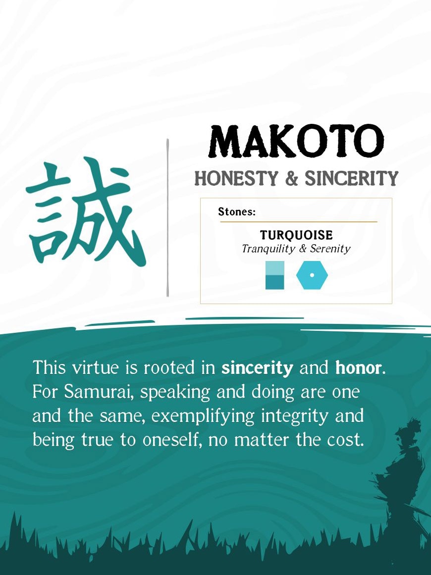 MAKOTO: HONESTY AND SINCERITY – Samurailta odotetaan kunnioitusta, mutta he tietävät myös, että kunnioitus on ansaittava. Tämä hyve pohjautuu kohteliaisuuteen ja kunnioitukseen, ja todellisen miehen tulee johtaa esimerkillään. Kunnioittamalla muita he heijastavat myös omaa itsekunnioitustaan.