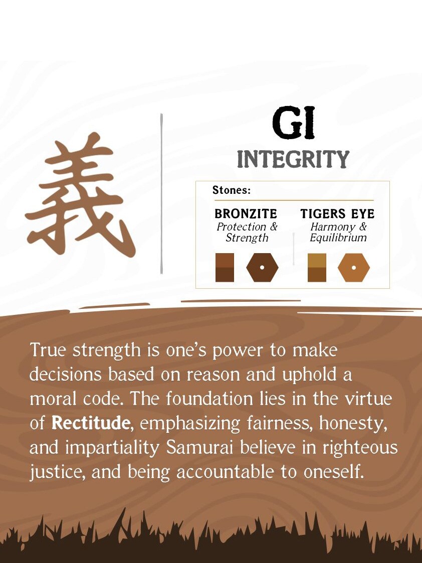 GI: INTEGRITY – Todellinen voima piilee kyvyssä tehdä päätöksiä järjen pohjalta ja noudattaa moraalista sääntöä. Perusta on Oikeamielisyyden hyveessä, joka korostaa reiluutta, rehellisyyttä ja puolueettomuutta. Samurait uskovat oikeudenmukaisuuteen ja vastuuseen itseään kohtaan.