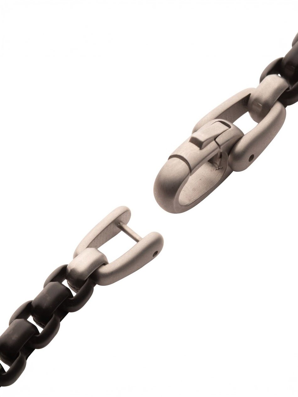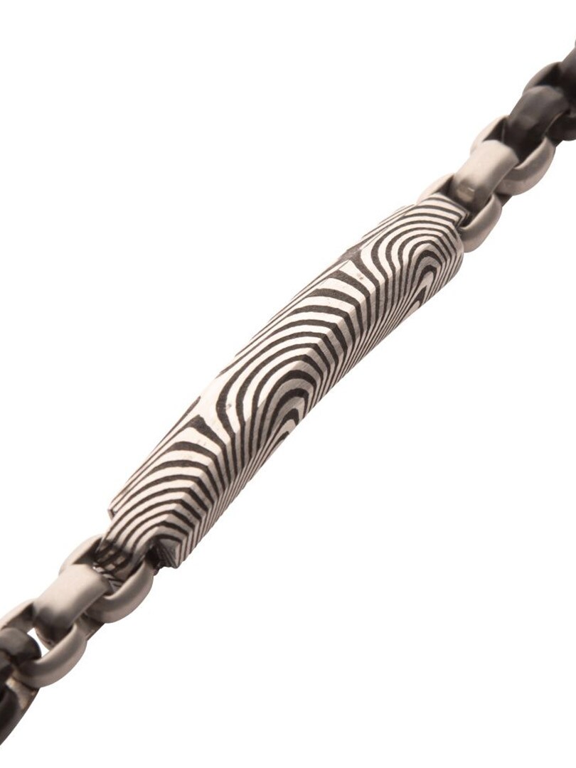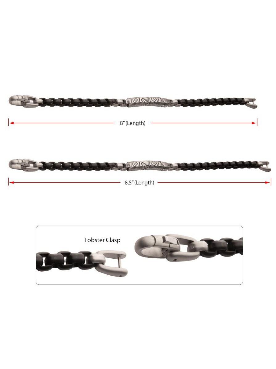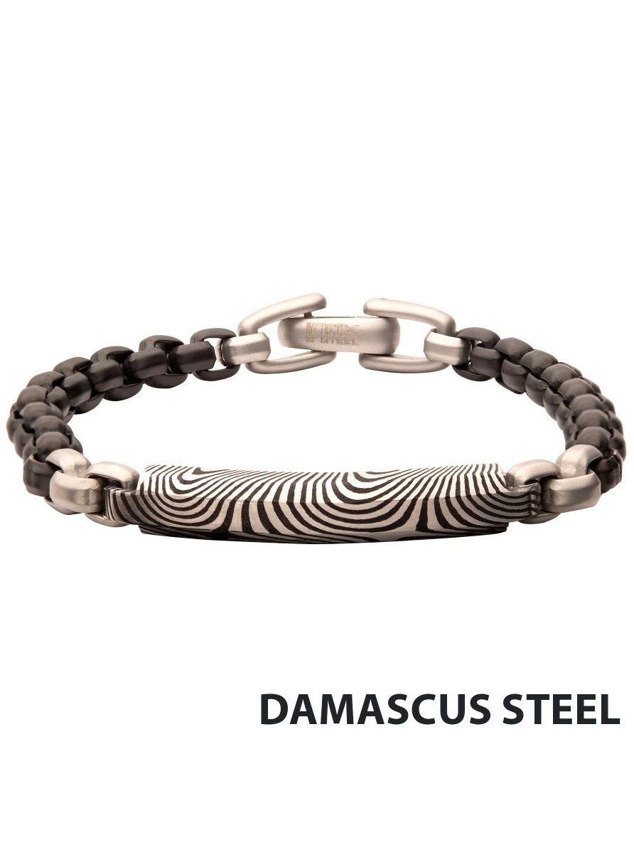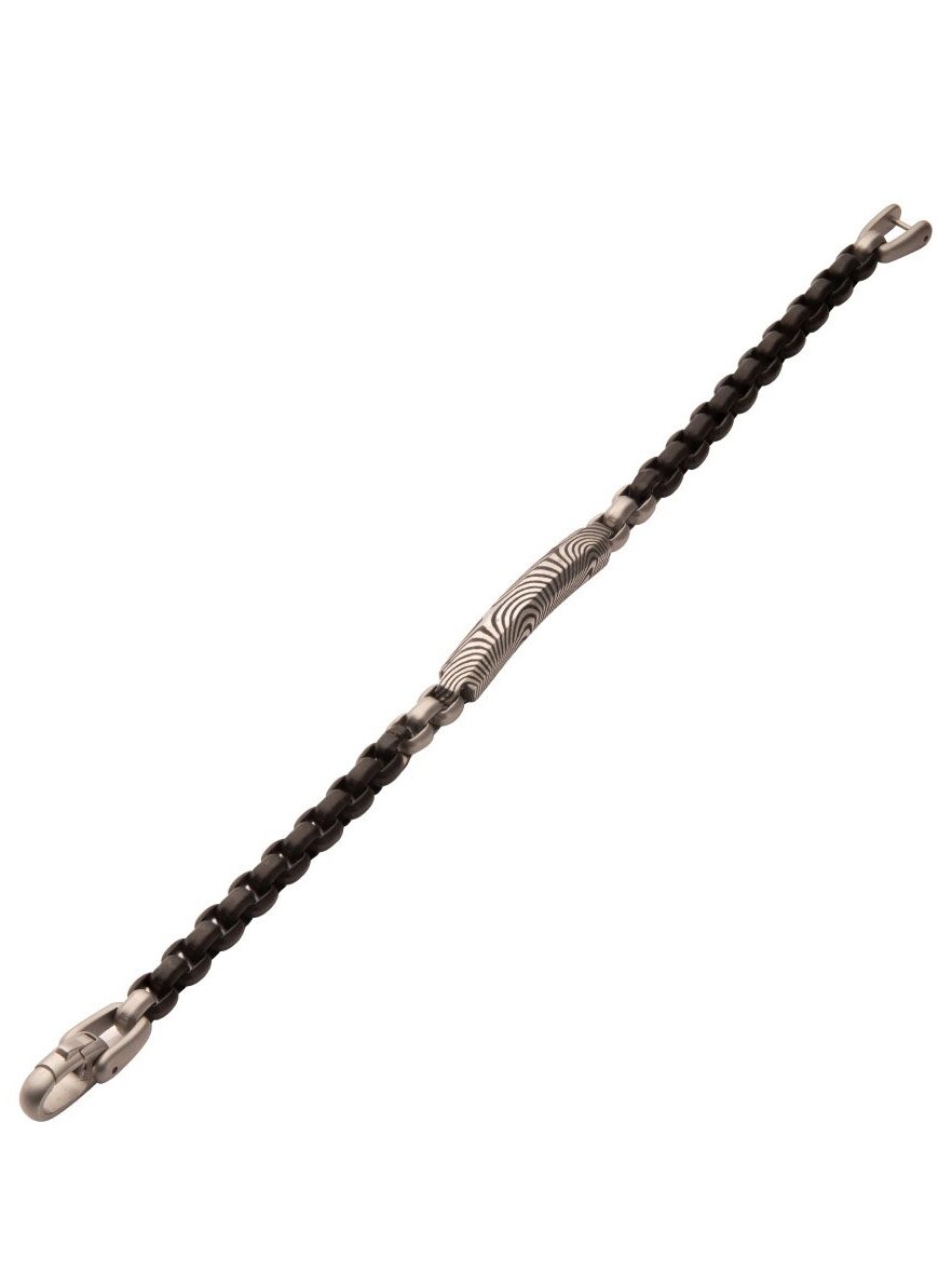 Maskuliininen rannekoru mustaksi IP-pinnoitetusta teräksestä, box chain -lenkillä ja vaikuttavalla aidosta Damaskos-teräksestä valmistetulla laatalla – jokaisessa oma, ainutlaatuinen kuvionsa. Rannekorussa on kaksoisnivelöity karabiinilukko, joka tarjoaa sekä varman kiinnityksen että miellyttävän joustavan istuvuuden.