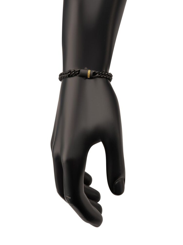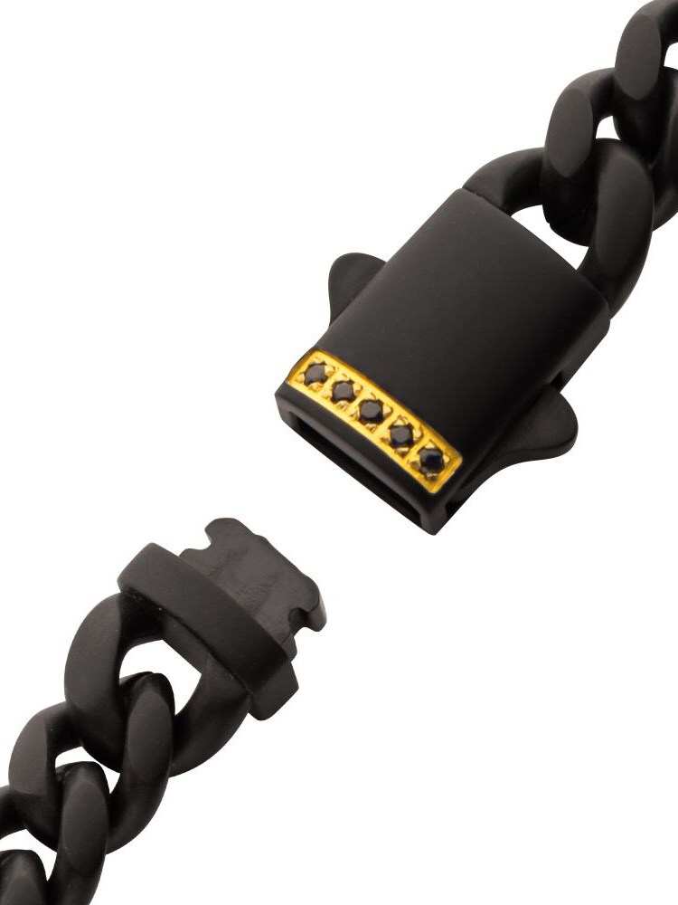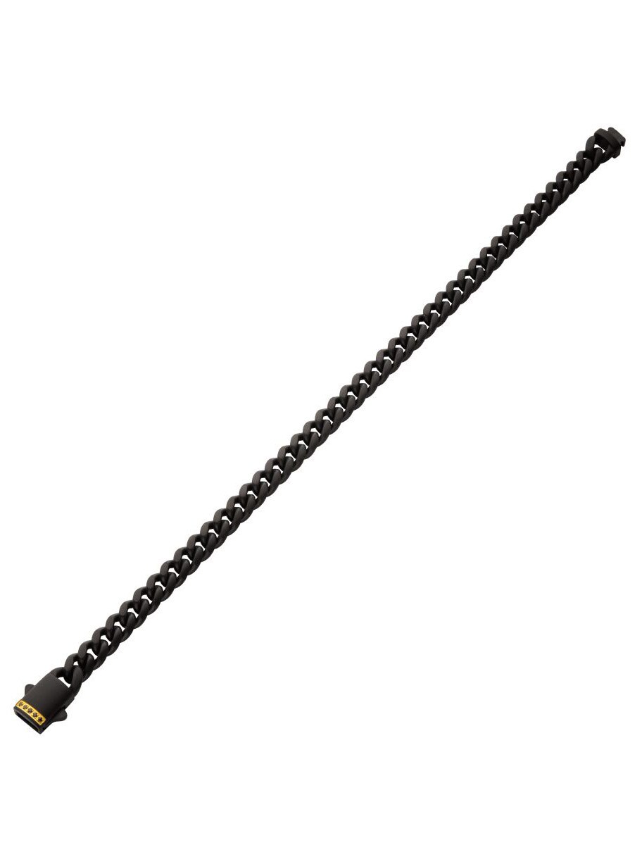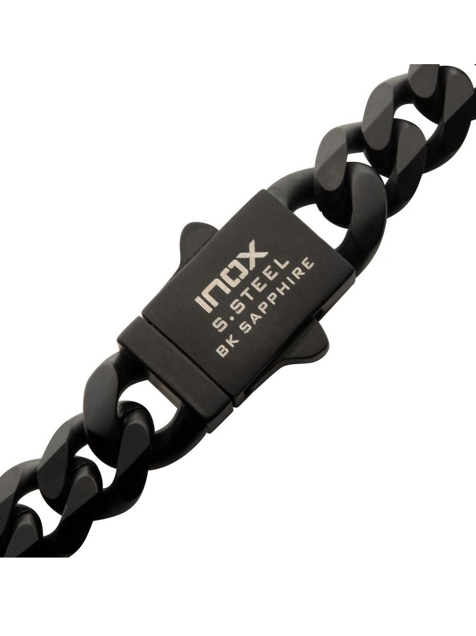 Ruostumattomasta teräksestä valmistettu ketjurannekoru mustalla IP-pinnoituksella. Lukossa on safiirikivi ja mattapintainen viimeistely.