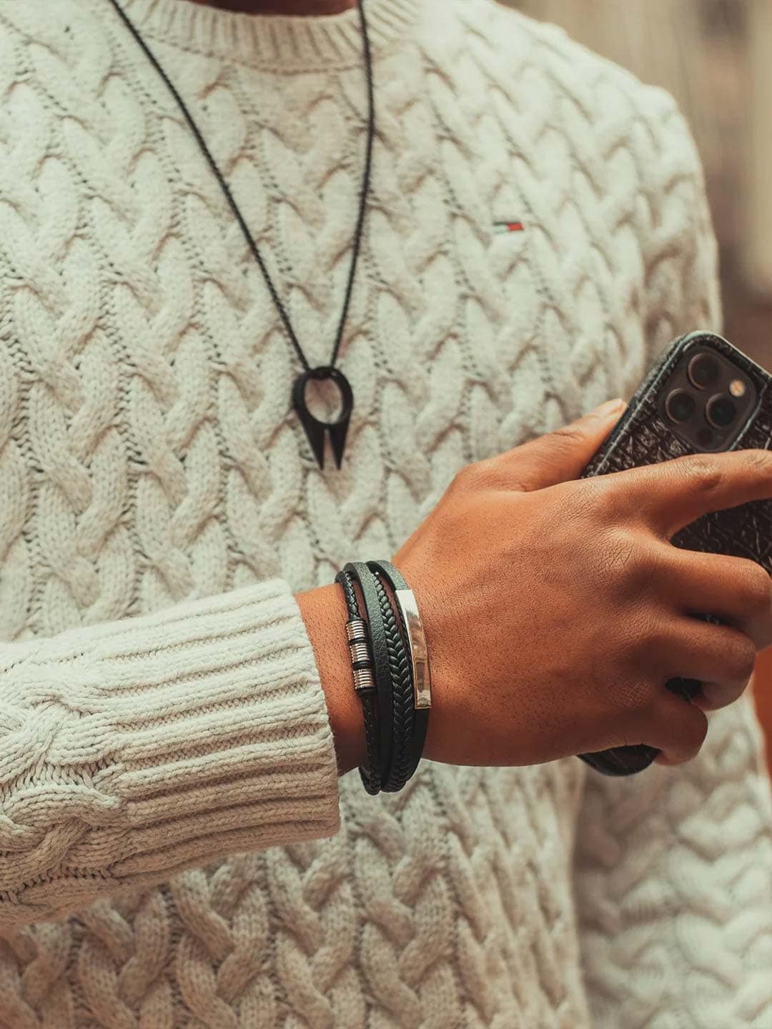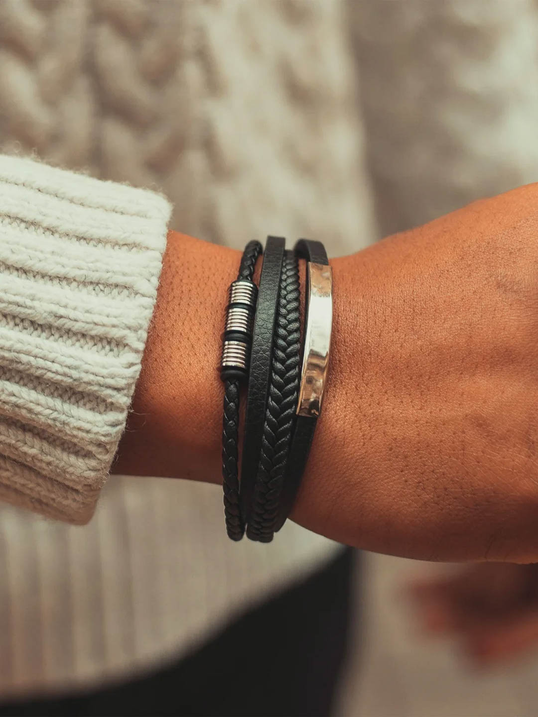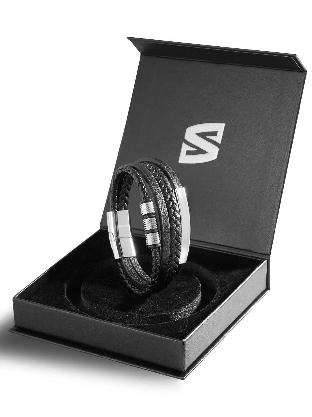 Tyylikäs ranneke, jossa yhdistyy musta aito nahka ja kiillotetut ruostumattoman teräksen elementit. Turvallinen magneettisolki tekee rannekkeesta helpon pukea ja riisua, ja mukana tuleva jatkopala mahdollistaa pituuden säädön optimaalisen istuvuuden saavuttamiseksi. Muotoilu tasapainottaa klassisen tyylin ja modernin asenteen – täydellinen niin arkeen kuin juhlaan!