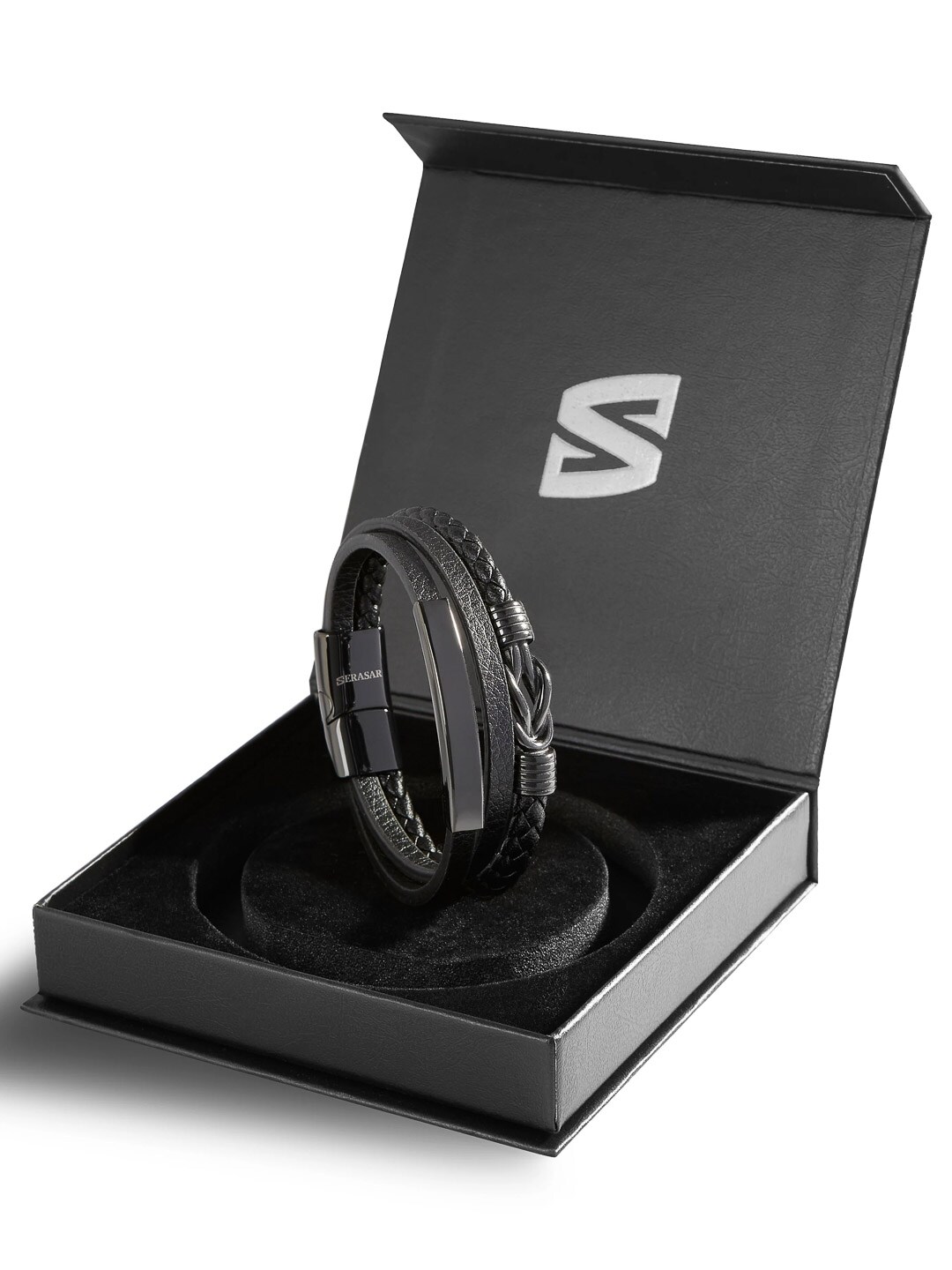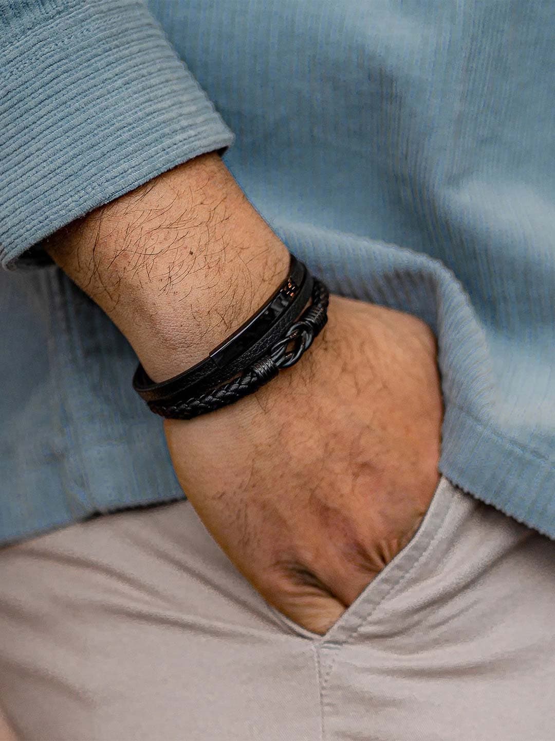 Tyylikäs ranneke, jossa yhdistyy musta aito nahka ja kiillotetut ruostumattoman teräksen elementit. Turvallinen magneettisolki tekee rannekkeesta helpon pukea ja riisua, ja mukana tuleva jatkopala mahdollistaa pituuden säädön optimaalisen istuvuuden saavuttamiseksi. Muotoilu tasapainottaa klassisen tyylin ja modernin asenteen – täydellinen niin arkeen kuin juhlaan!