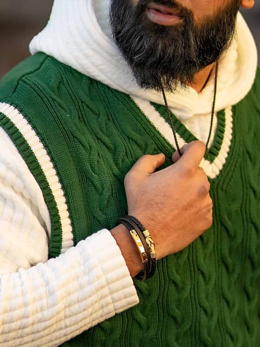 Tyylikäs ranneke, jossa yhdistyy musta aito nahka ja kiillotetut ruostumattoman teräksen elementit. Turvallinen magneettisolki tekee rannekkeesta helpon pukea ja riisua, ja mukana tuleva jatkopala mahdollistaa pituuden säädön optimaalisen istuvuuden saavuttamiseksi. Muotoilu tasapainottaa klassisen tyylin ja modernin asenteen – täydellinen niin arkeen kuin juhlaan!