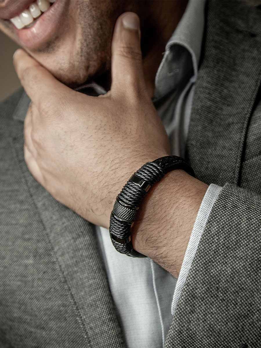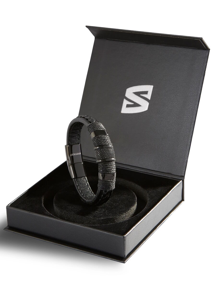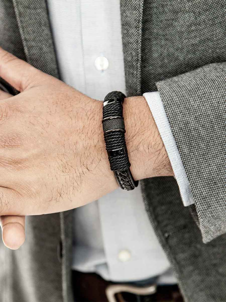 Voimakas ja moderni ranneke, jossa yhdistyvät punottu nahka ja ruostumattoman teräksen yksityiskohdat. Magneettisolki on helppo käsitellä yhdellä kädellä, ja mukana tulee lisäpala pituuden säätöä varten, jotta saat täydellisen istuvuuden. Tyylikäs asuste, joka kohottaa koko asukokonaisuuden.