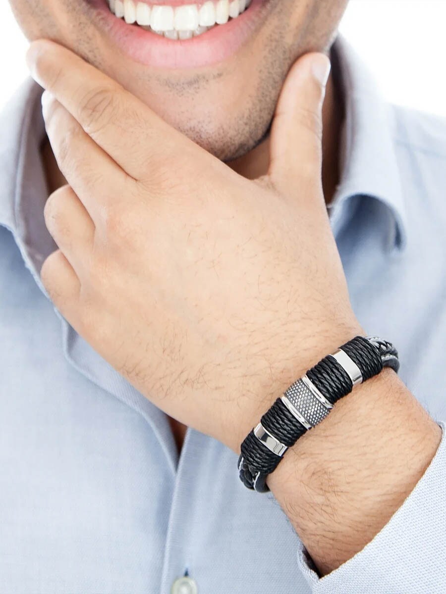 Voimakas ja moderni ranneke, jossa yhdistyvät punottu nahka ja ruostumattoman teräksen yksityiskohdat. Magneettisolki on helppo käsitellä yhdellä kädellä, ja mukana tulee lisäpala pituuden säätöä varten, jotta saat täydellisen istuvuuden. Tyylikäs asuste, joka kohottaa koko asukokonaisuuden.