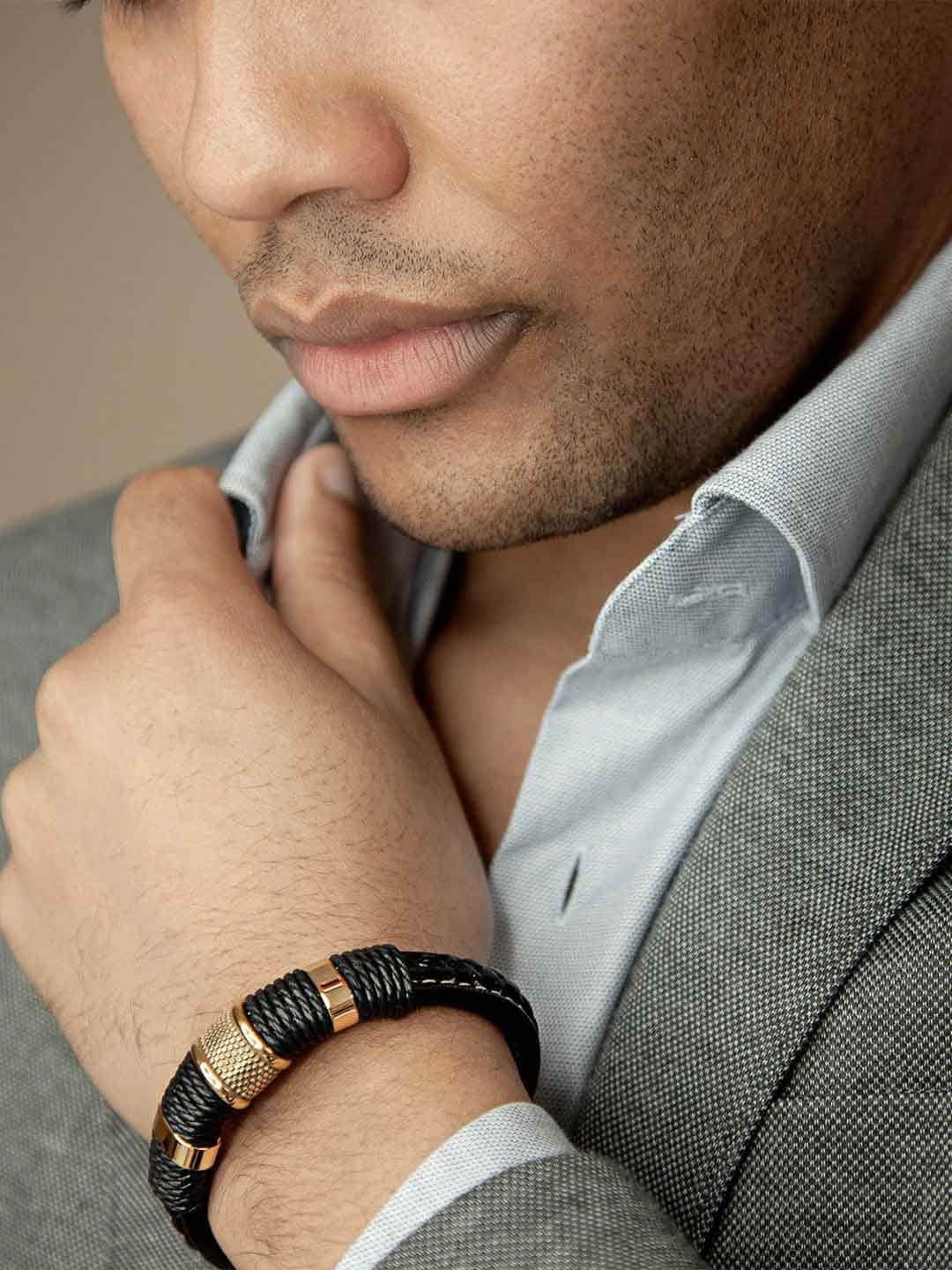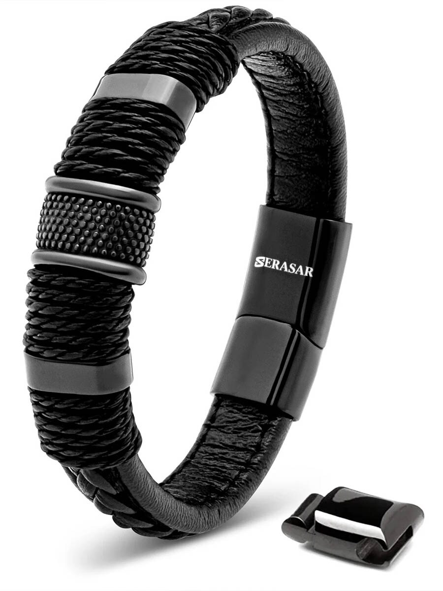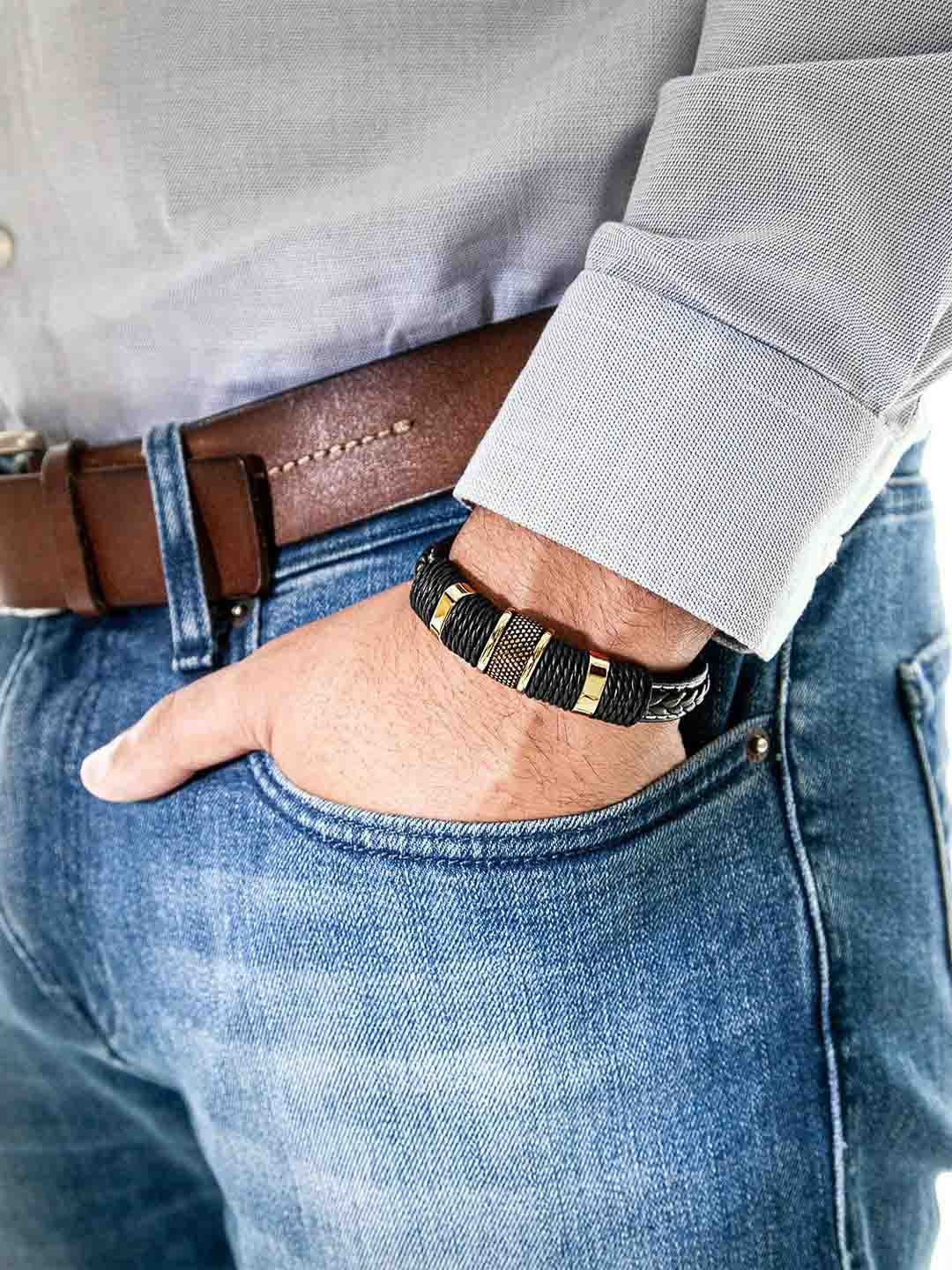 Voimakas ja moderni ranneke, jossa yhdistyvät punottu nahka ja ruostumattoman teräksen yksityiskohdat. Magneettisolki on helppo käsitellä yhdellä kädellä, ja mukana tulee lisäpala pituuden säätöä varten, jotta saat täydellisen istuvuuden. Tyylikäs asuste, joka kohottaa koko asukokonaisuuden.