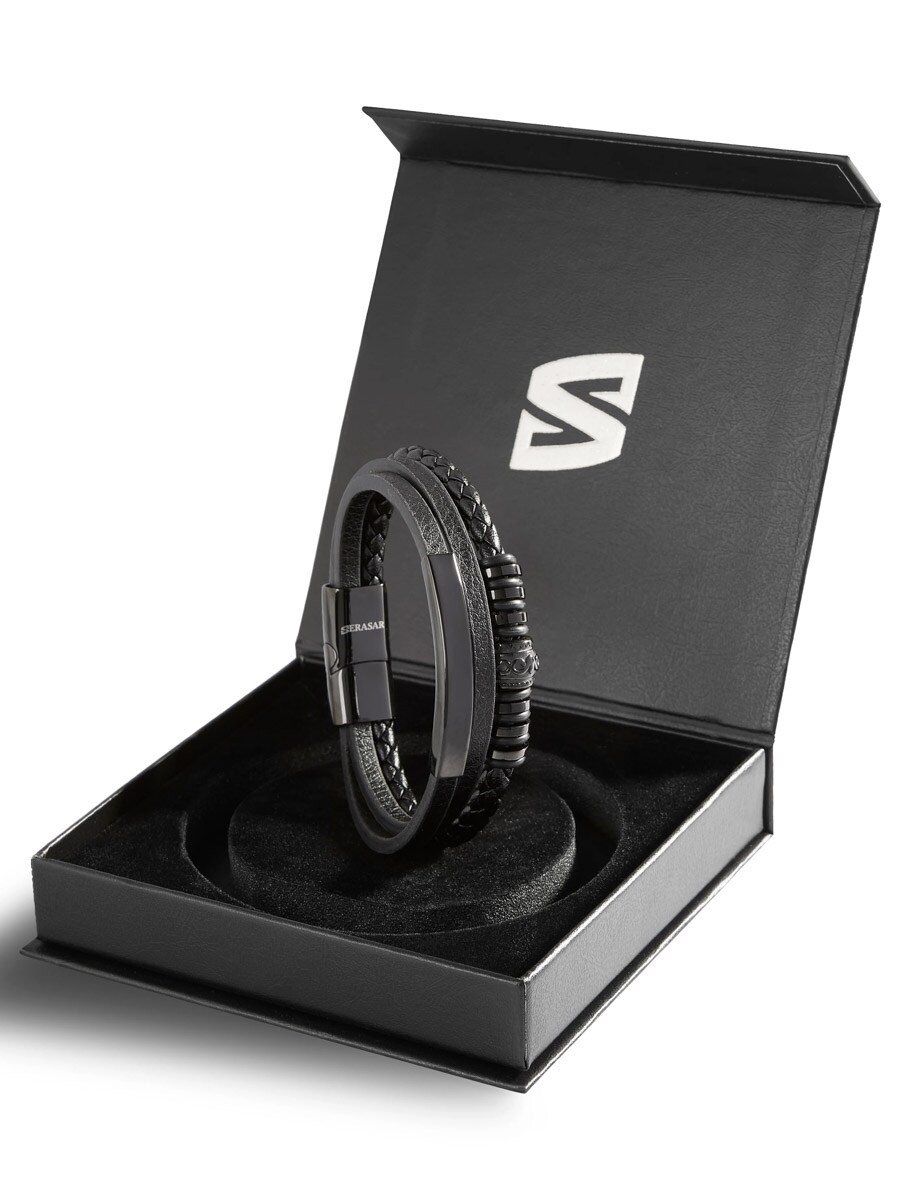 Tyylikäs ranneke, jossa yhdistyy musta aito nahka ja kiillotetut ruostumattoman teräksen elementit. Turvallinen magneettisolki tekee rannekkeesta helpon pukea ja riisua, ja mukana tuleva jatkopala mahdollistaa pituuden säädön optimaalisen istuvuuden saavuttamiseksi. Muotoilu tasapainottaa klassisen tyylin ja modernin asenteen – täydellinen niin arkeen kuin juhlaan!