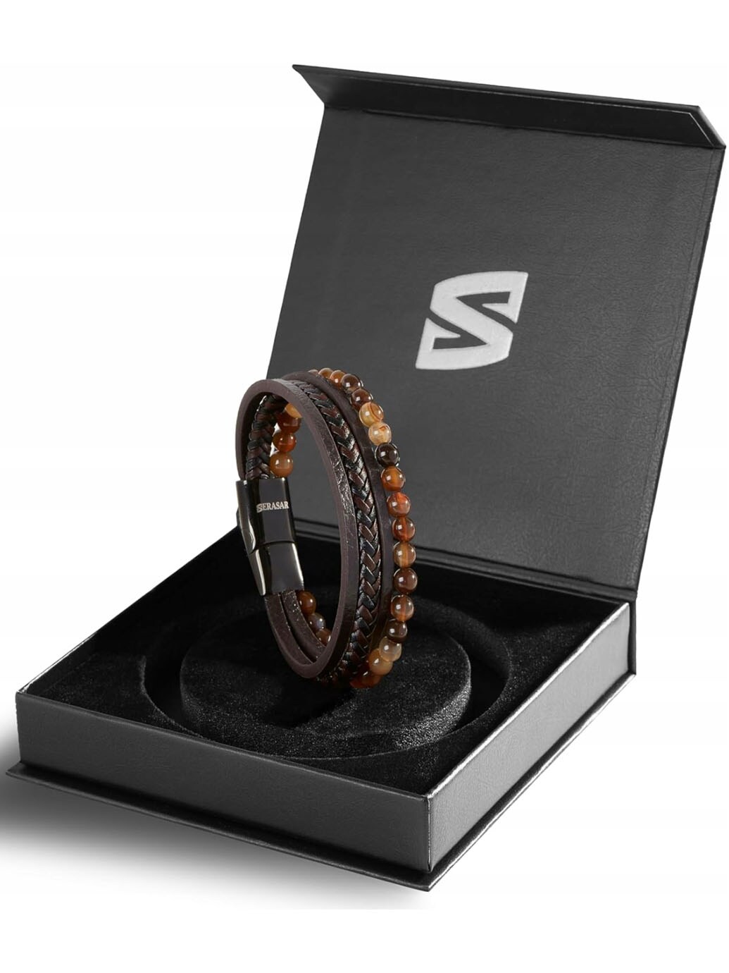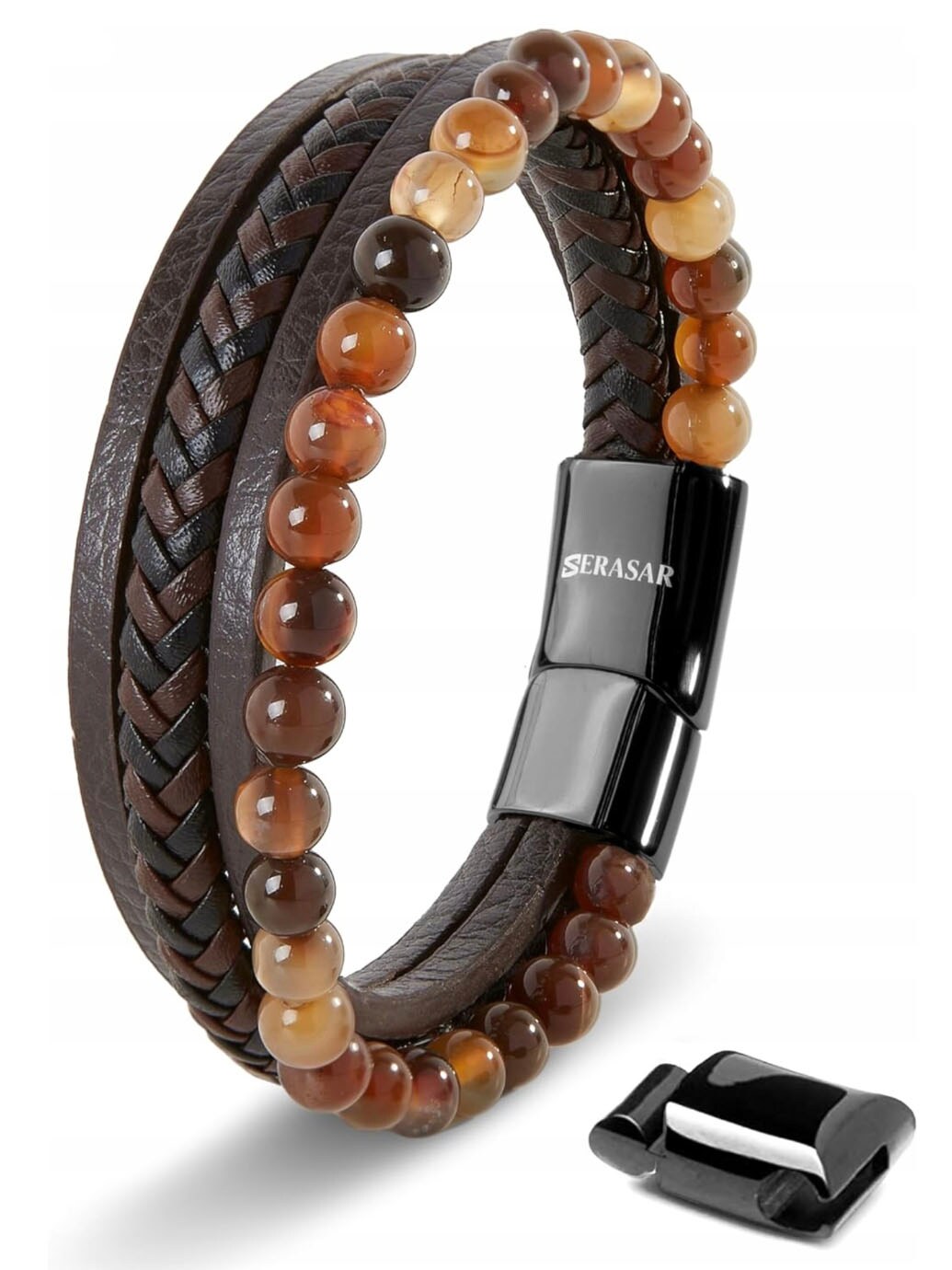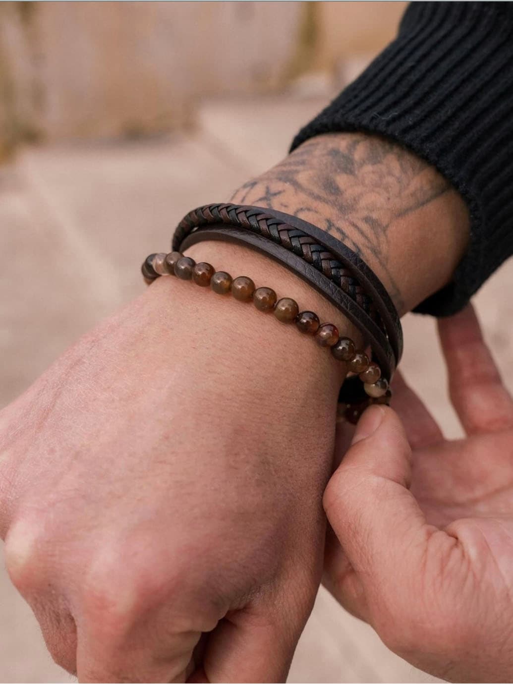 Tyylikäs ranneke, jossa yhdistyy punottu nahka ja laavakivet modernin ja voimakkaan ilmeen luomiseksi. Kiillotettu magneettisolki ruostumattomasta teräksestä tekee rannekkeen pukemisesta ja riisumisesta helppoa, samalla kun se pysyy turvallisesti paikallaan. Mukana tulee lisälenkki, jonka avulla voit säätää pituuden täydelliseen istuvuuteen. Hienostunut asuste, joka sopii sekä arkeen että juhlaan.