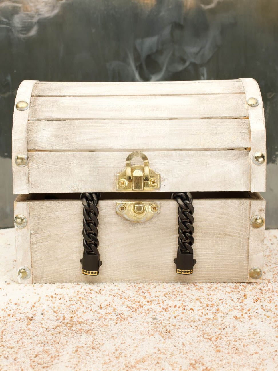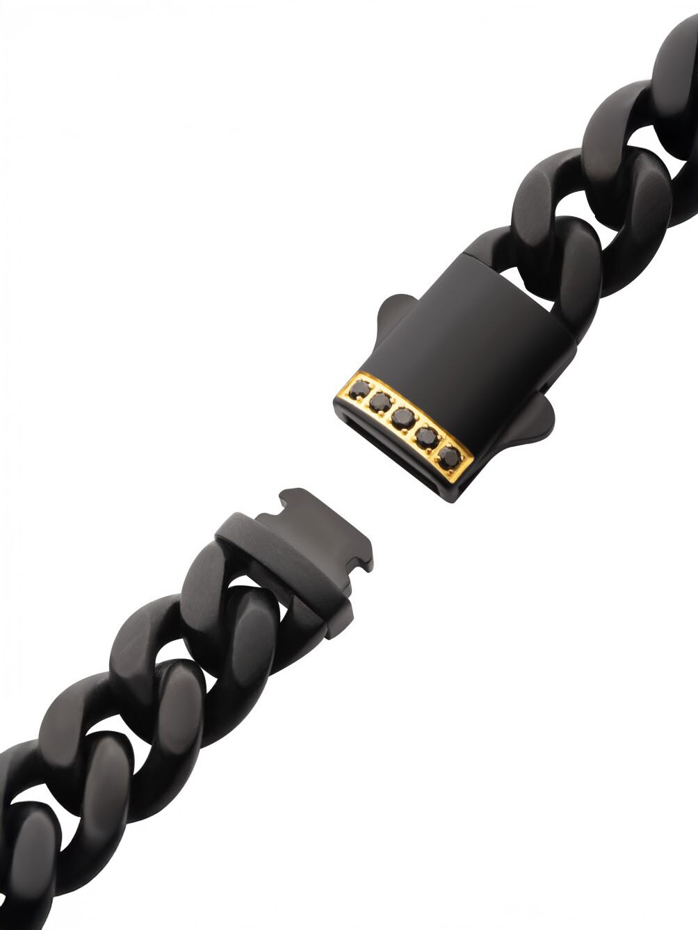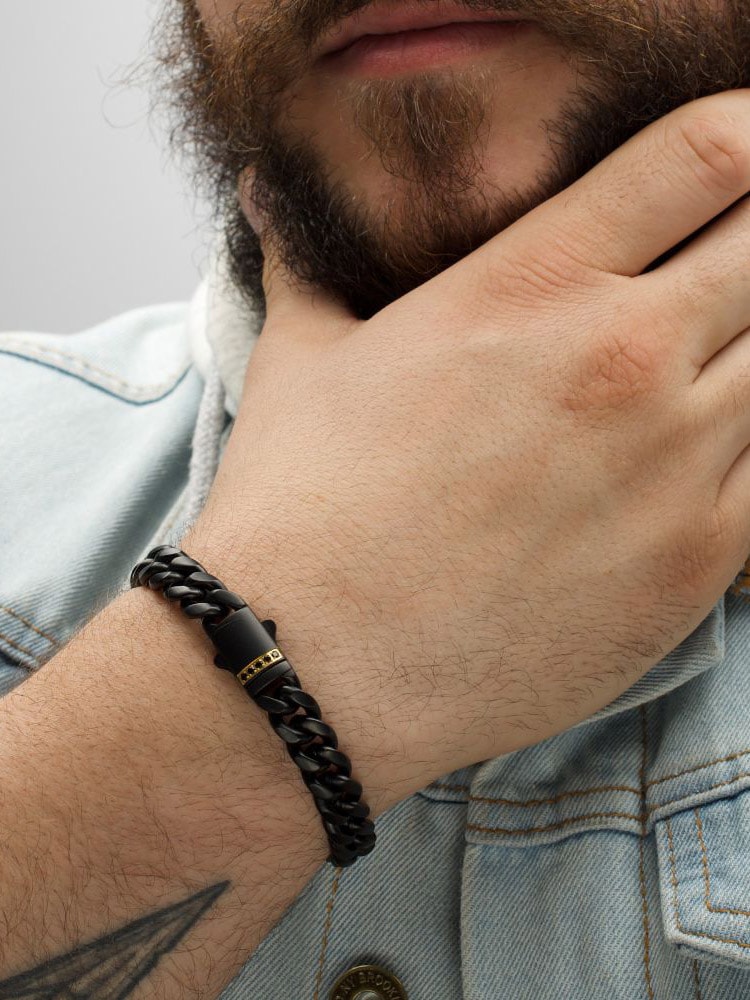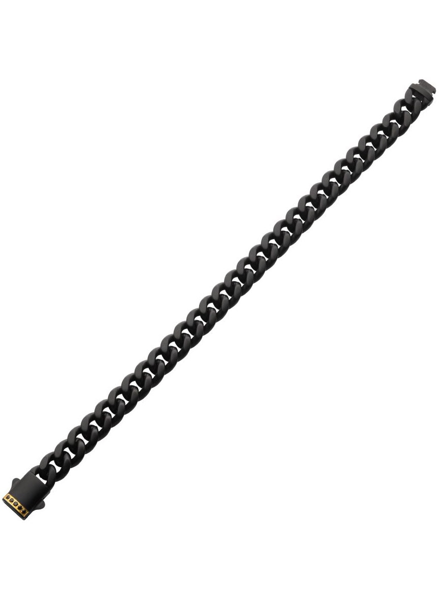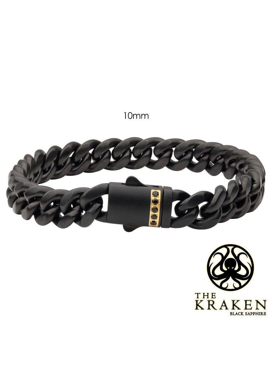 Ruostumattomasta teräksestä valmistettu ketjurannekoru mustalla IP-pinnoituksella. Lukossa on safiirikivi ja mattapintainen viimeistely.