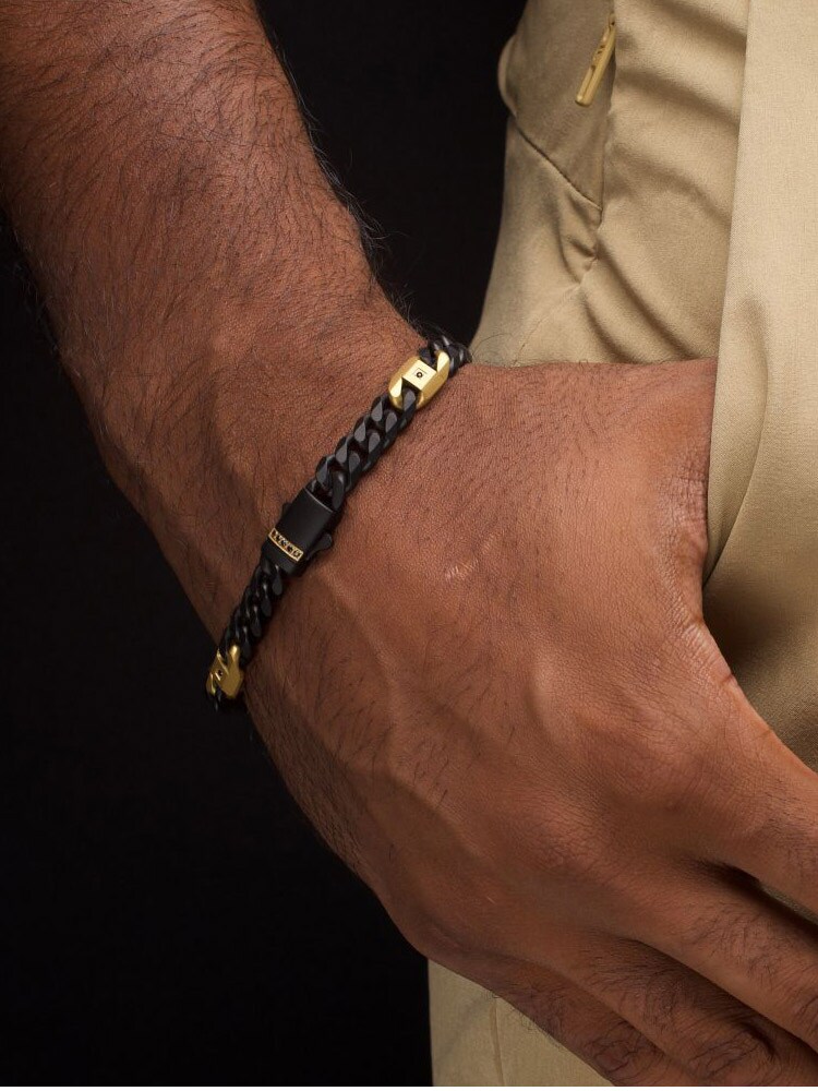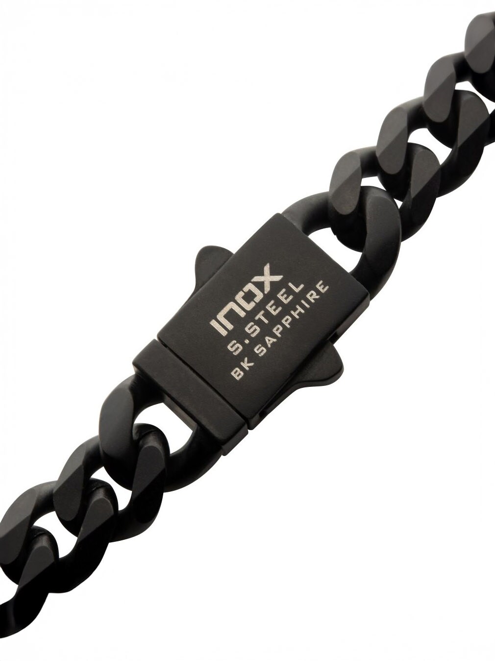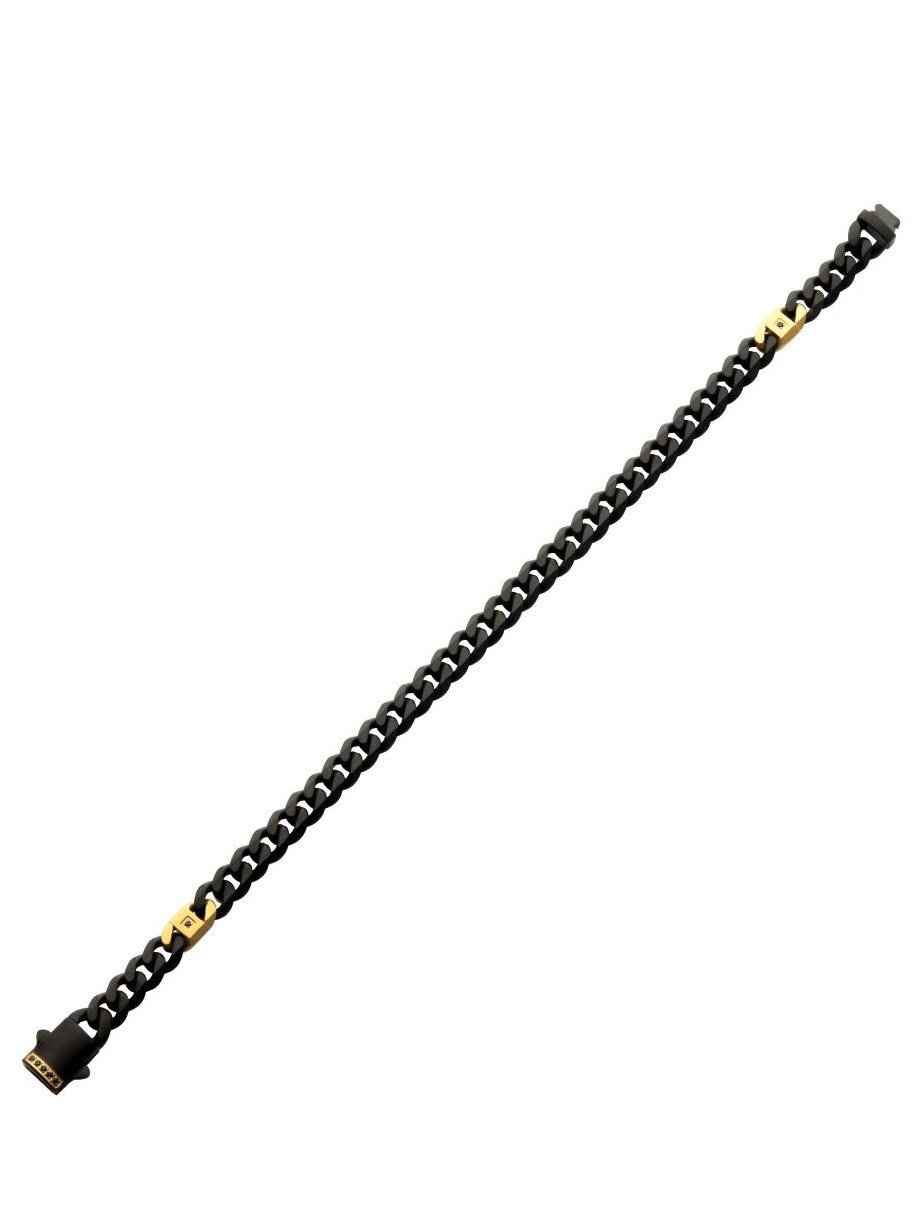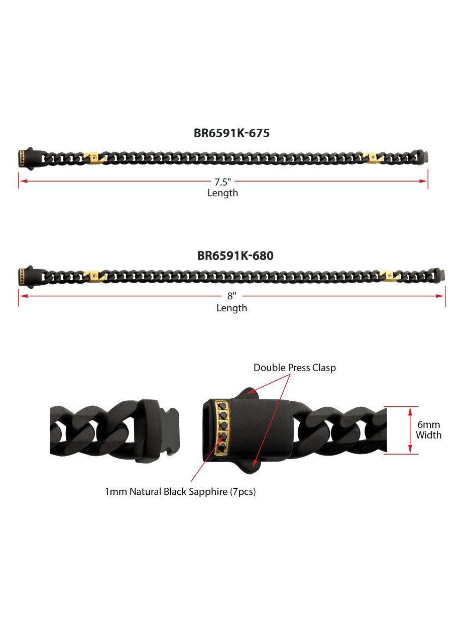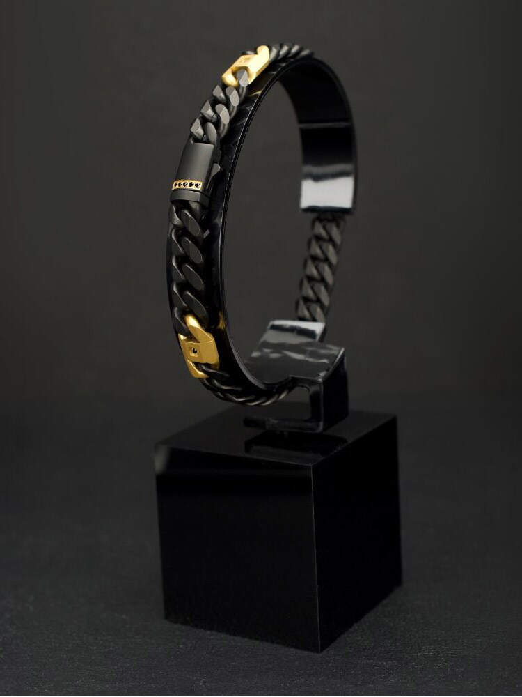 Ketjurannekoru ruostumattomasta teräksestä, mustalla IP-pinnoitteella ja kultayksityiskohdilla. Suunniteltu safiirikivellä lukon kohdalla ja mattapinnalla.