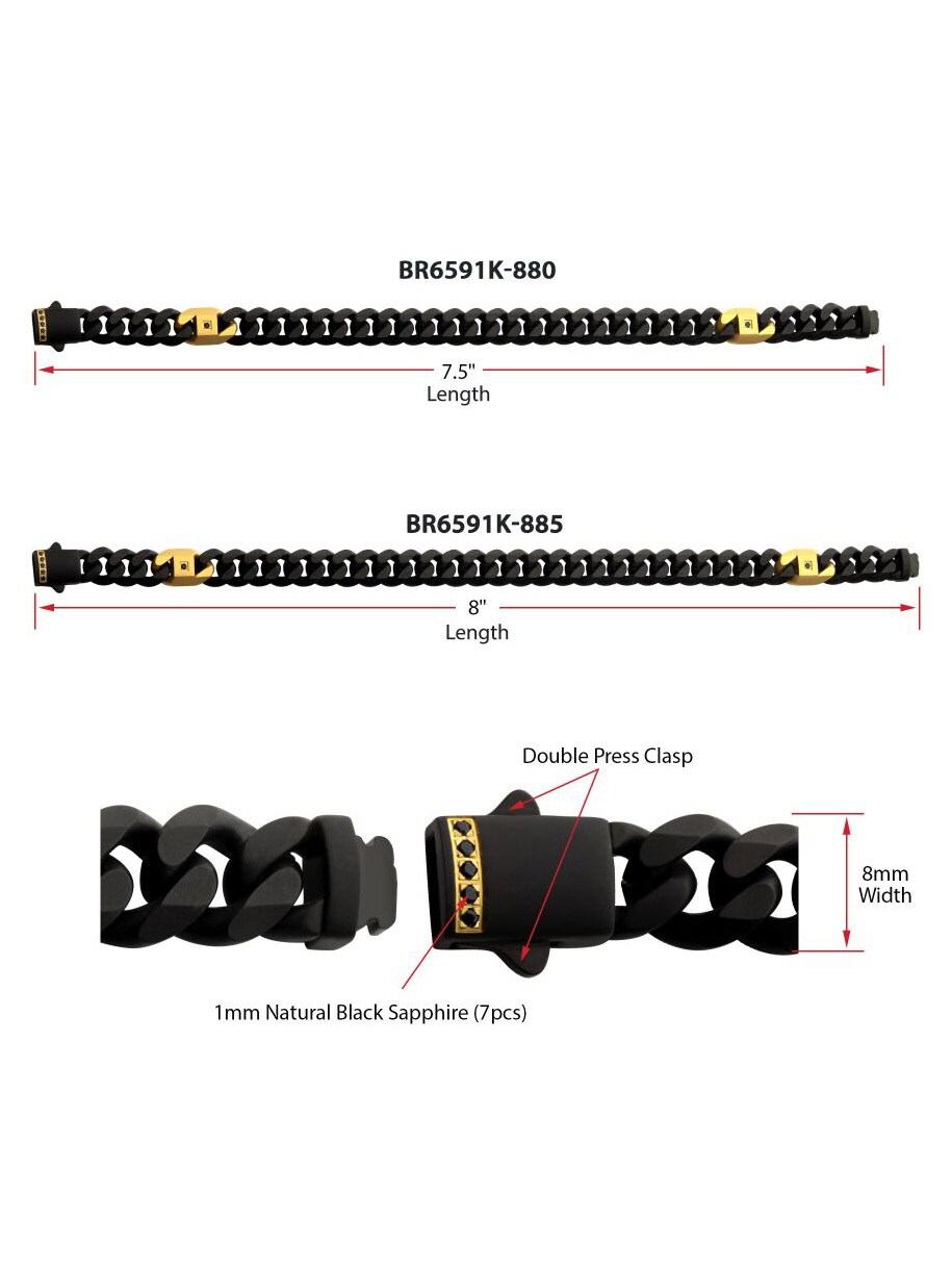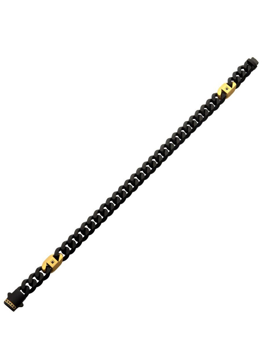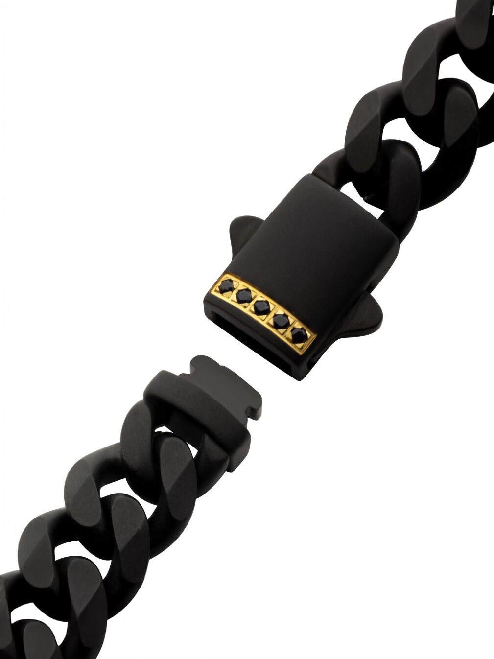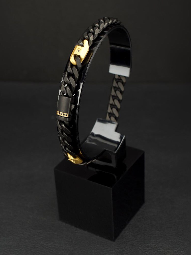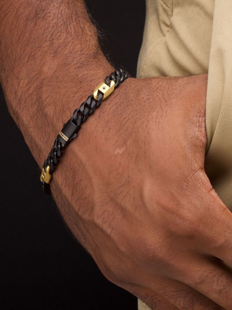 Ketjurannekoru ruostumattomasta teräksestä, mustalla IP-pinnoitteella ja kultayksityiskohdilla. Suunniteltu safiirikivellä lukon kohdalla ja mattapinnalla.