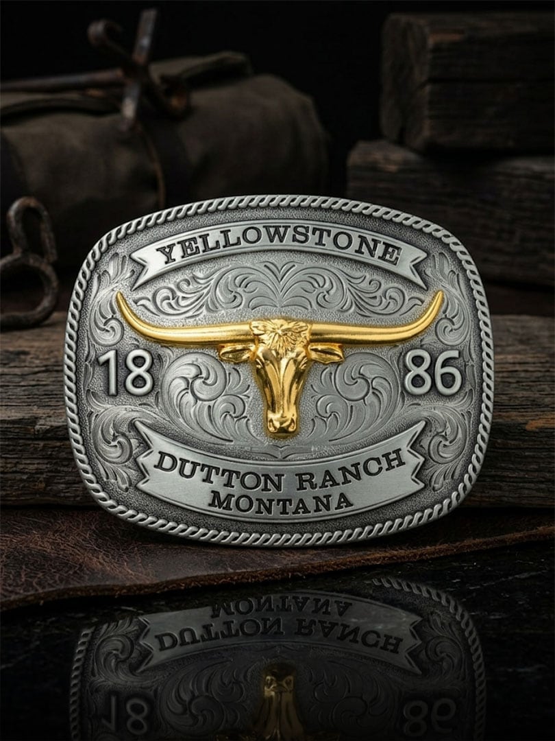 Anna vyöllesi aito western-ilme tällä eksklusiivisella soljella, joka on saanut inspiraationsa Yellowstone-maailmasta. Solki on koristeltu kohotetulla kultapinnoitetulla longhorn-applikaatiolla tummalla taustalla, mikä luo vahvan yhteyden klassiseen cowboy-tyyliin.