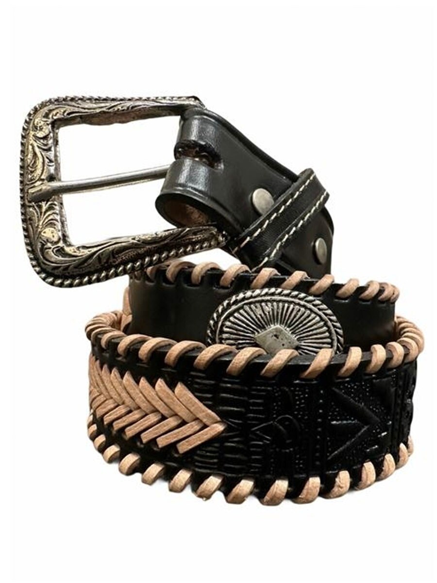 Luonteikas vyö paksusta naudannahasta, jossa on punotut reunat, koristeelliset metalliyksityiskohdat ja prässätyt elementit, jotka luovat selkeän western-ilmeen. Tyylikäs solki on vaihdettavissa, mikä tekee vyöstä helpon yhdistää lähes mihin tahansa vyönsolkeen.