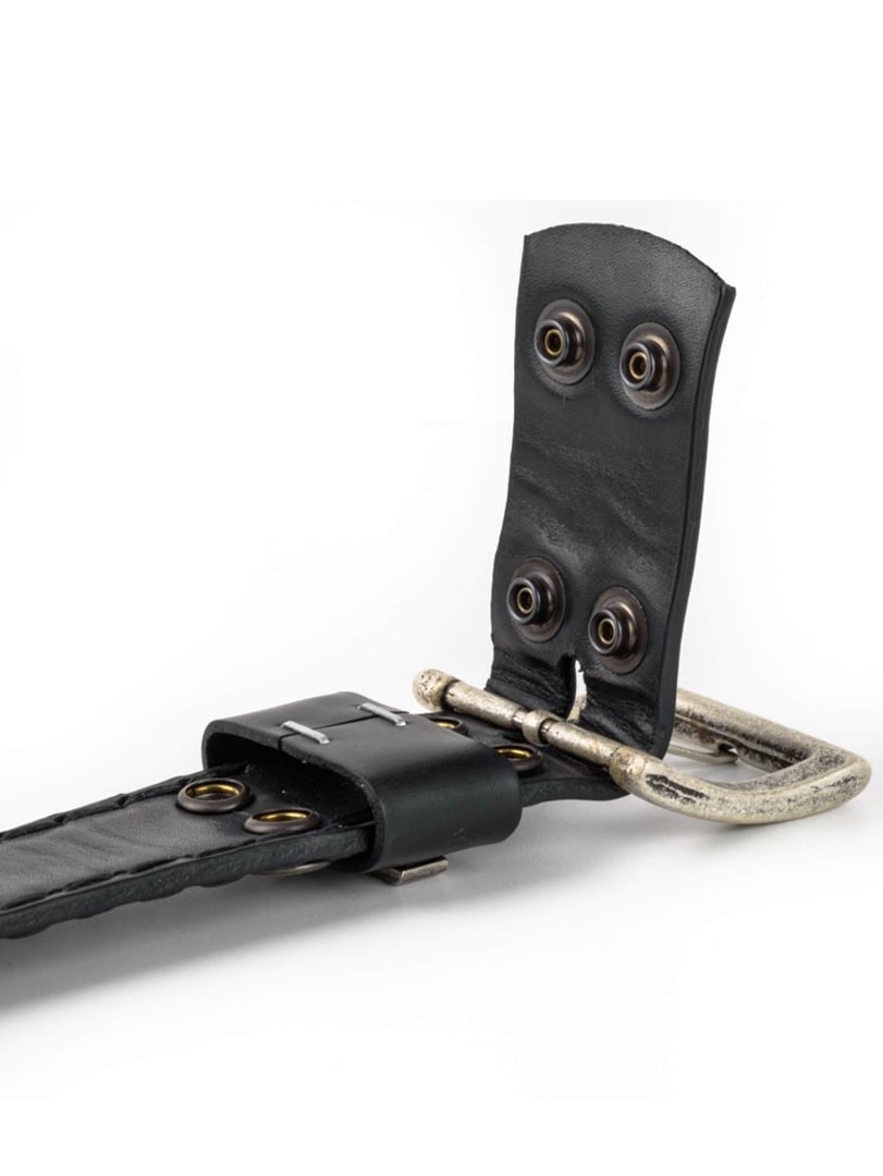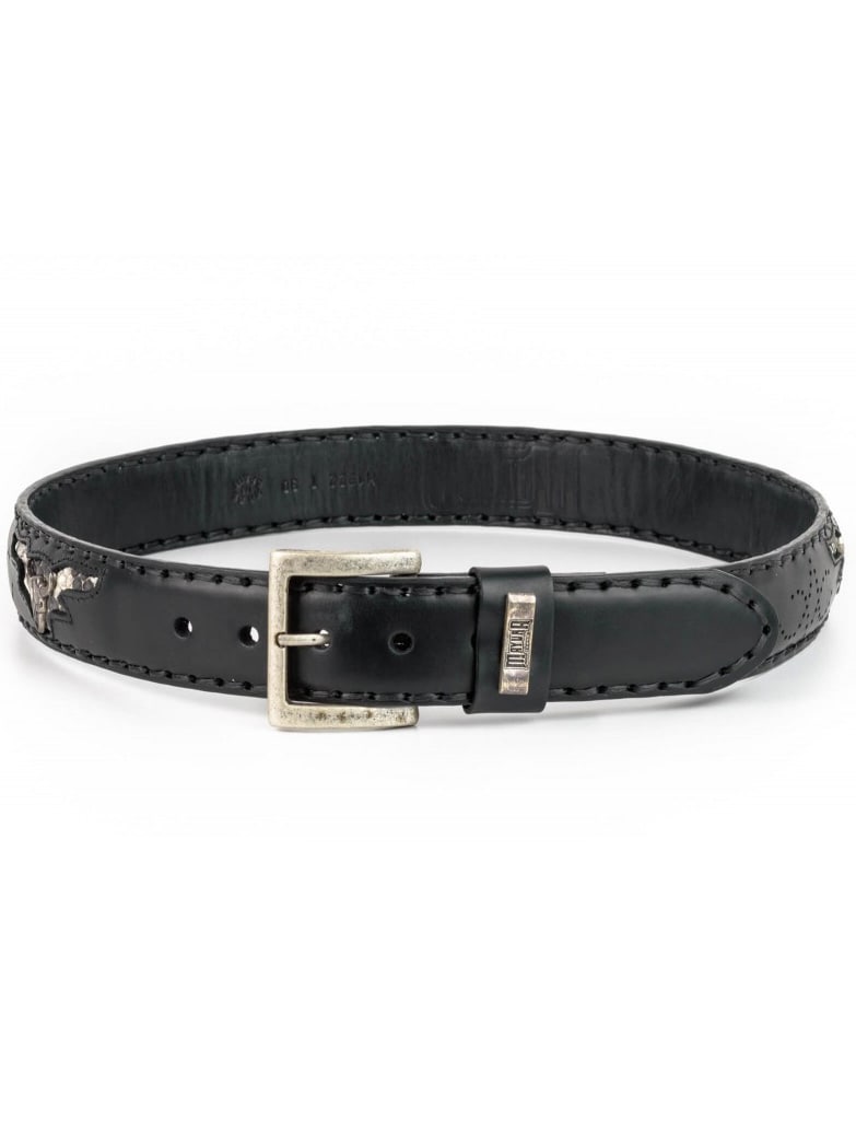 Luonteikas vyö sinulle, joka etsit jotain tavallista näyttävämpää. Valmistettu vahvan mustan Vacuno-nahkan ja aidon luonnollisen python-nahan yhdistelmästä, mikä luo ylellisen viimeistelyn ja ainutlaatuisen tekstuurin. Kohokuvioitu kuviointi ja koristeelliset metalliyksityiskohdat antavat vyölle selkeästi western-henkisen ilmeen. Täydellinen statement-asuste, joka nostaa sekä farkut että chinot uudelle tasolle!