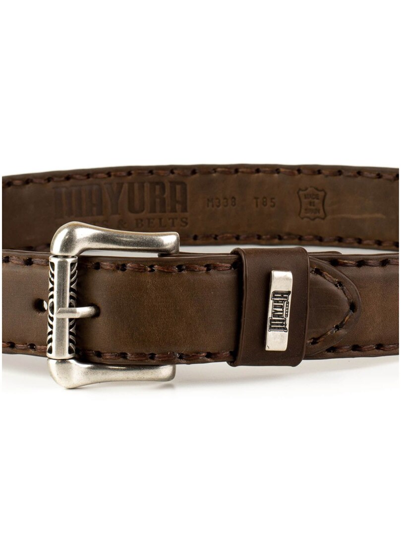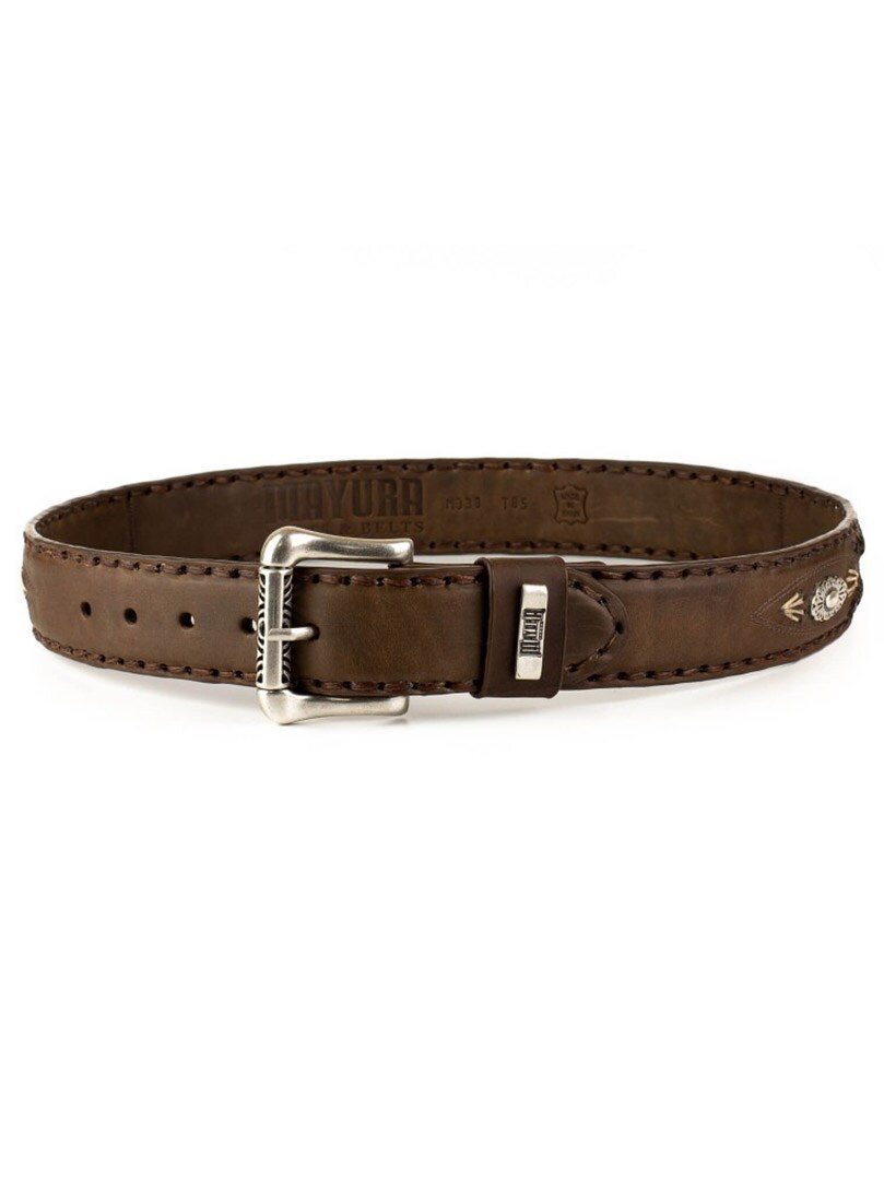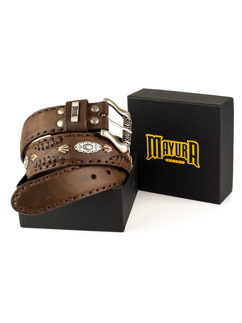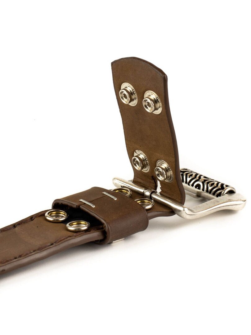 Voimakas ja tyylikäs vyö, jossa on selkeä western-ilme. Valmistettu kestävästä ruskeasta nahasta ja koristeltu kohokuvioiduilla kuvioilla sekä antiikkisävyisillä metalliyksityiskohdilla, jotka tuovat vyölle erottuvan ja ylellisen ilmeen. Täydellinen asuste sinulle, joka haluat lisätä asuusi persoonallisen ja rouhean säväyksen!
