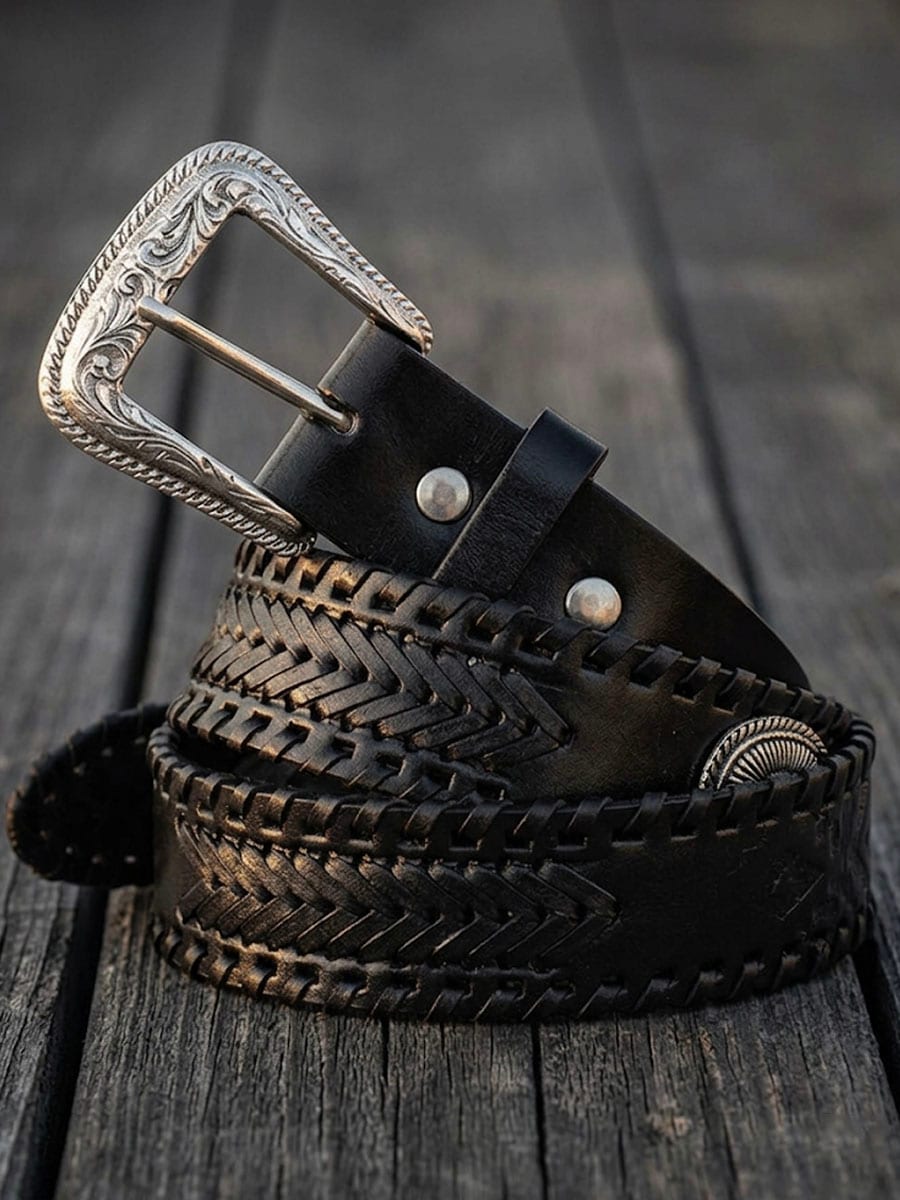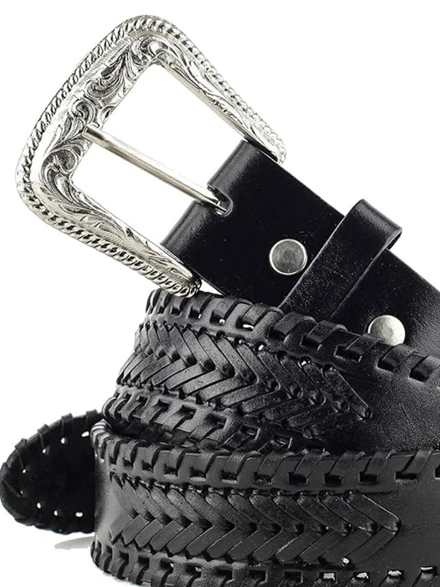 Laadukas western-vyö paksusta naudannahasta, jossa on punottuja yksityiskohtia ja koristeellisia elementtejä, jotka luovat klassisen cowboy-ilmeen. Tyylikäs solki on vaihdettavissa, mikä tekee vyöstä helpon yhdistää lähes mihin tahansa vyönsolkeen.