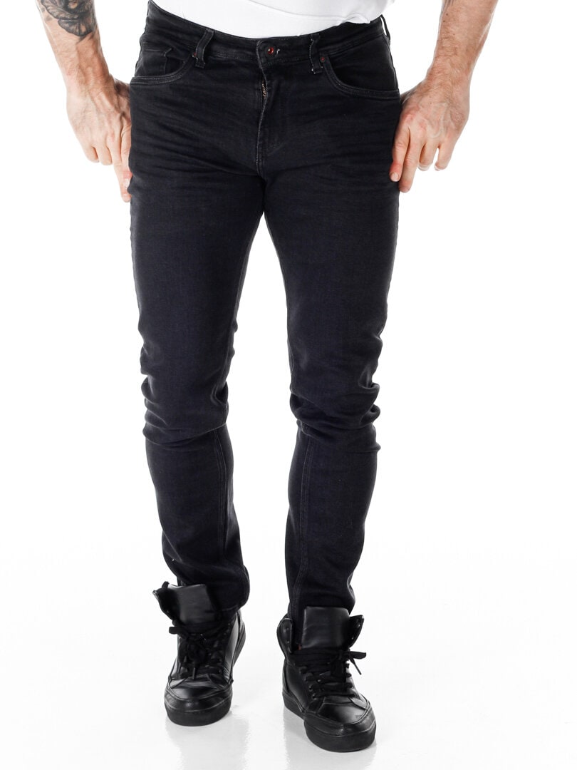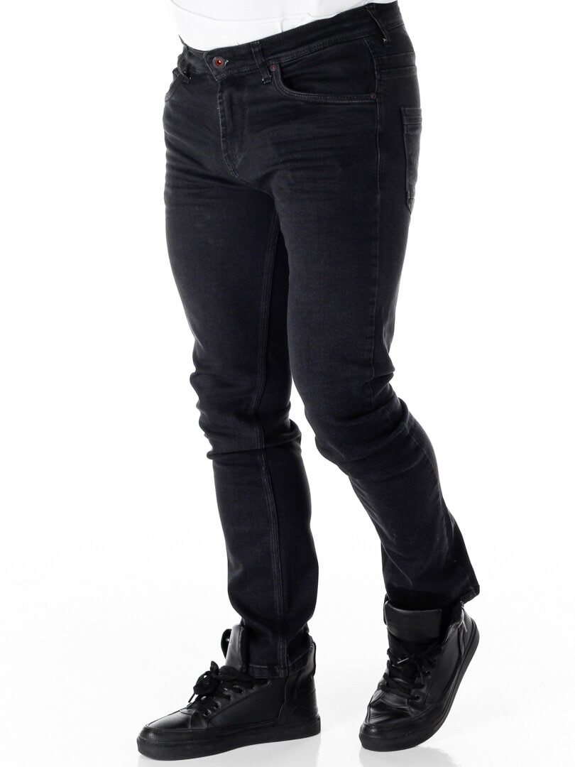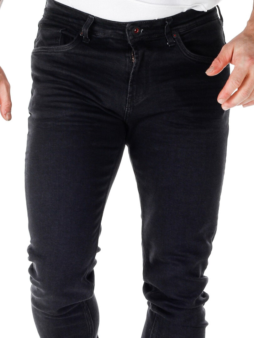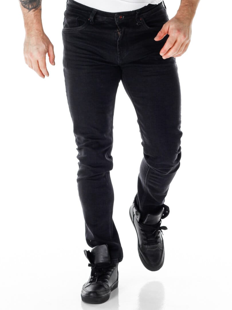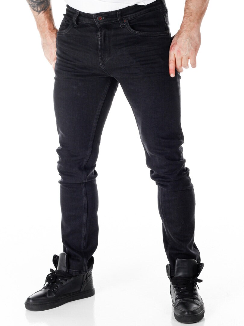 Tummanharmaat/mustat farkut runsaalla joustavuudella. Slim fit -malli, vetoketju sepaluksessa. Kolme etutaskua ja kaksi takataskua.