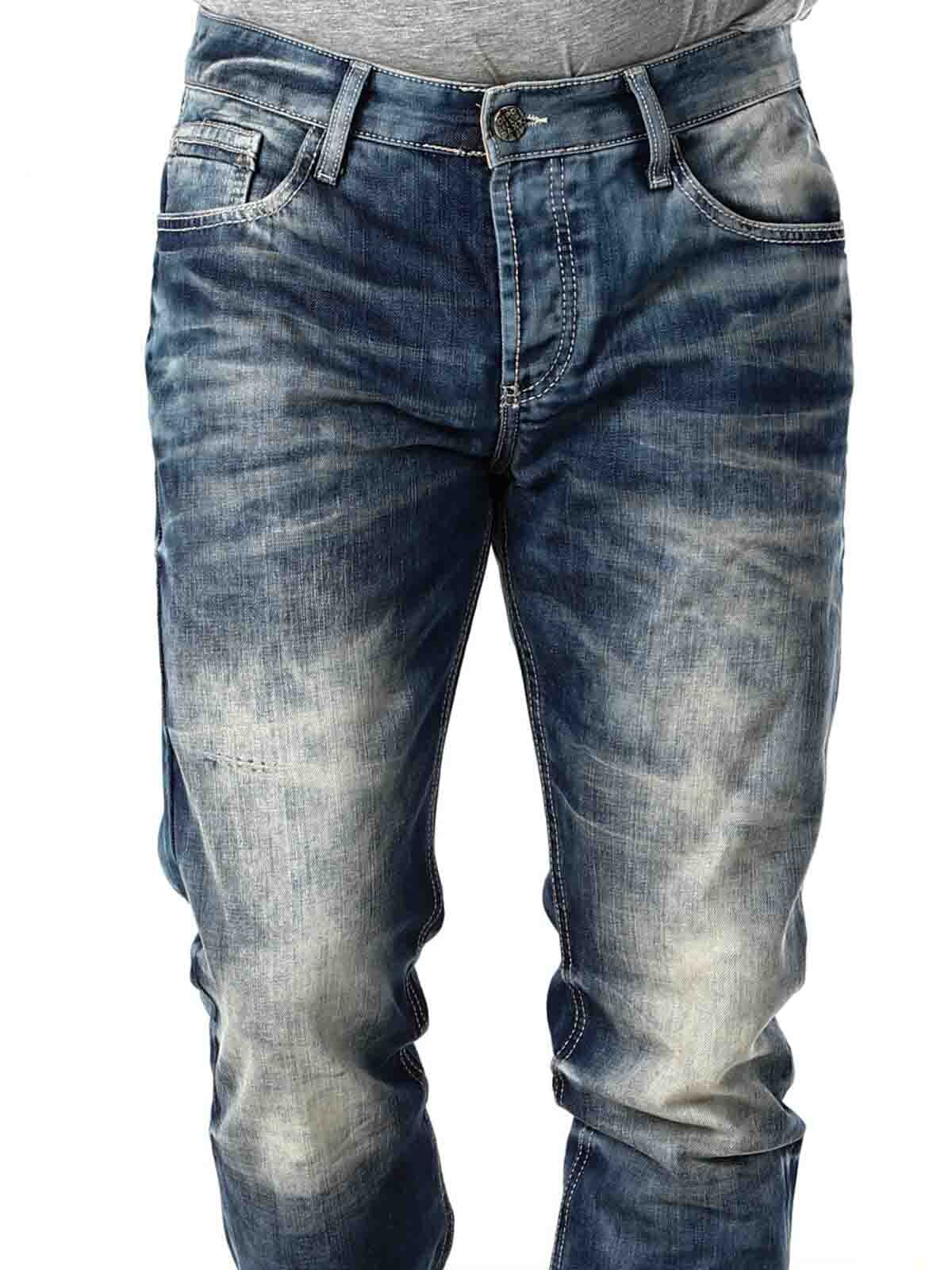 Siniset farkut kivipestyllä kulutuksella. Vyölenkit vyötäröllä, viisi taskua ja pieni napillinen tasku yhdessä takataskussa. Yksityiskohtana kontrastiväriset ompeleet.