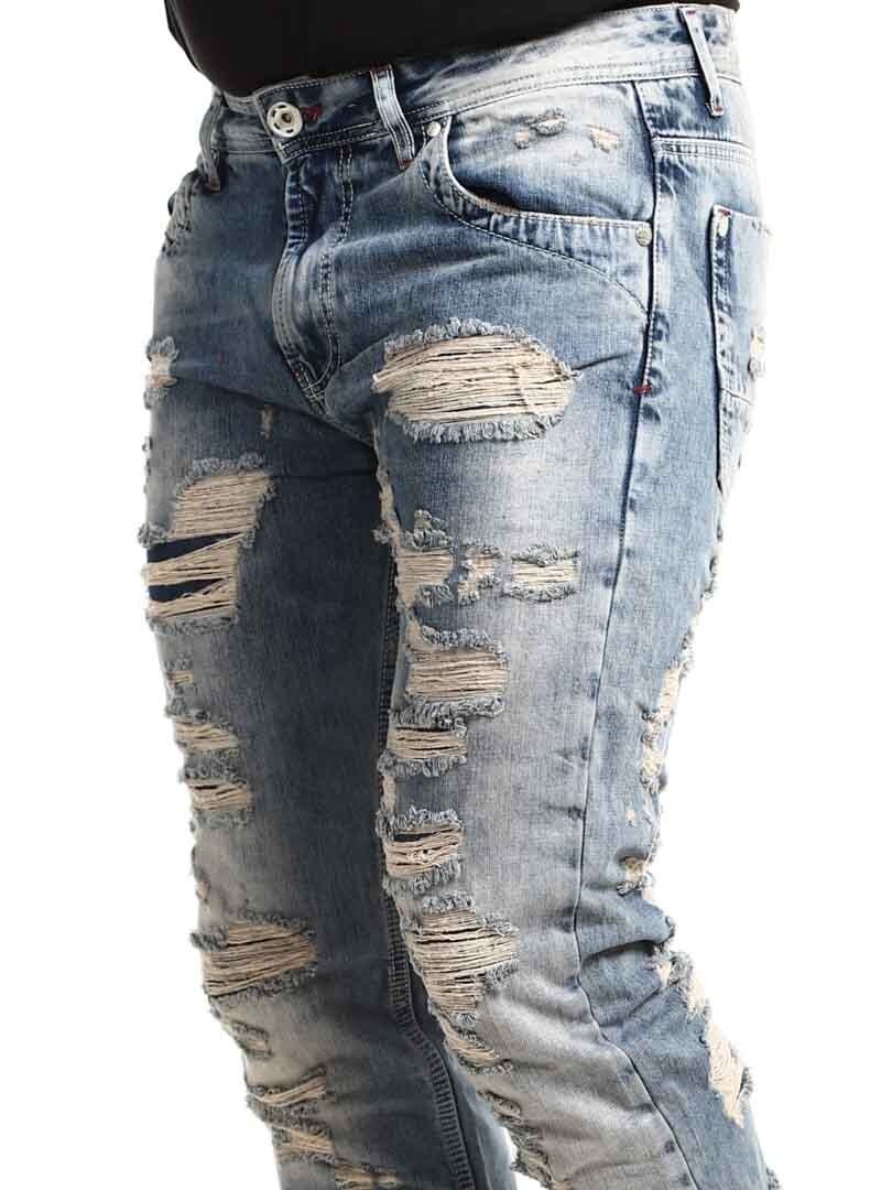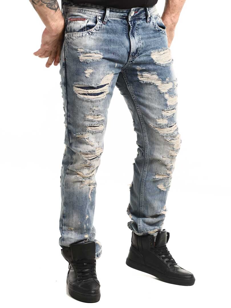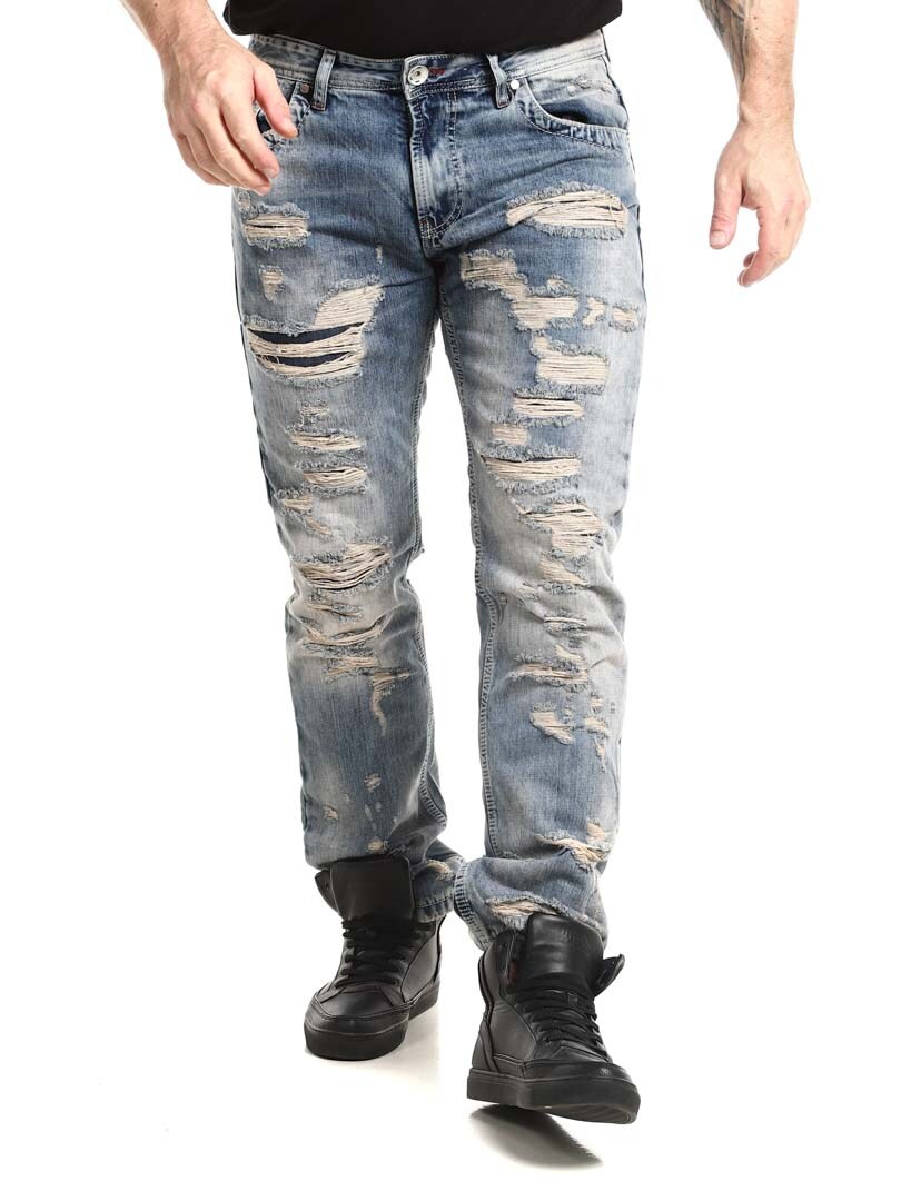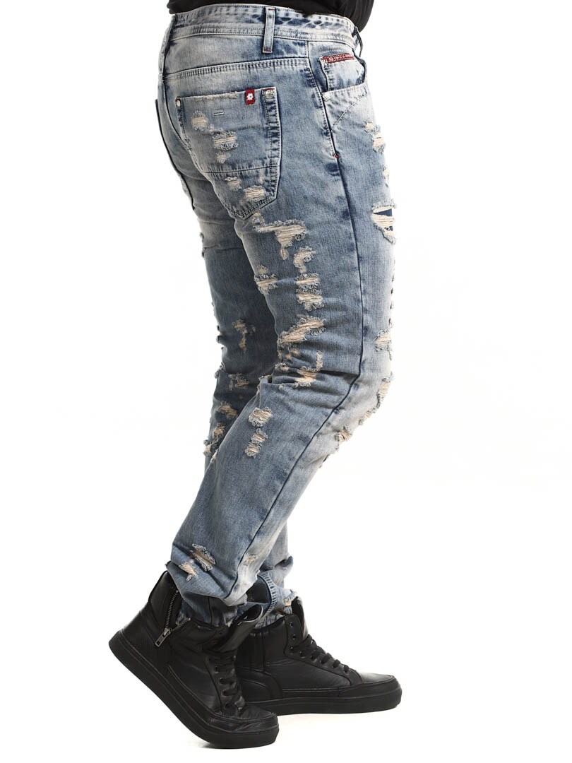 Päheät farkut, joissa on yksityiskohtina runsaasti kulutuksia edessä ja takana. Viisi taskua, vyölenkit vyötäröllä ja kontrastiväriset saumat. Valmistettu 100% puuvillasta.