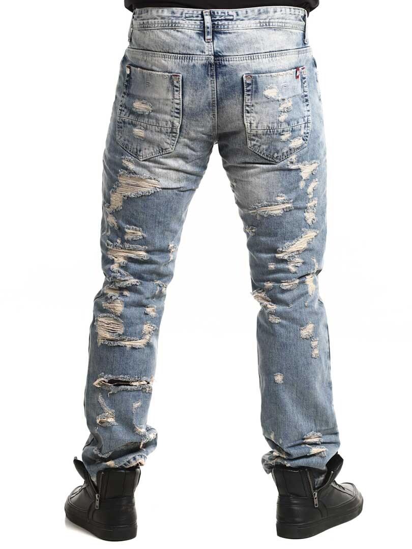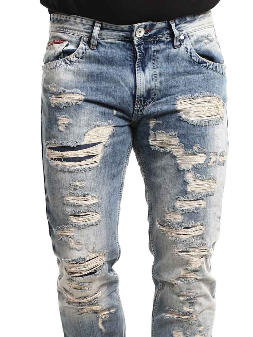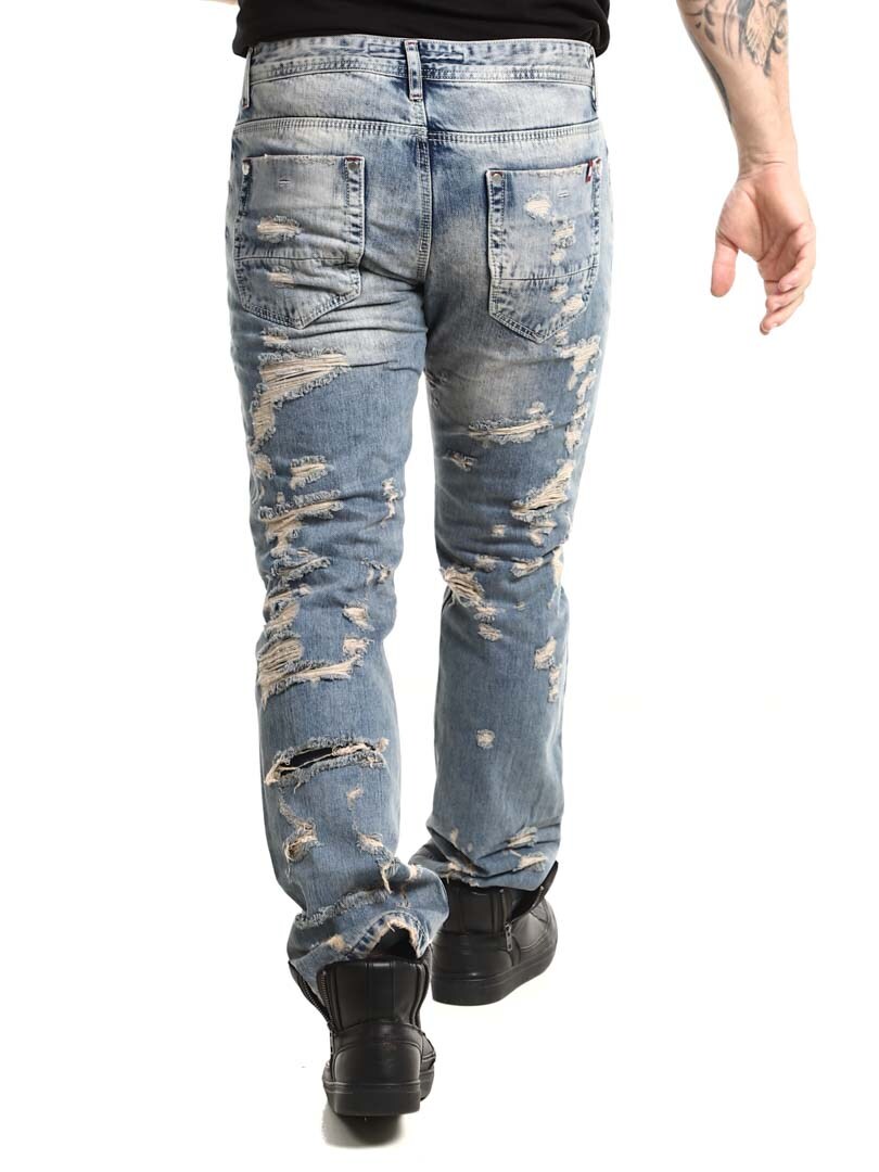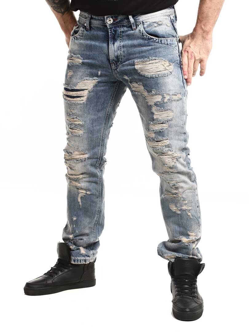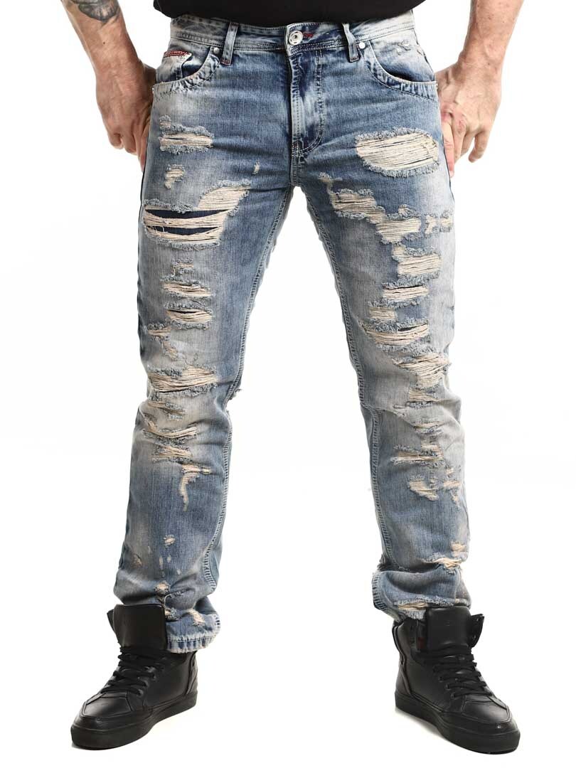 Päheät farkut, joissa on yksityiskohtina runsaasti kulutuksia edessä ja takana. Viisi taskua, vyölenkit vyötäröllä ja kontrastiväriset saumat. Valmistettu 100% puuvillasta.