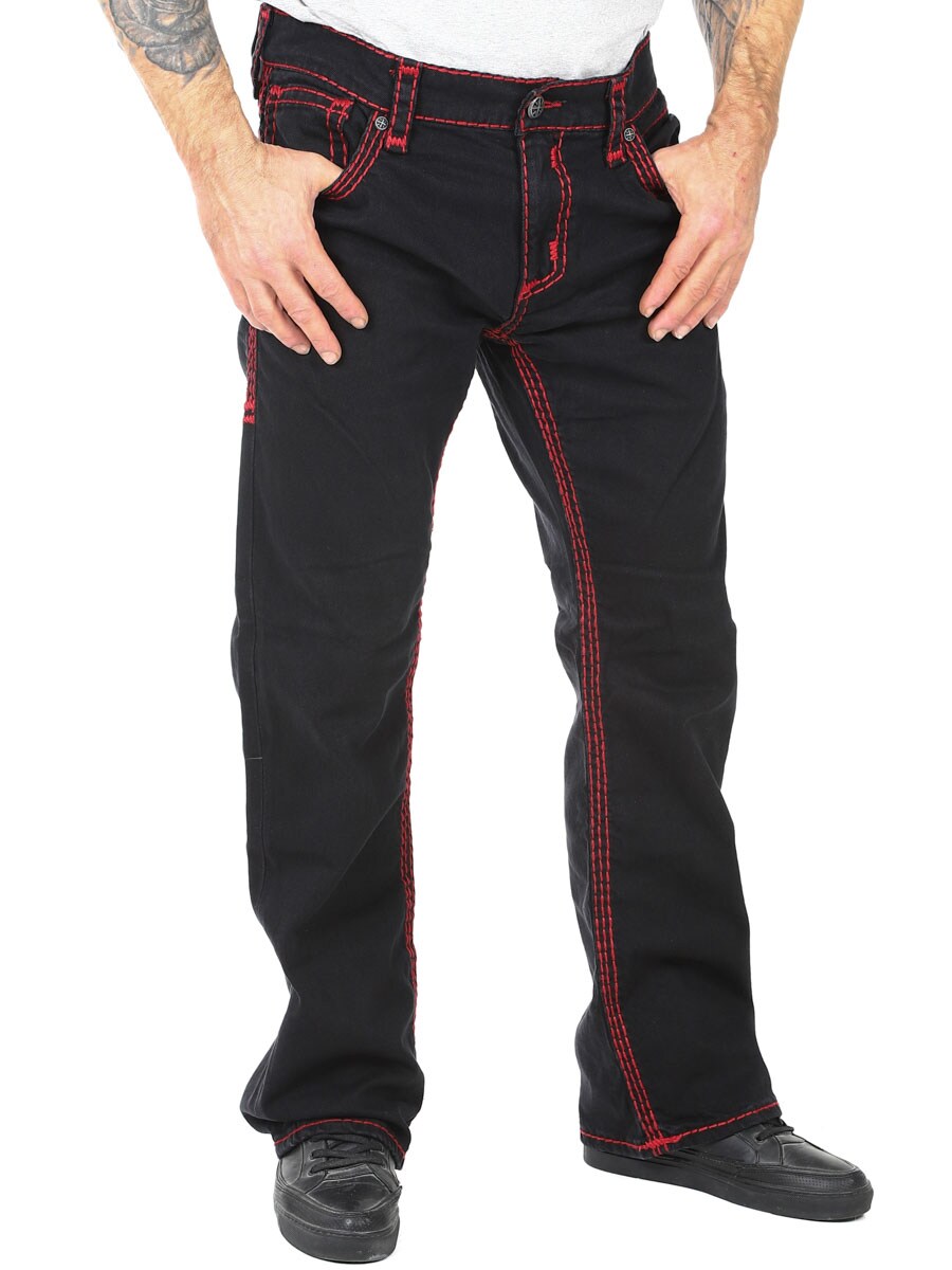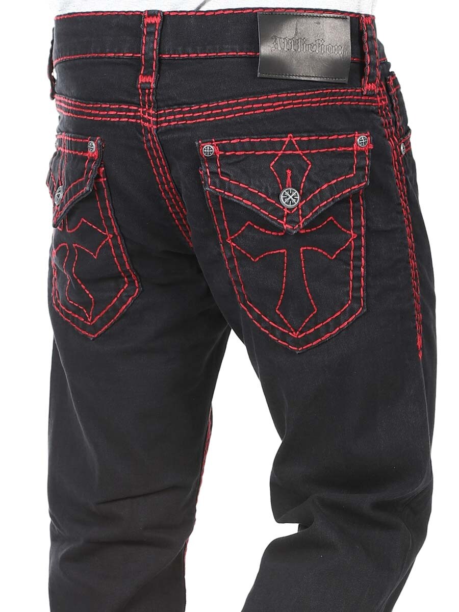 Näissä mustissa farkuissa on voimakkaat punaiset kontrastitikkaukset, jotka luovat uniikin ja rock-henkisen ilmeen. Istuvuus on hieman rennompi, mikä antaa mukavan ja huolettoman siluetin. Takataskuja koristavat suuret ristiyksityiskohdat selkeällä brodeerauksella – tunnusomainen piirre Afflictionin ikonisessa tyylissä. Erotu joukosta farkuilla, jotka todella näkyvät!